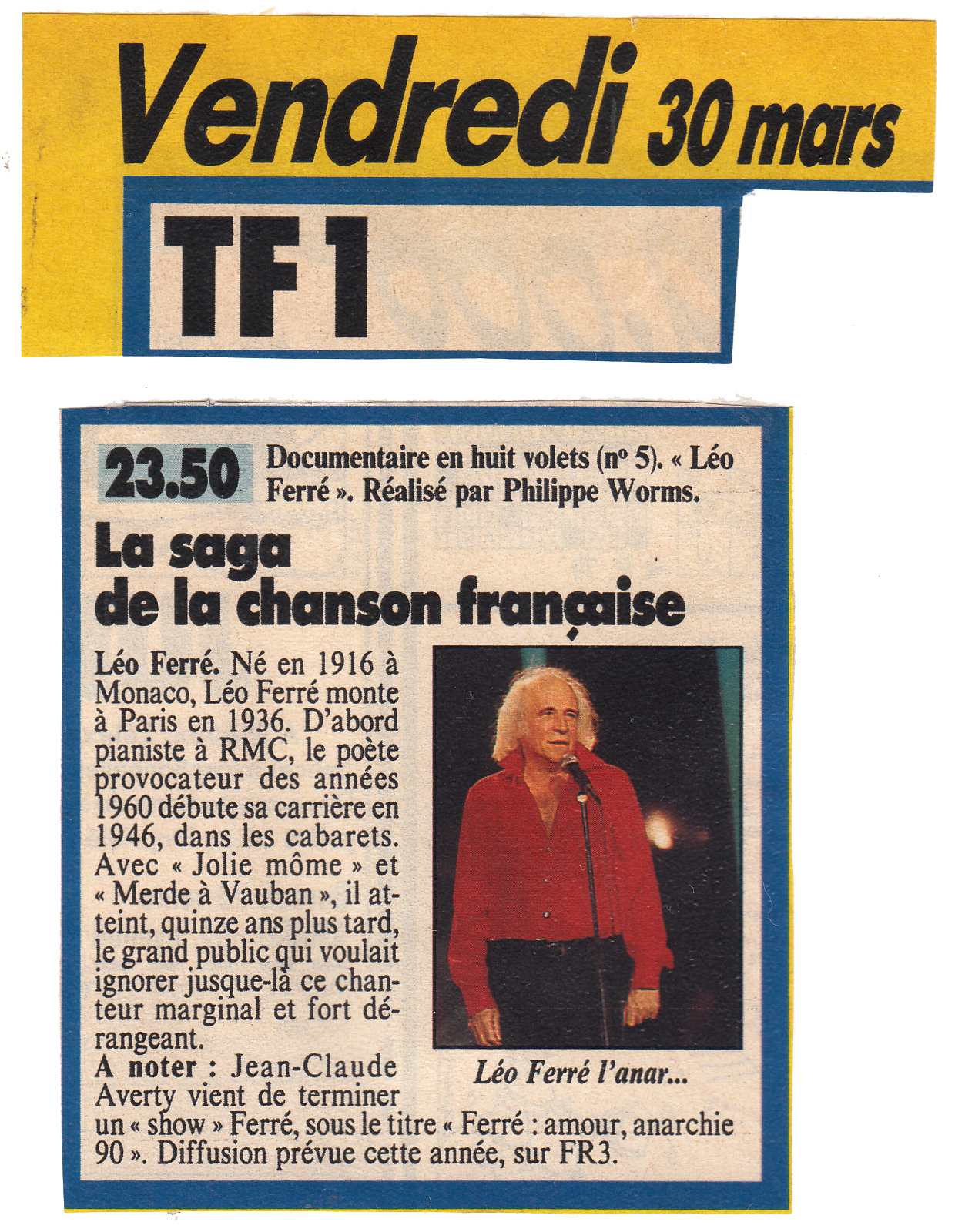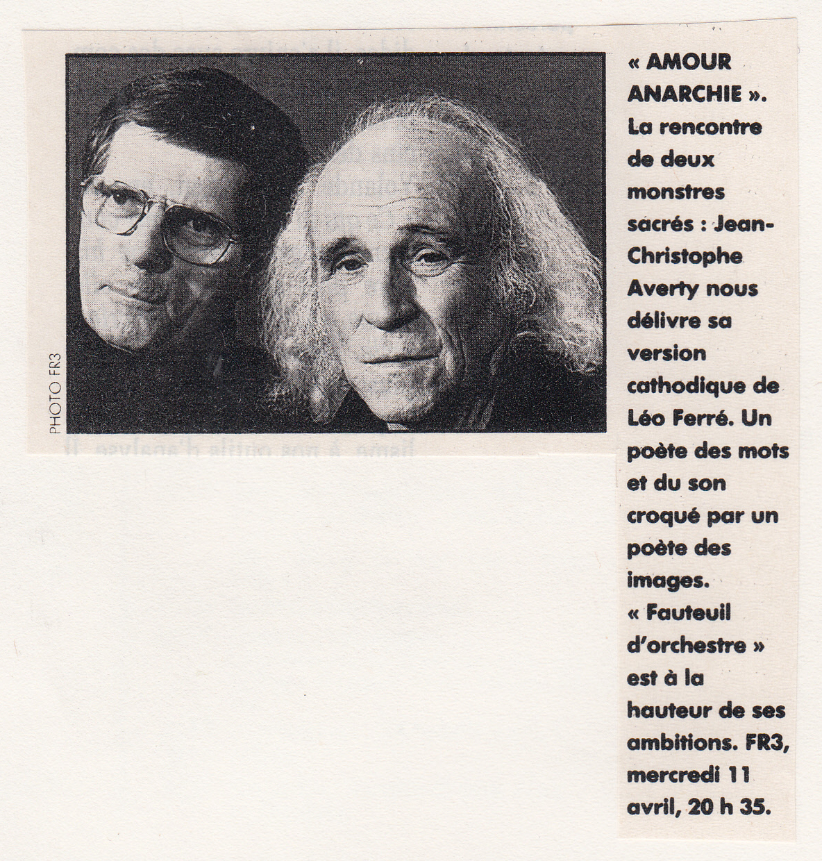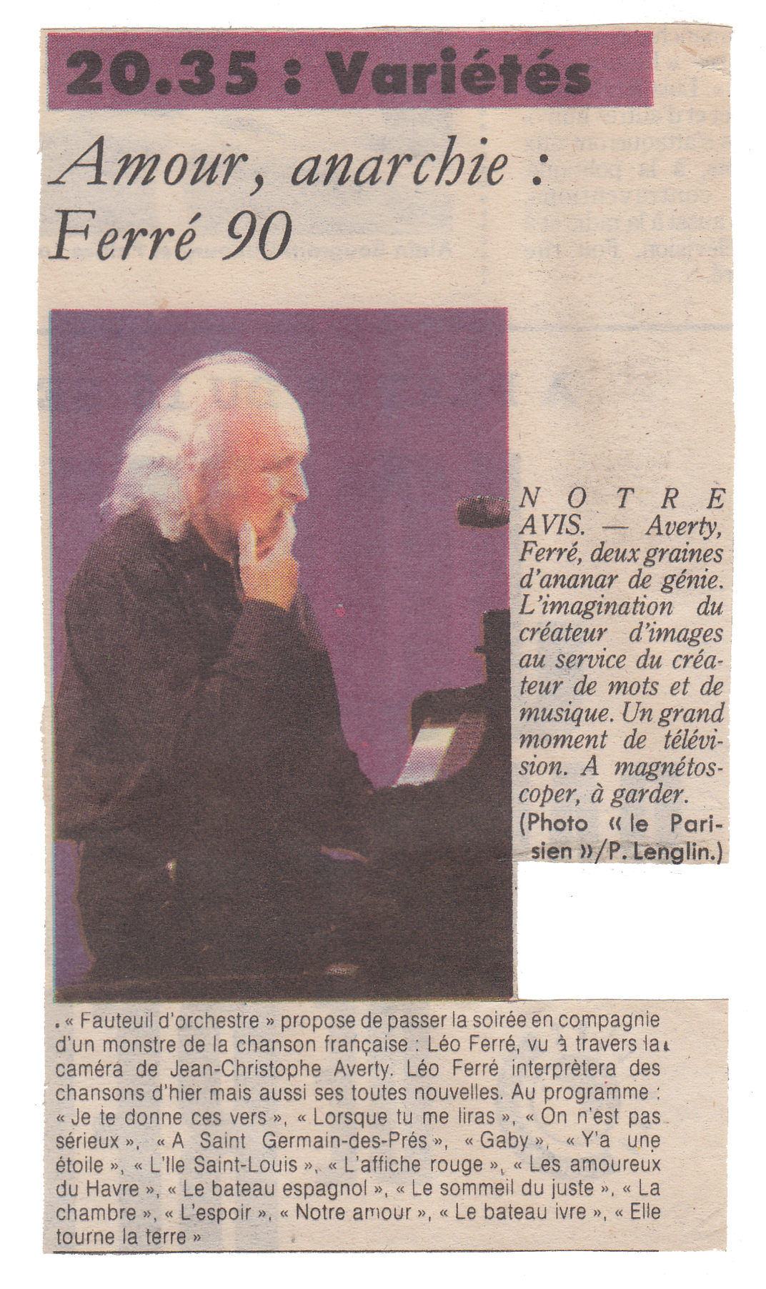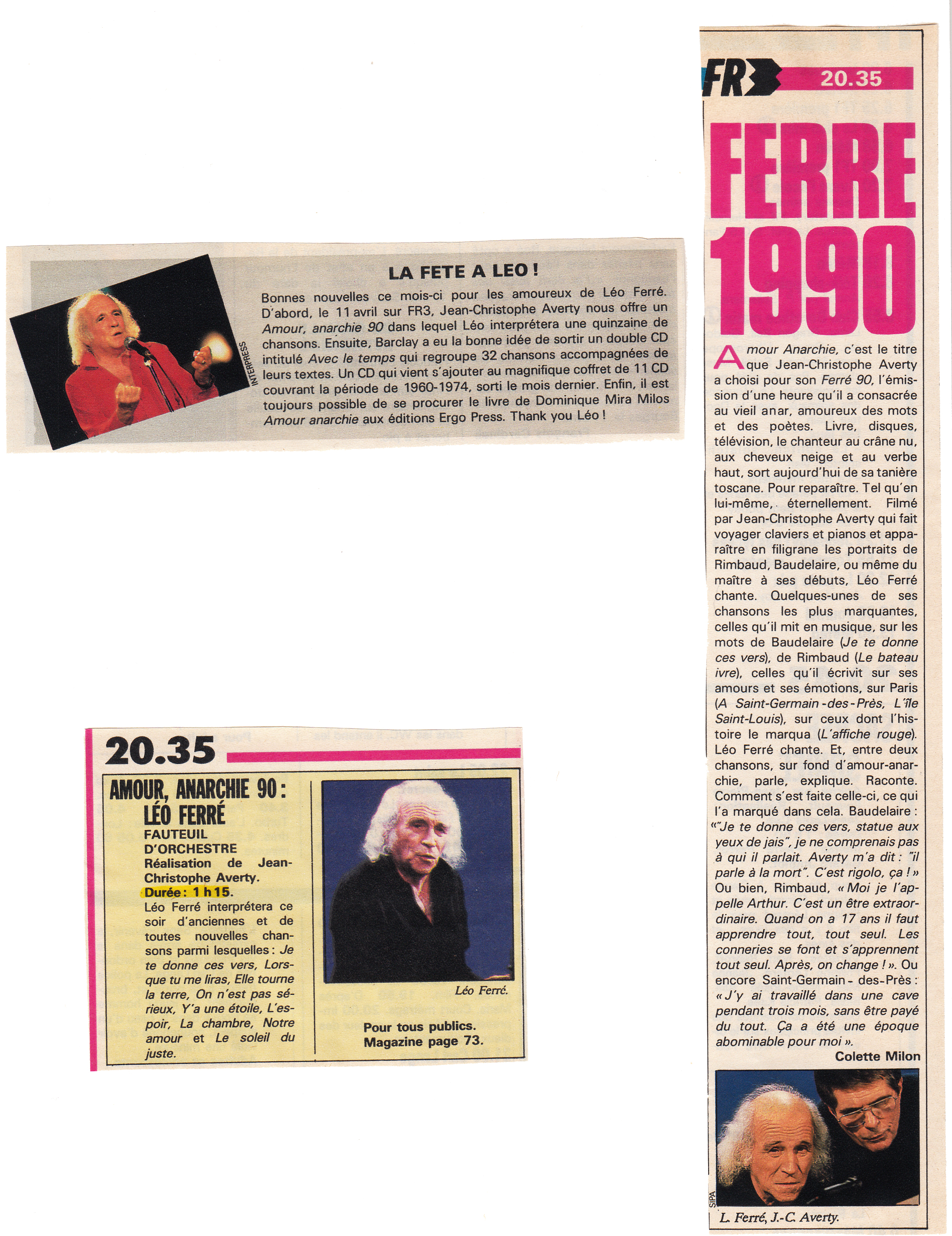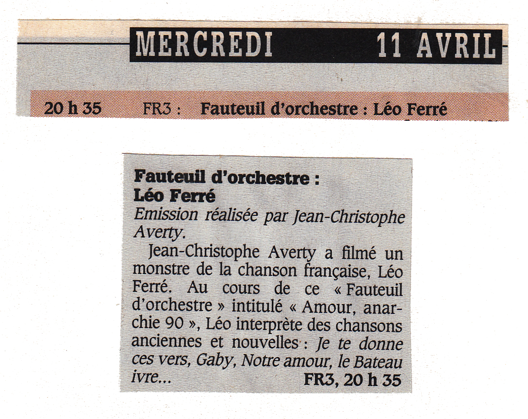 • MERCREDI 11 AVRIL AMOUR, ANARCHIE, LÉO FERRÉ 90 : FR 3, 20 h 35