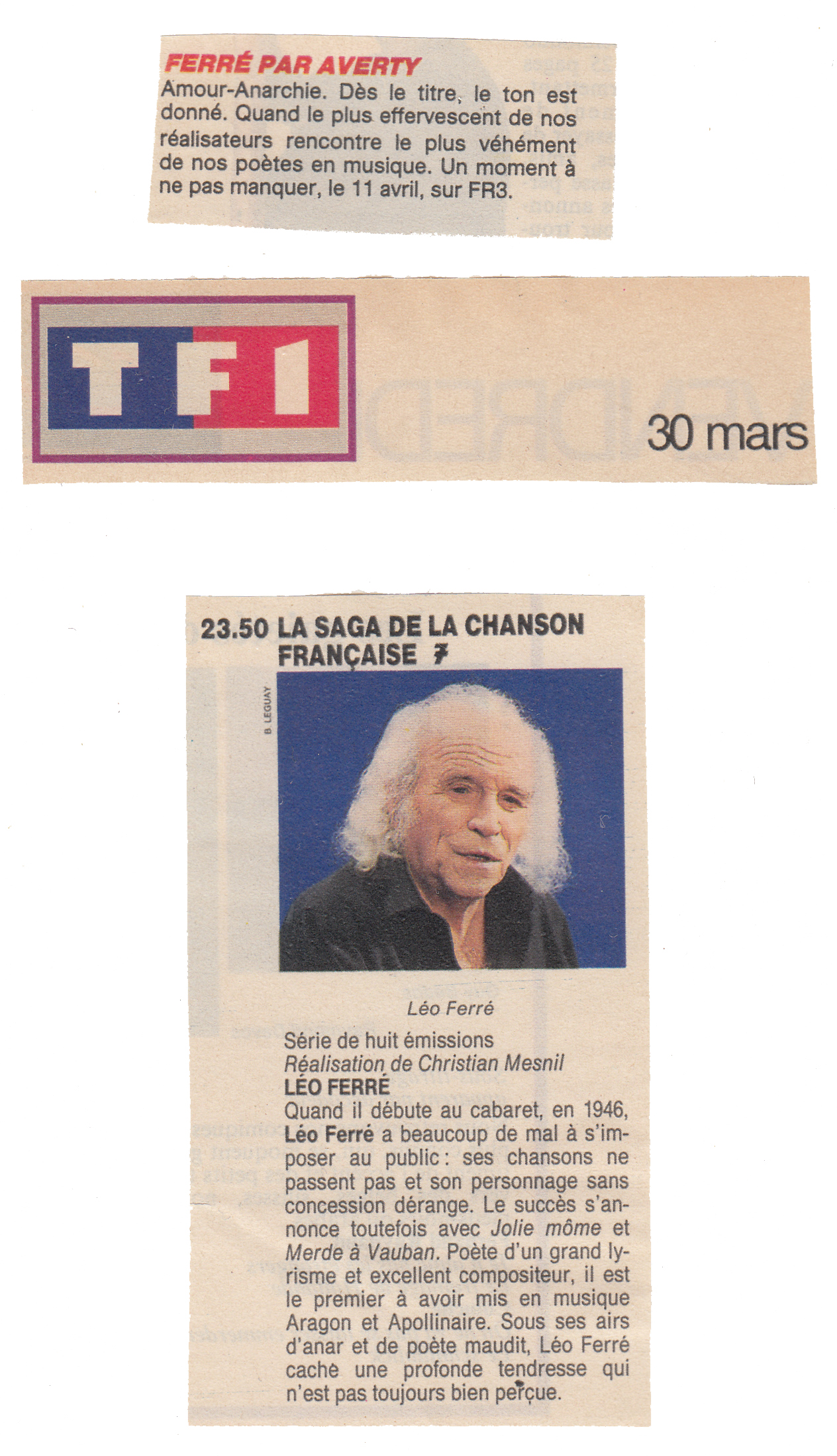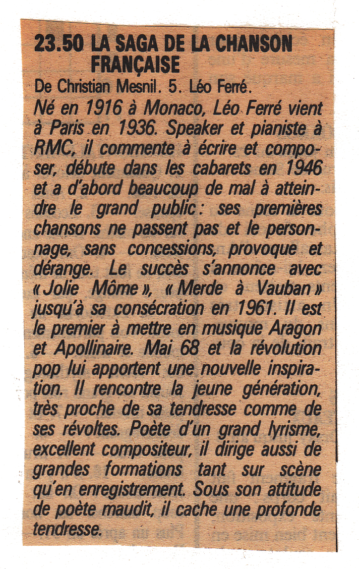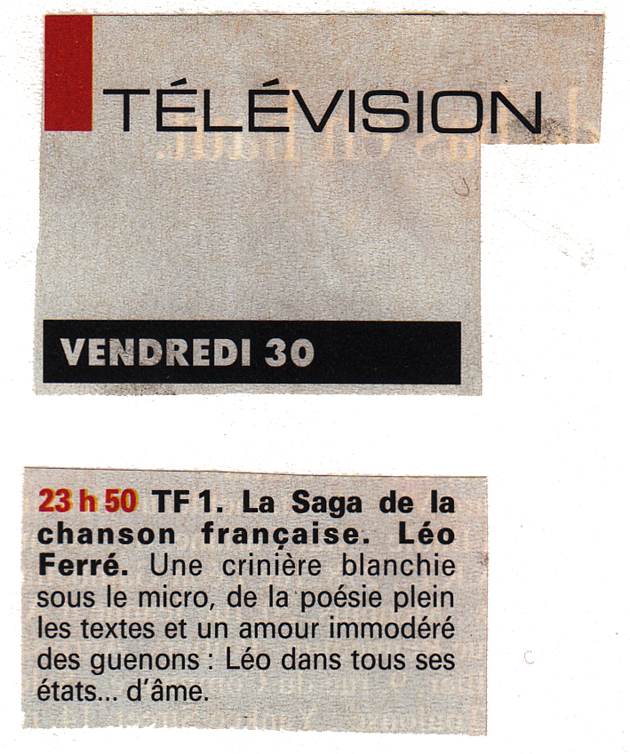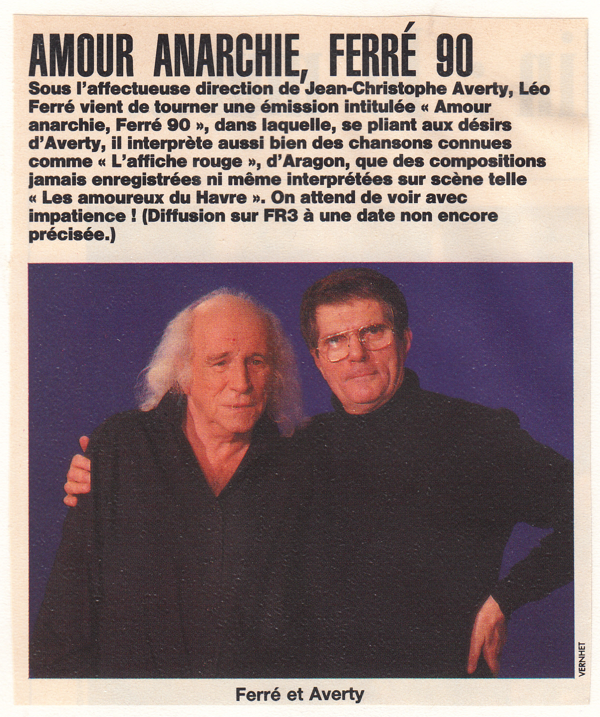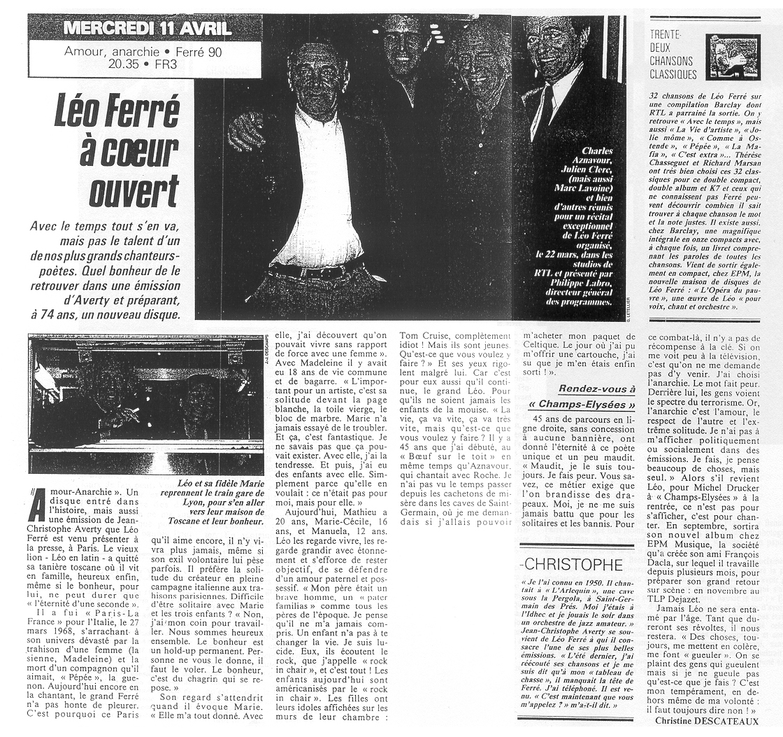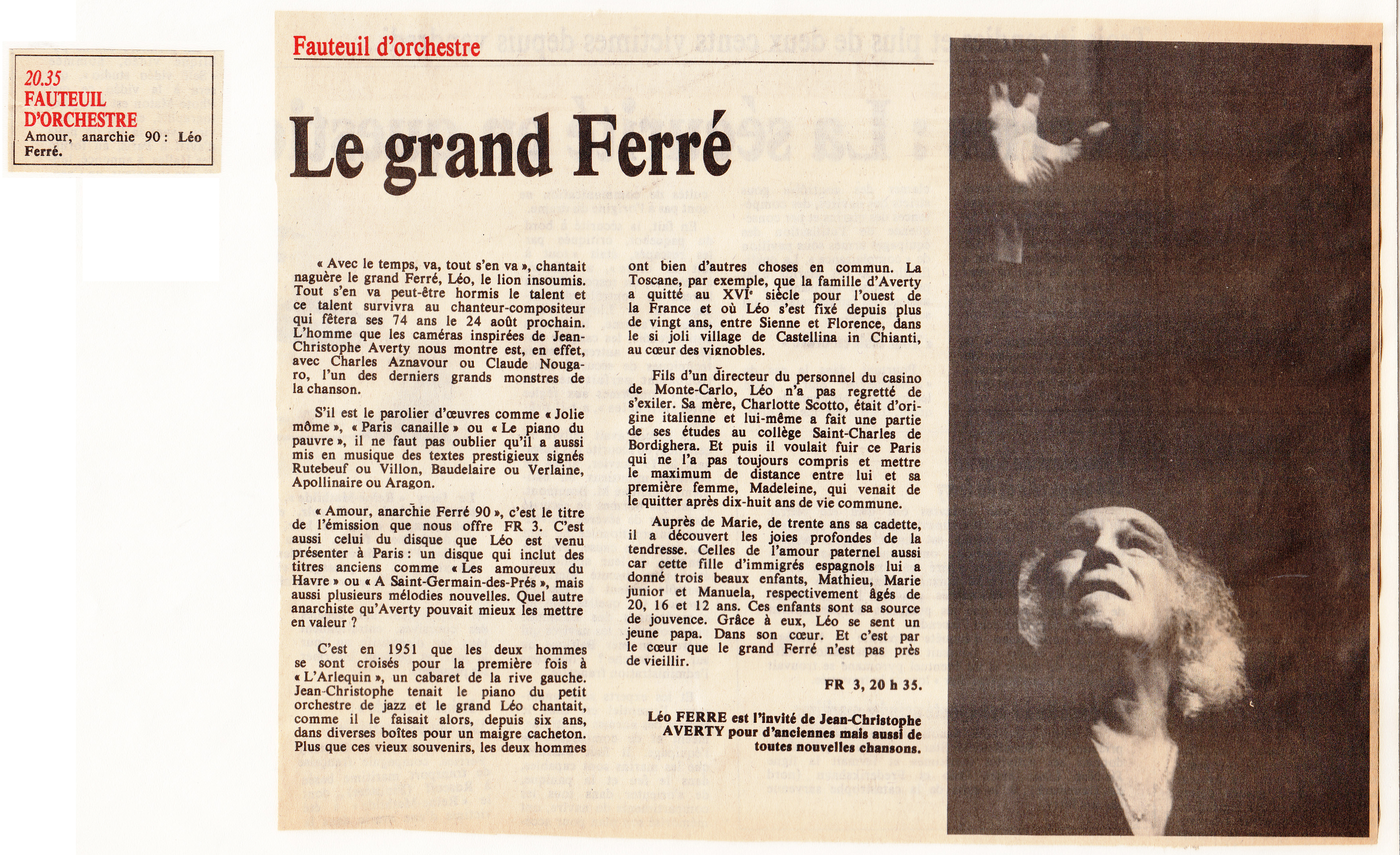• MERCREDI 11 AVRIL AMOUR, ANARCHIE, LÉO FERRÉ 90 : FR 3, 20 h 35