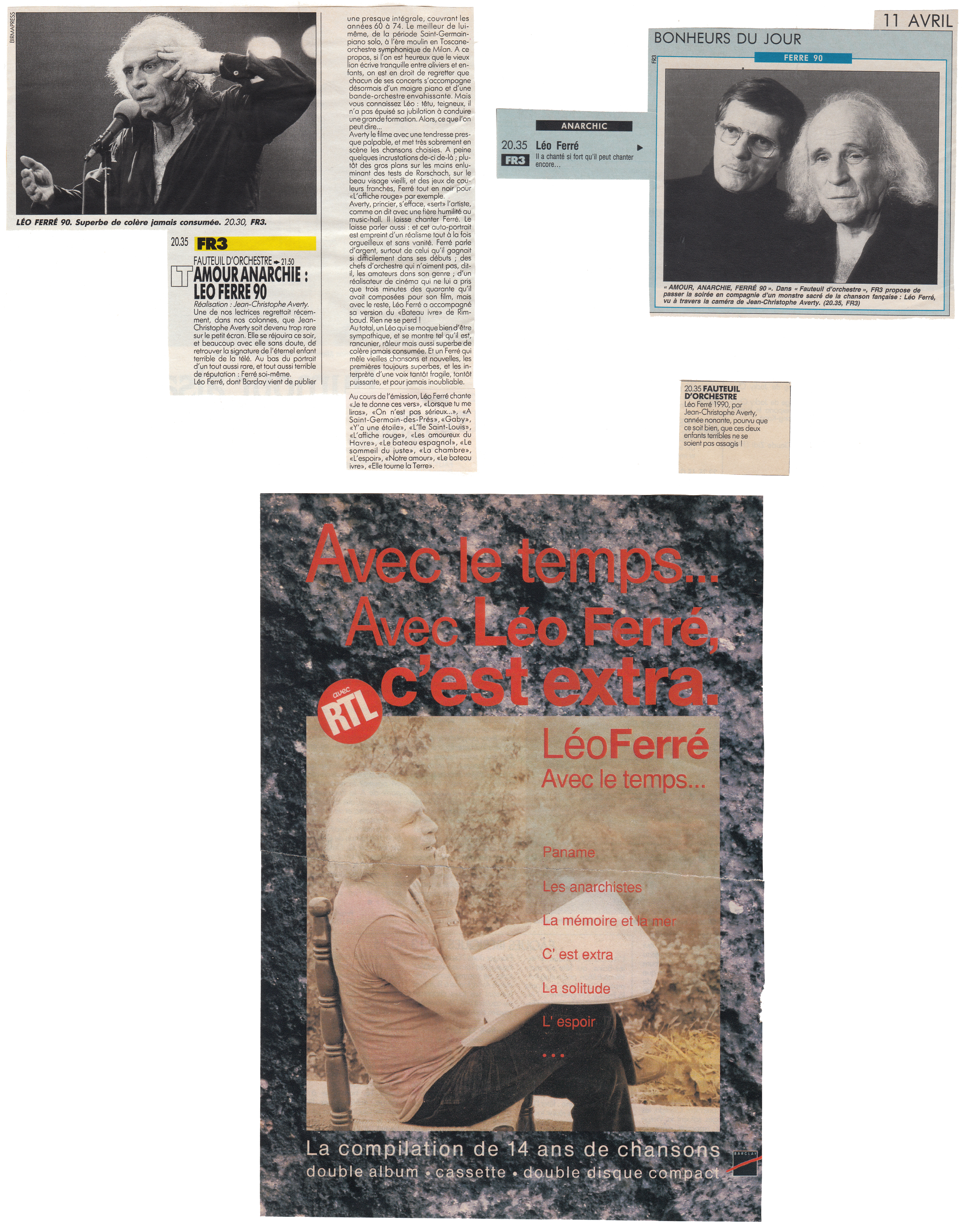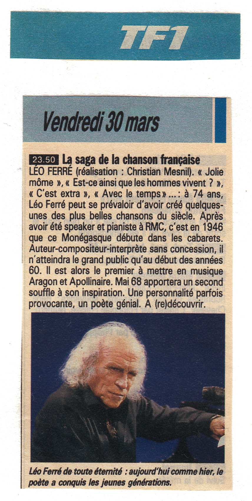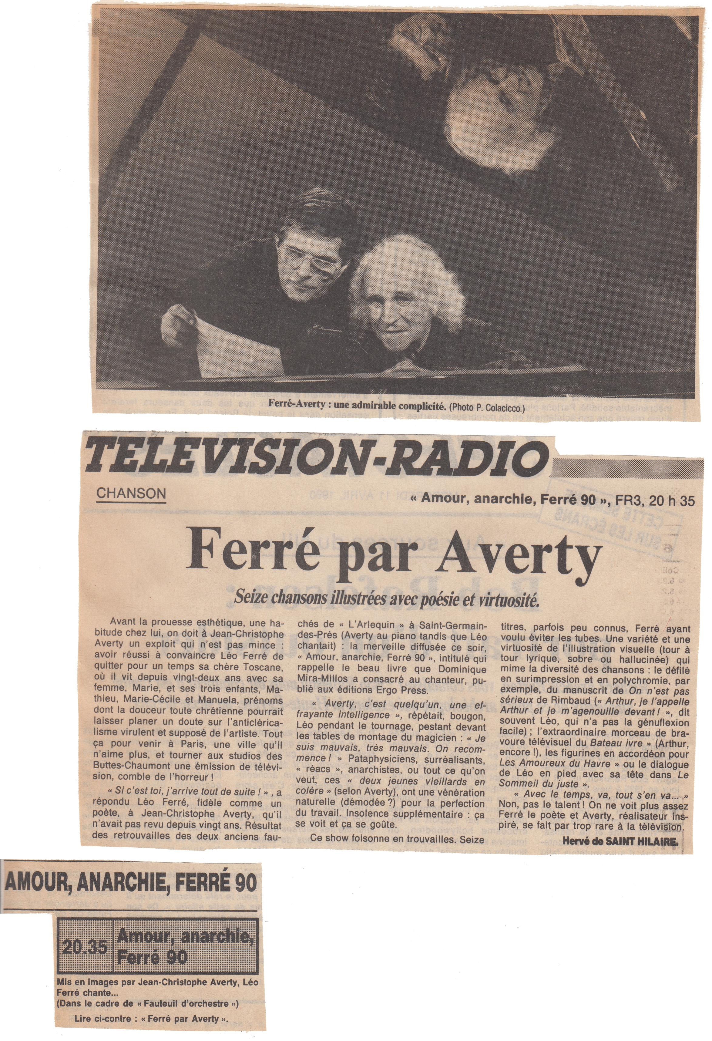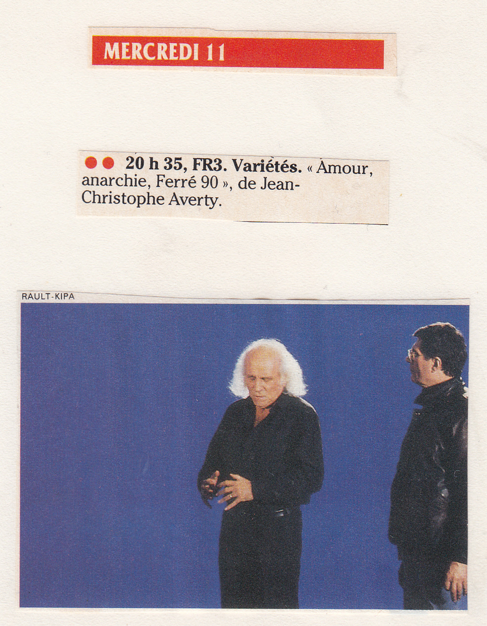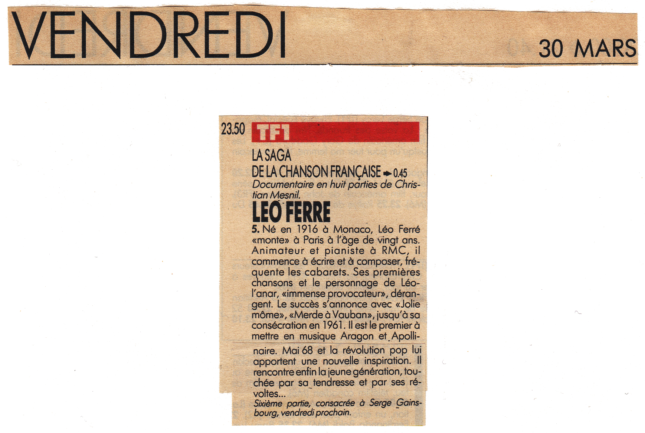 • MERCREDI 11 AVRIL AMOUR, ANARCHIE, LÉO FERRÉ 90 : FR 3, 20 h 35