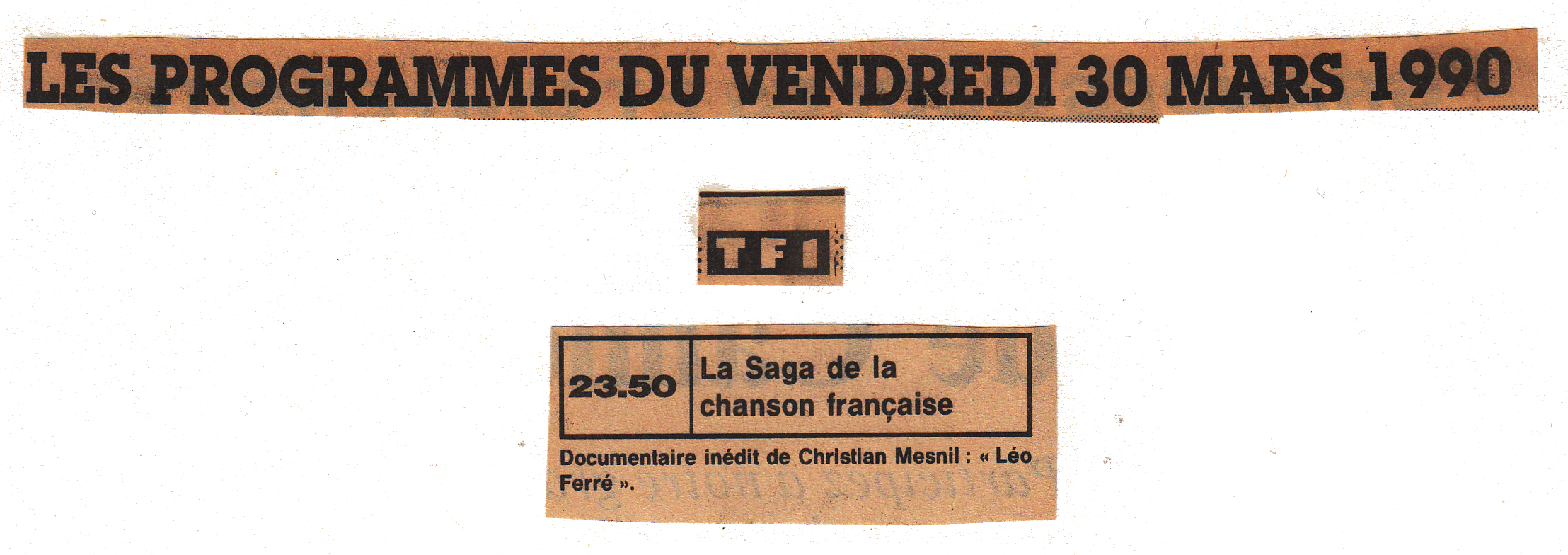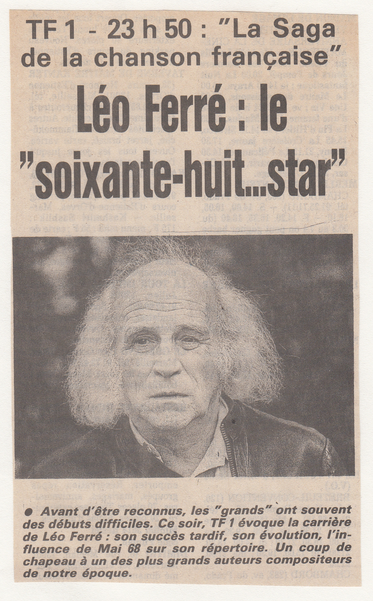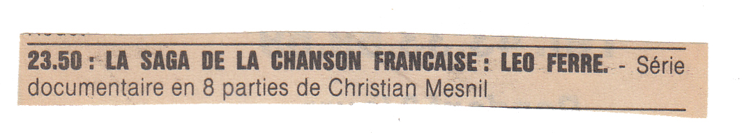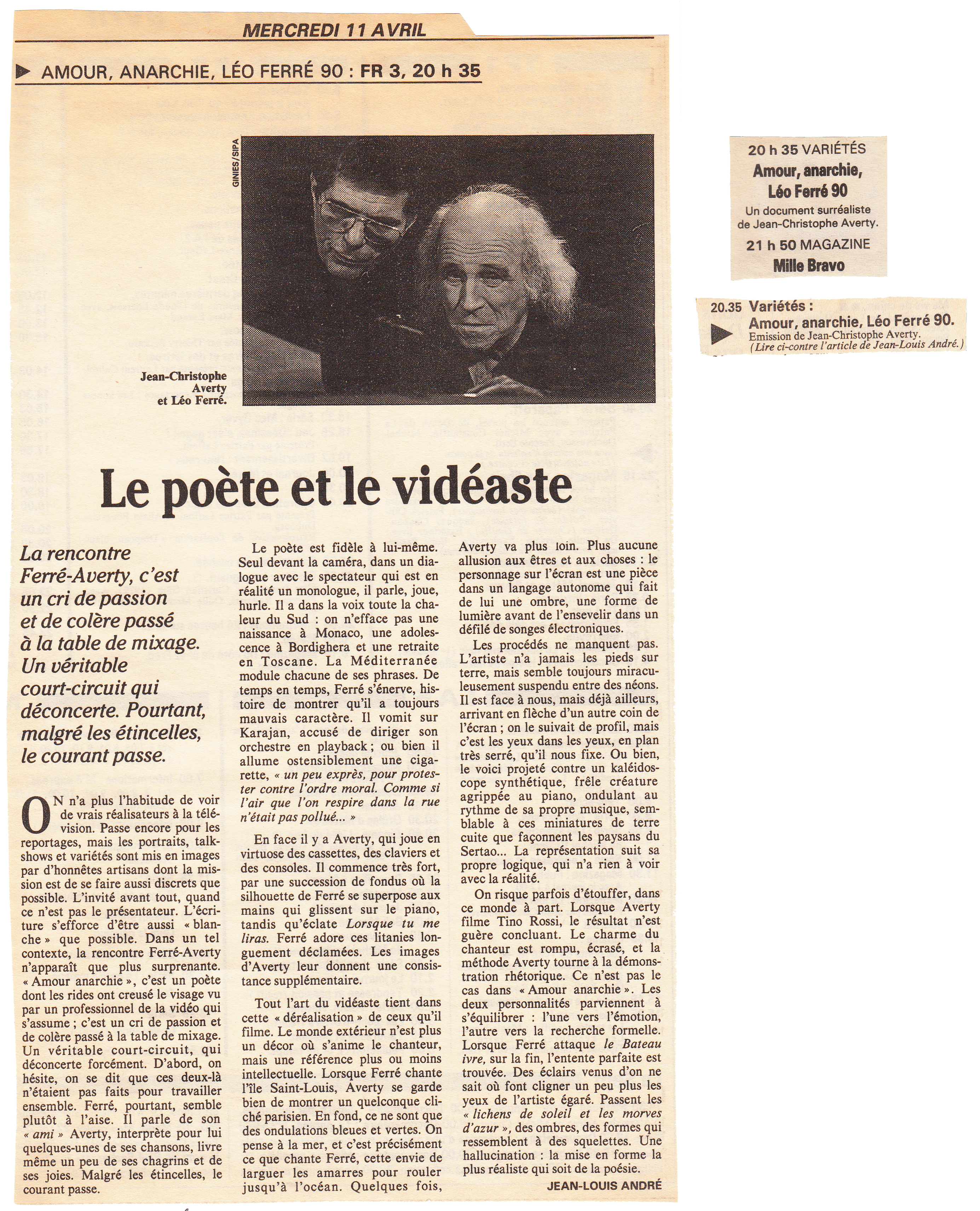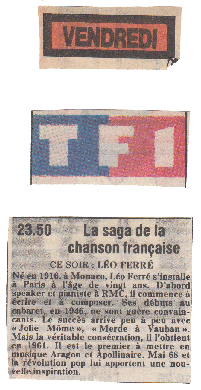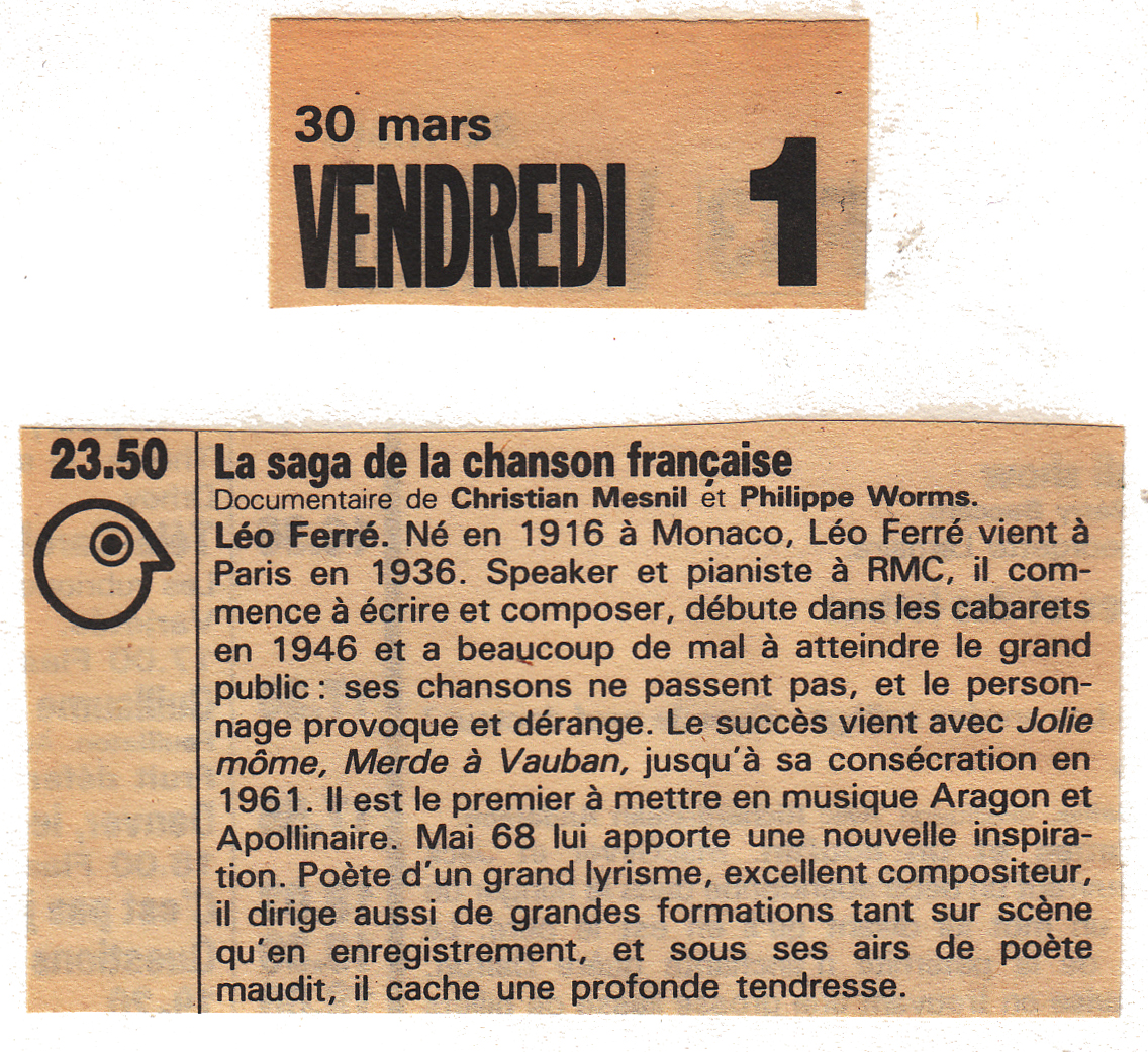 • MERCREDI 11 AVRIL AMOUR, ANARCHIE, LÉO FERRÉ 90 : FR 3, 20 h 35
