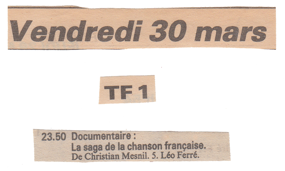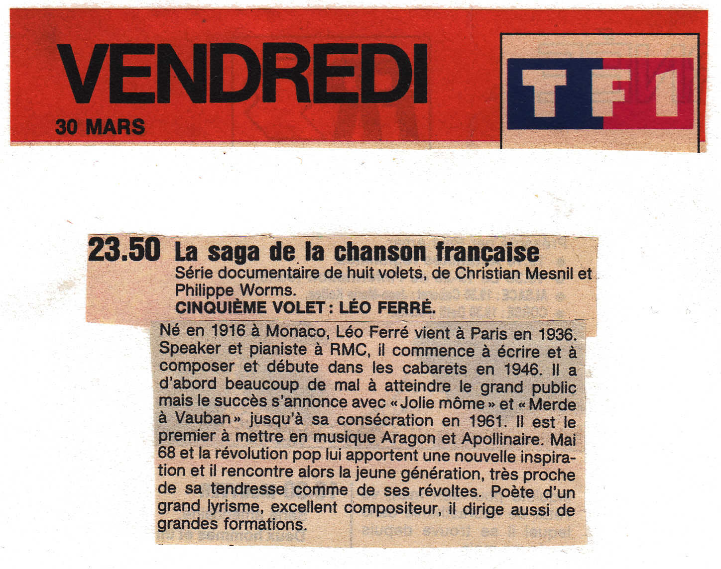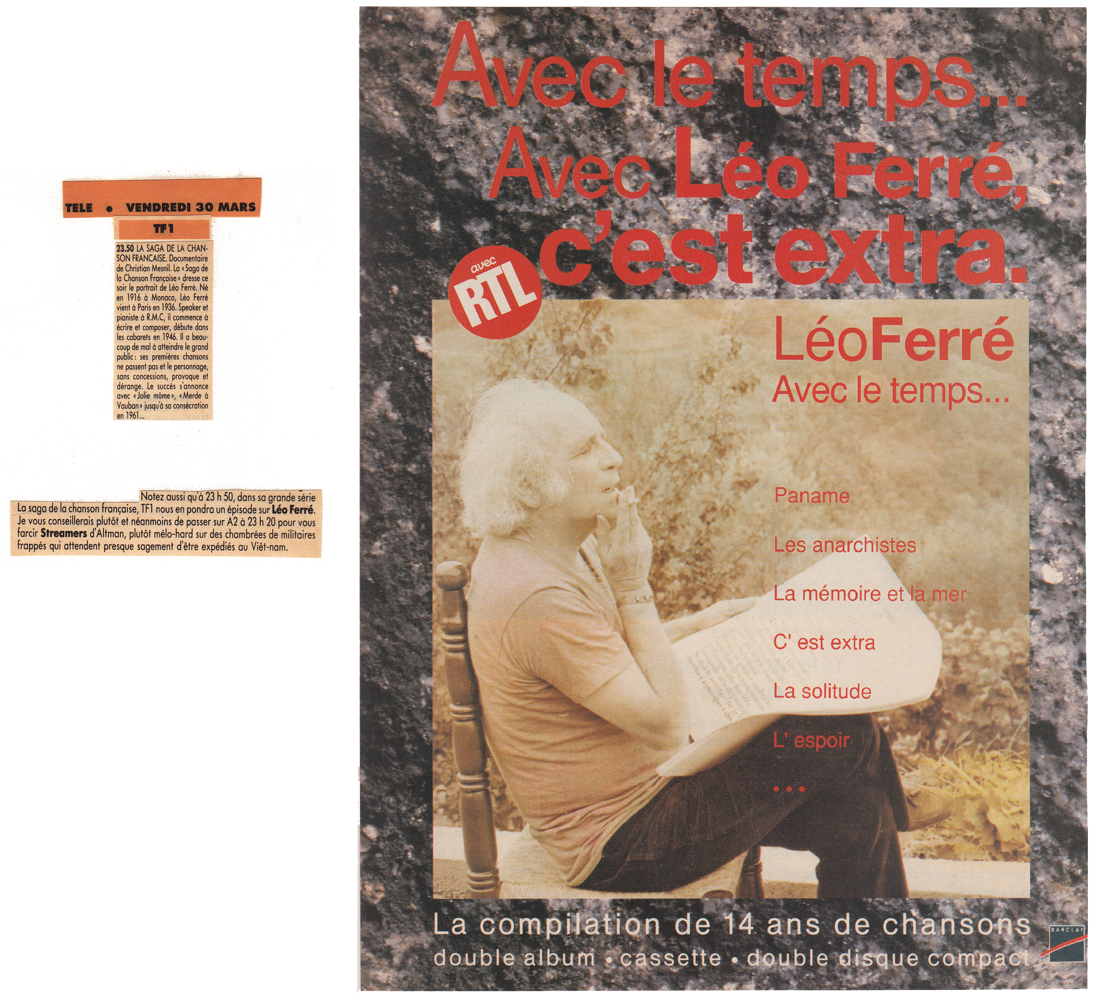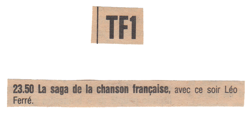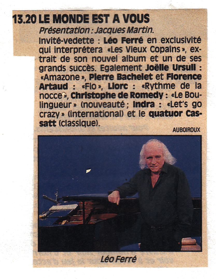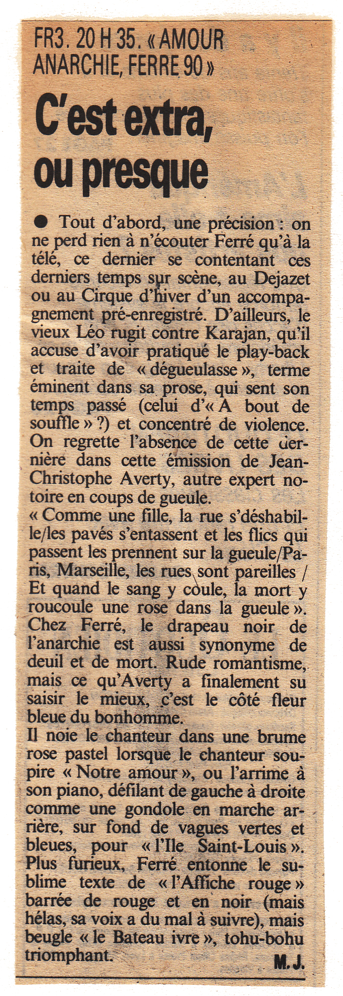 • MERCREDI 11 AVRIL AMOUR, ANARCHIE, LÉO FERRÉ 90 : FR 3, 20 h 35