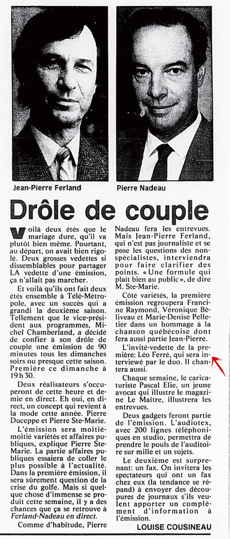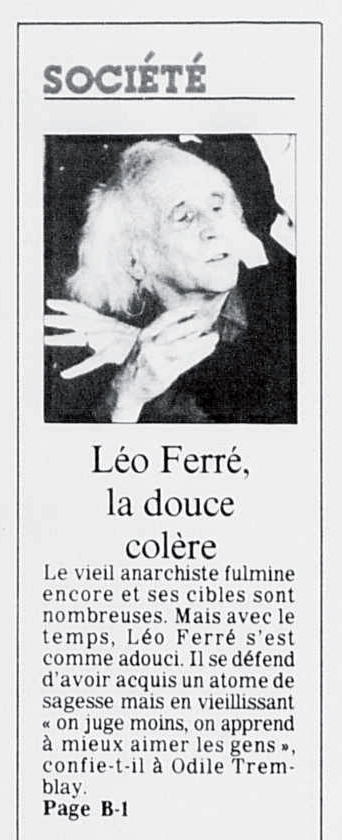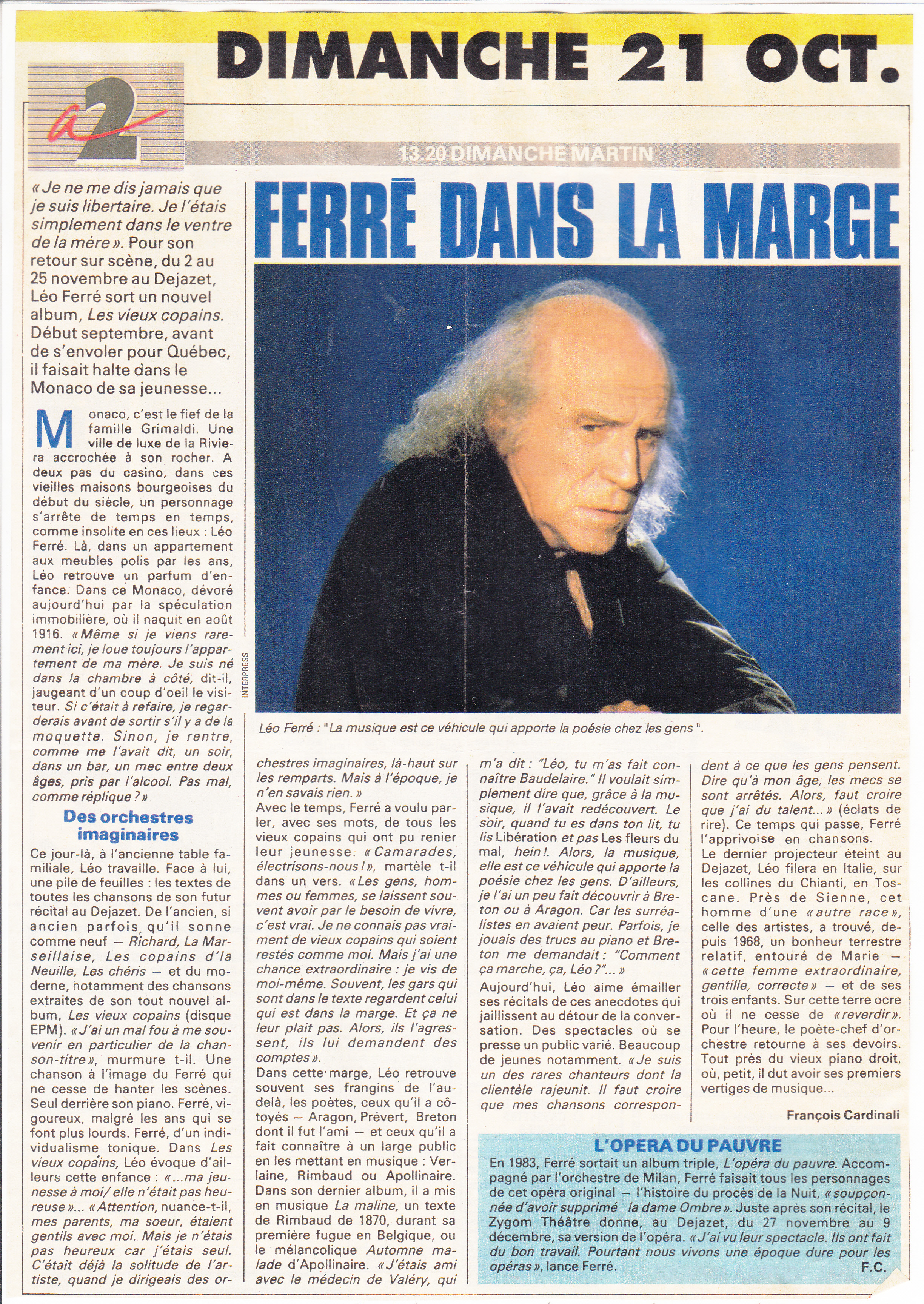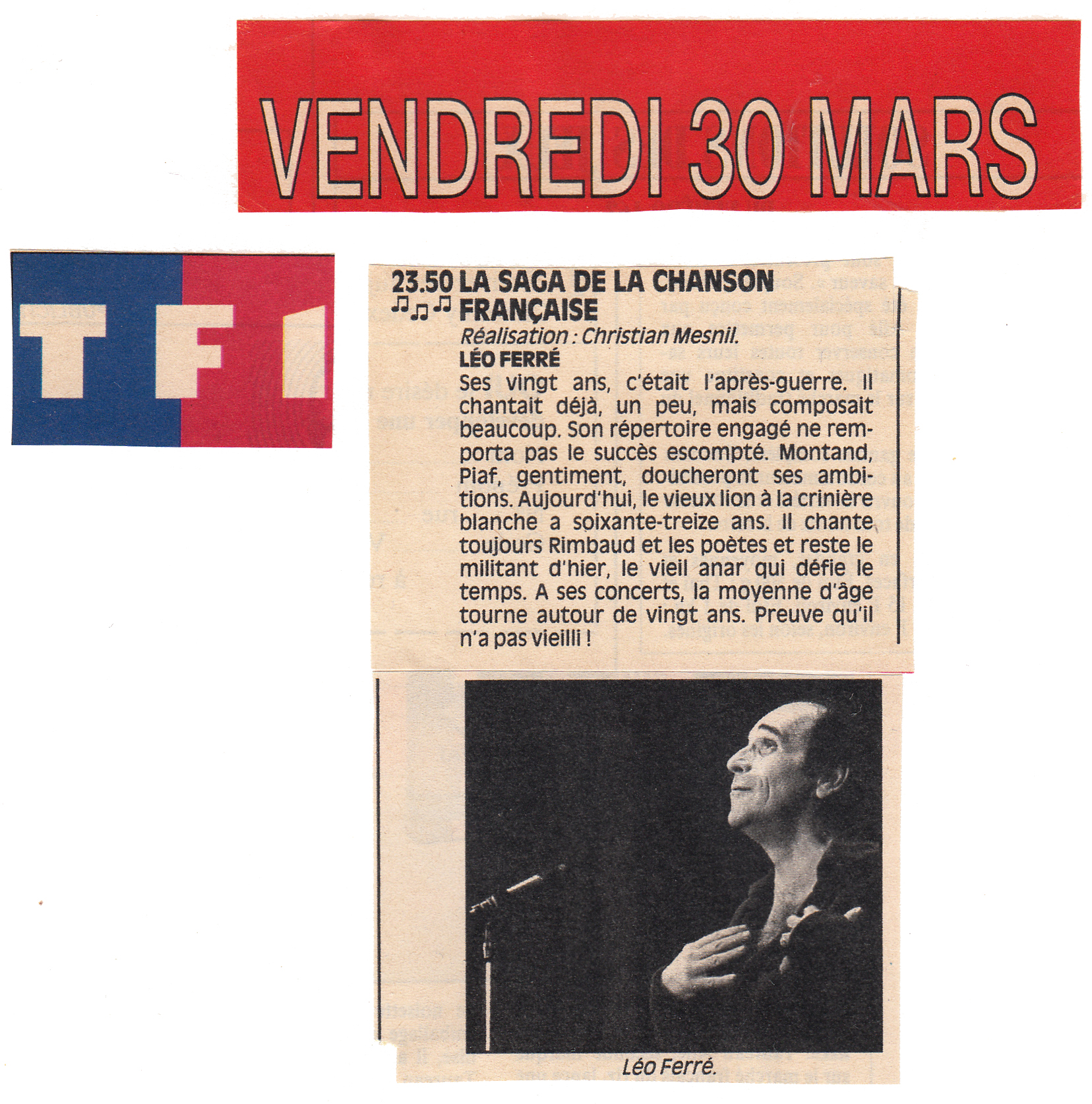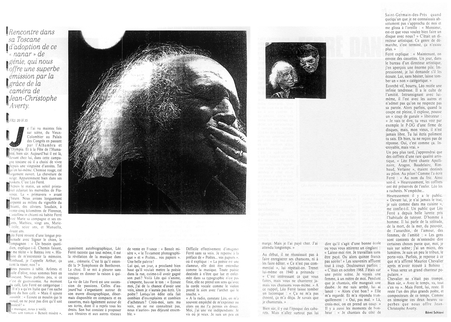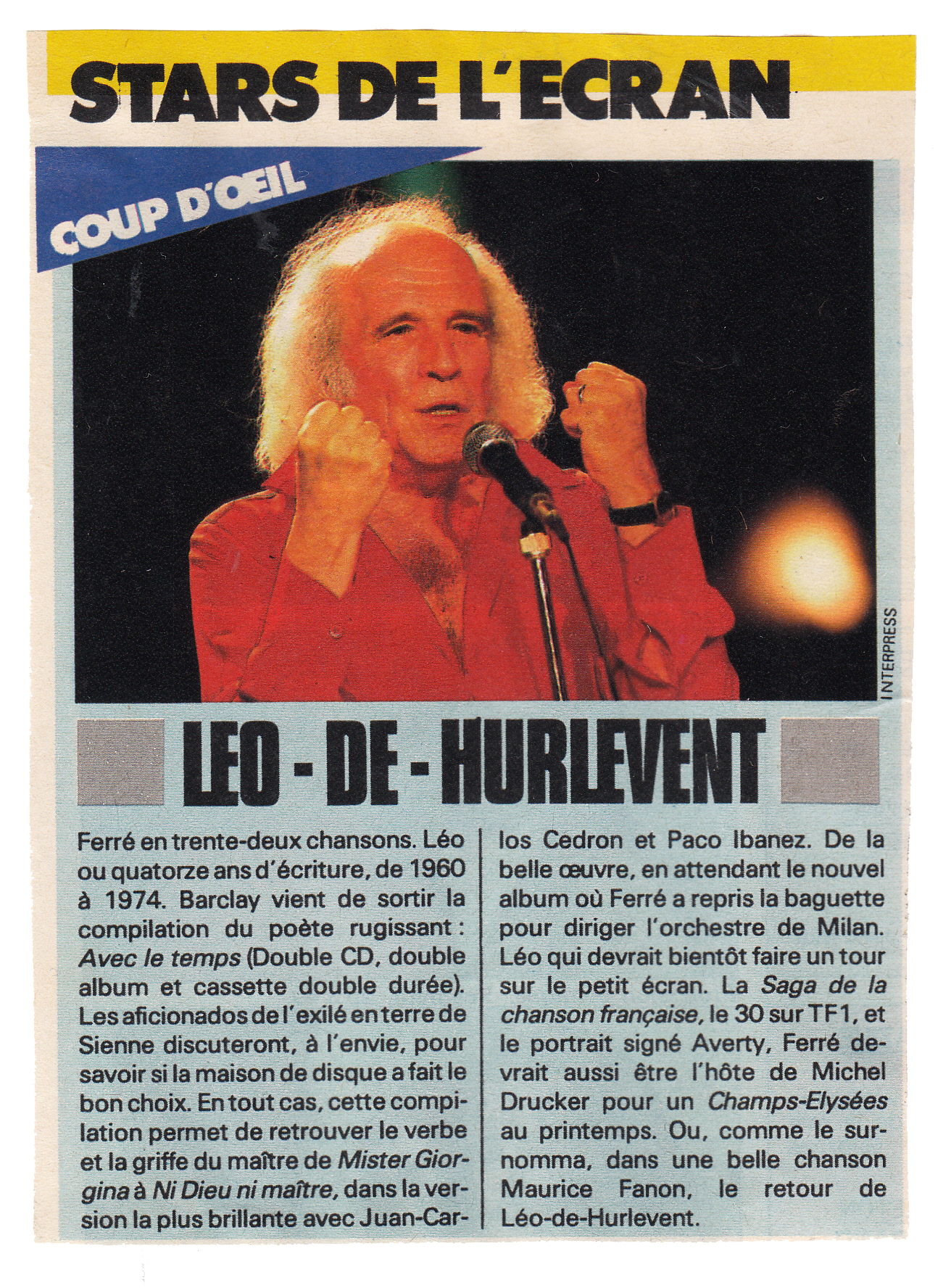 • MERCREDI 11 AVRIL AMOUR, ANARCHIE, LÉO FERRÉ 90 : FR 3, 20 h 35