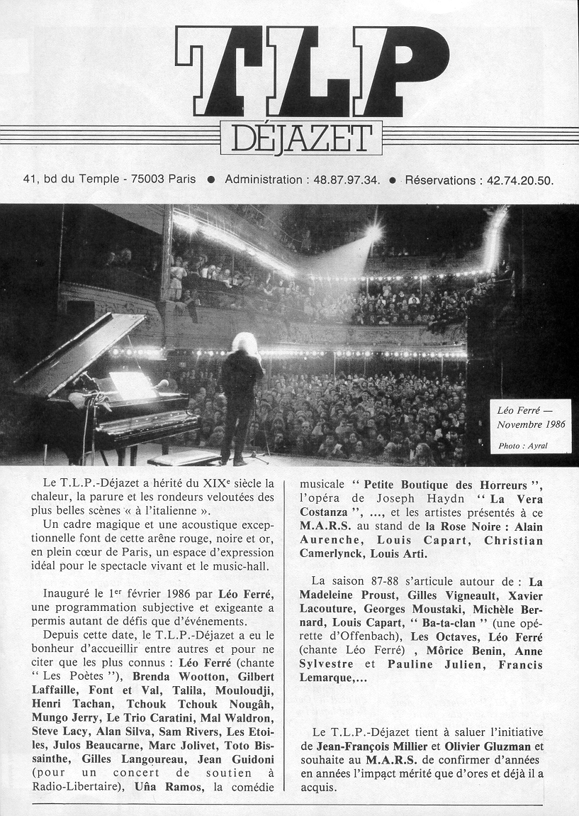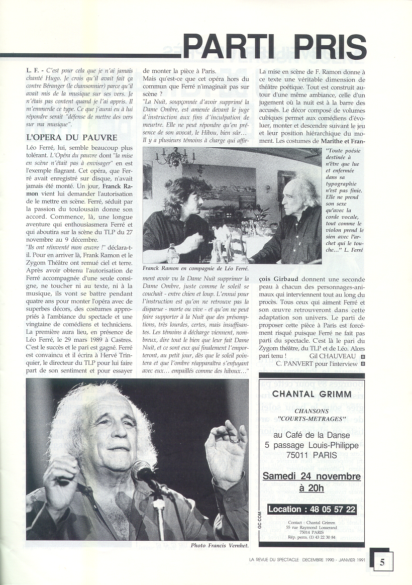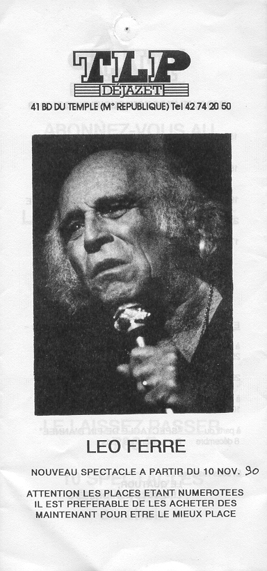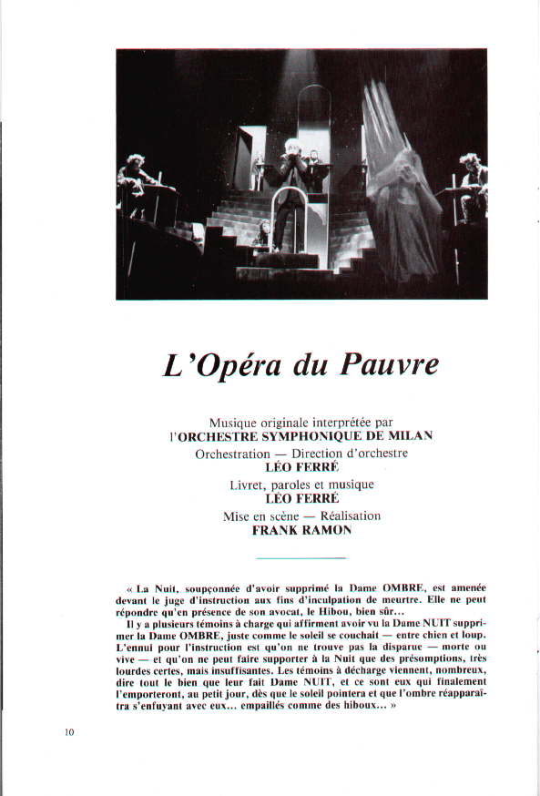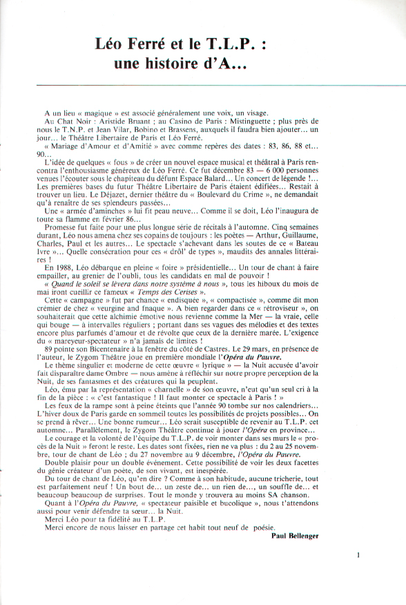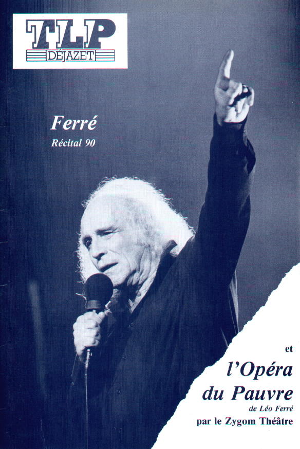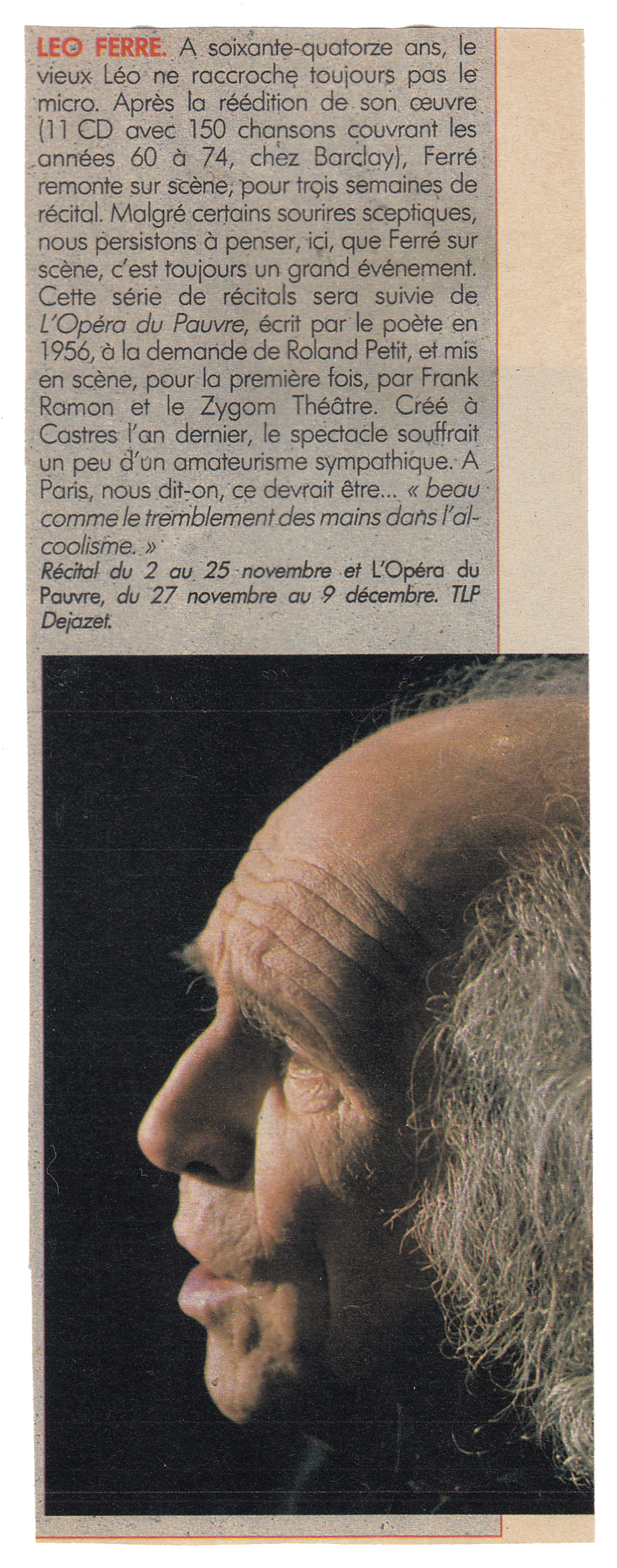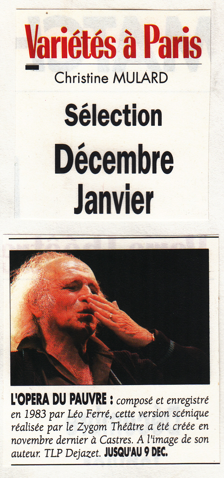 02 au 25.11 : Programme regroupant le récital de Léo Ferré et L'Opéra du pauvre (nouvelle version) par le Zygom Théâtre (mise en scène de Frank Ramon) du 27 novembre au 9 décembre 1990