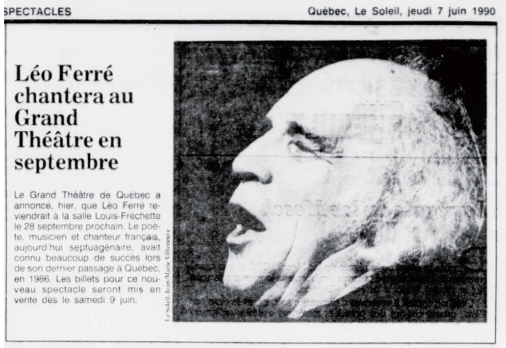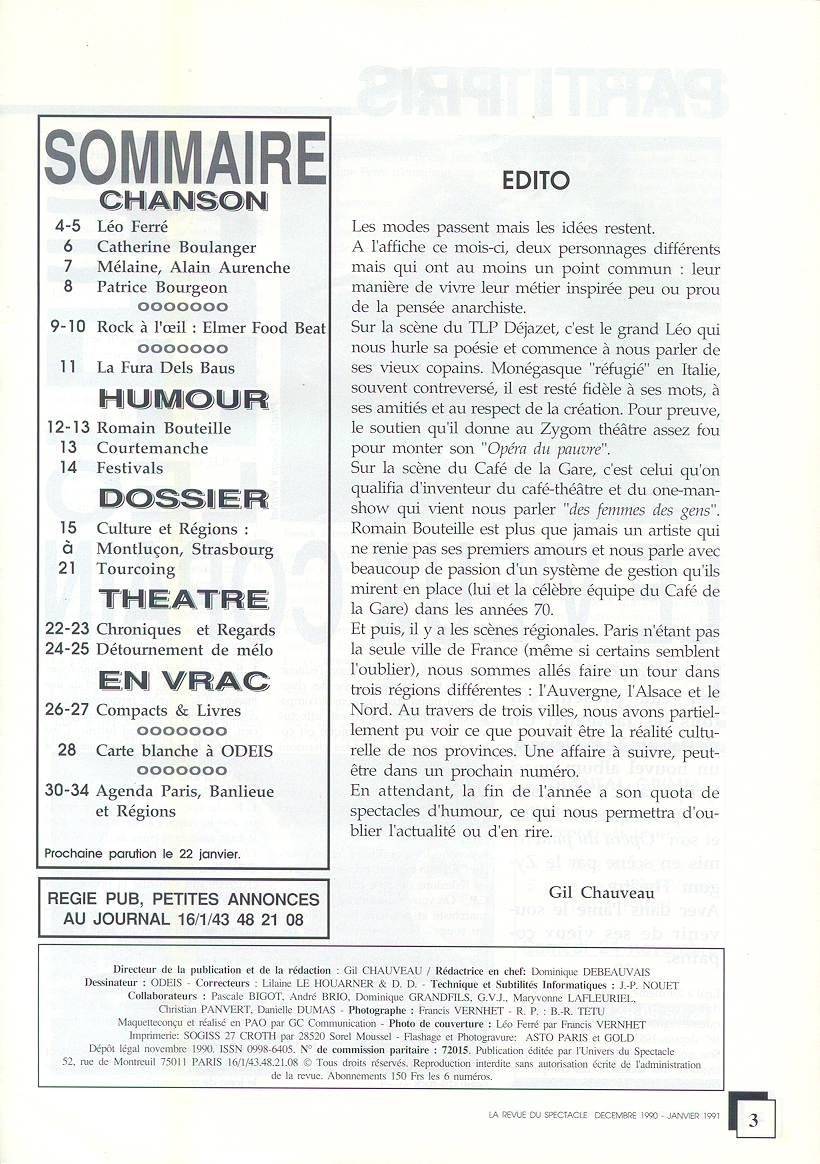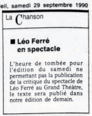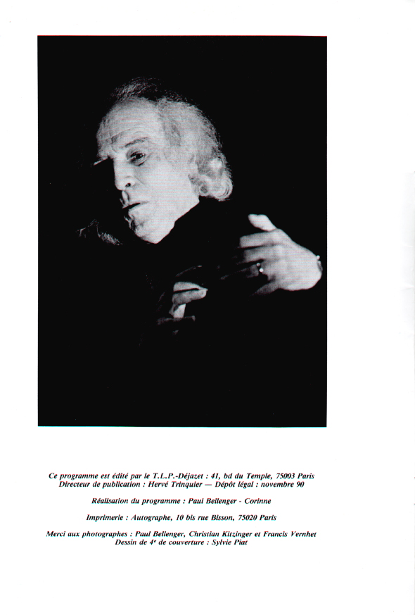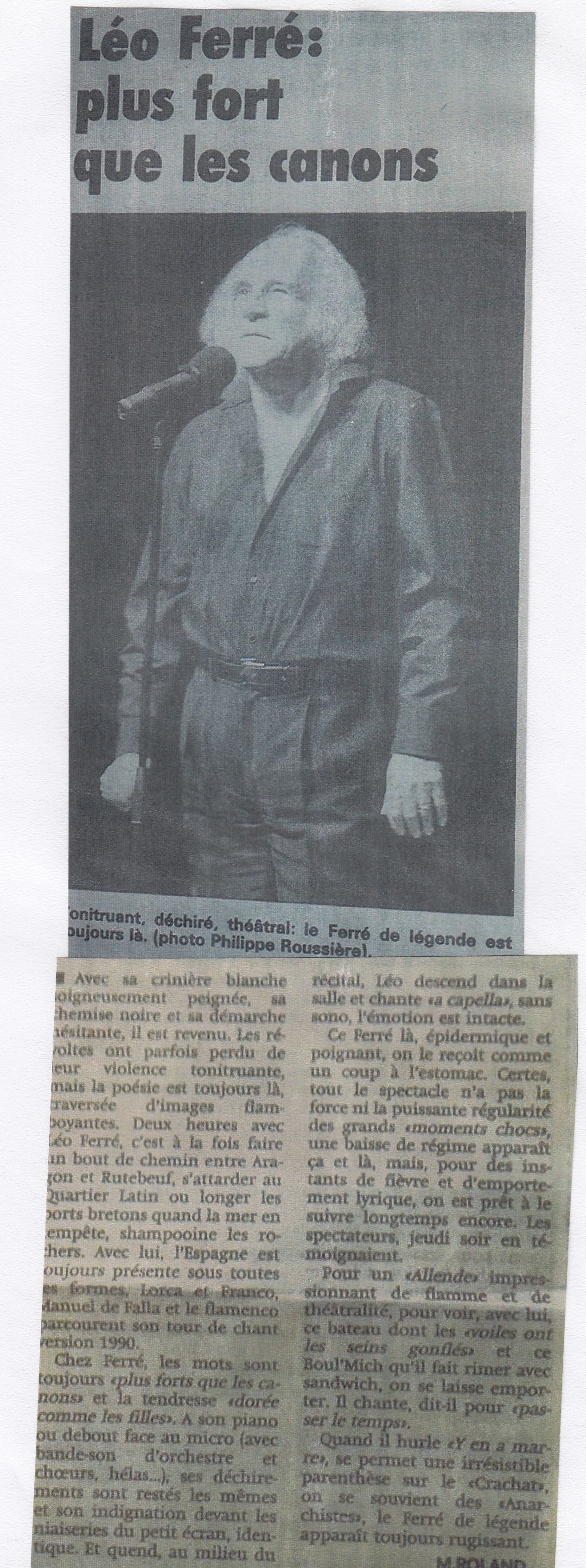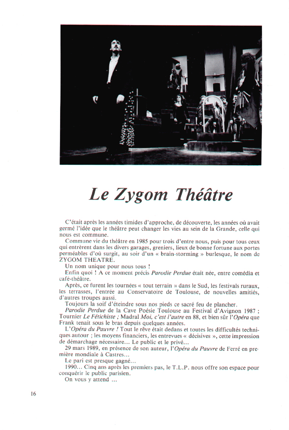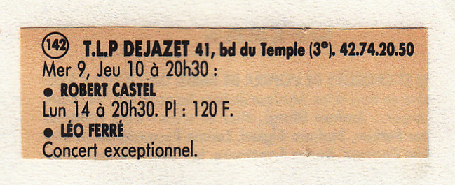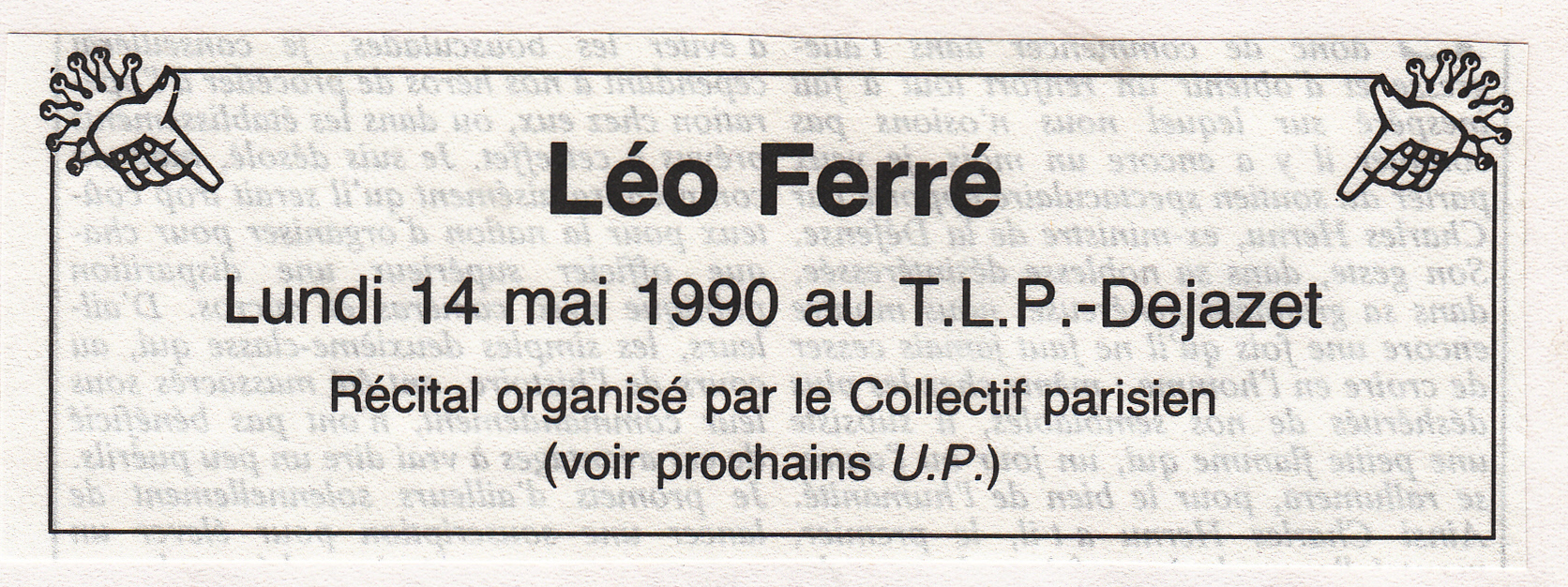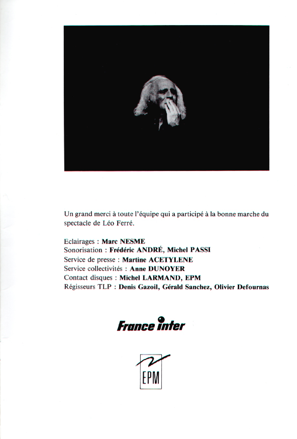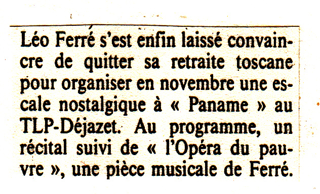 02 au 25.11 : Programme regroupant le récital de Léo Ferré et L'Opéra du pauvre (nouvelle version) par le Zygom Théâtre (mise en scène de Frank Ramon) du 27 novembre au 9 décembre 1990