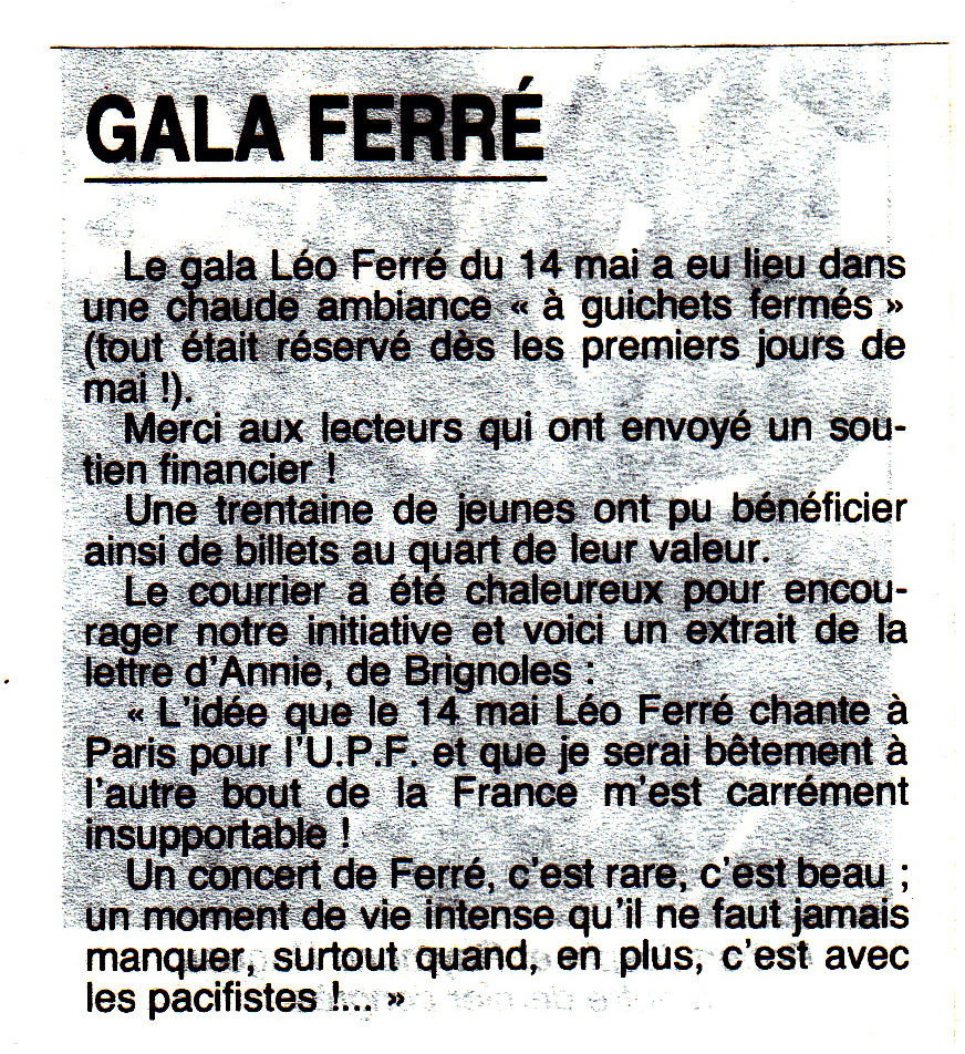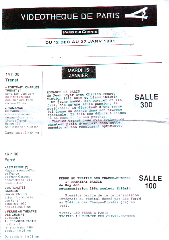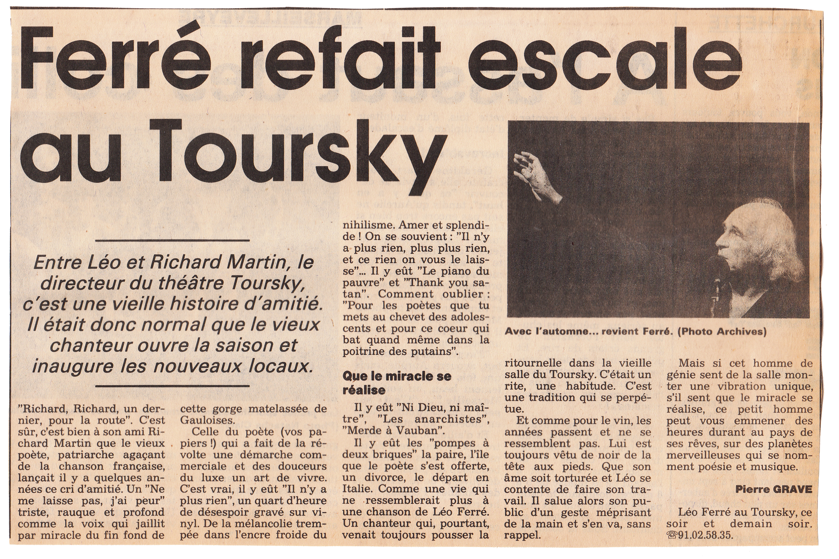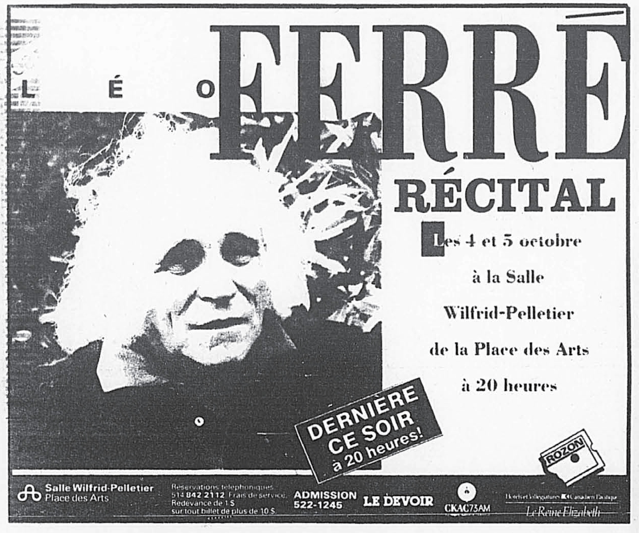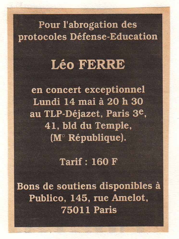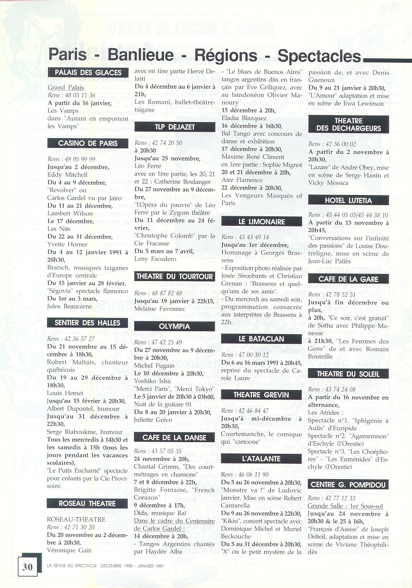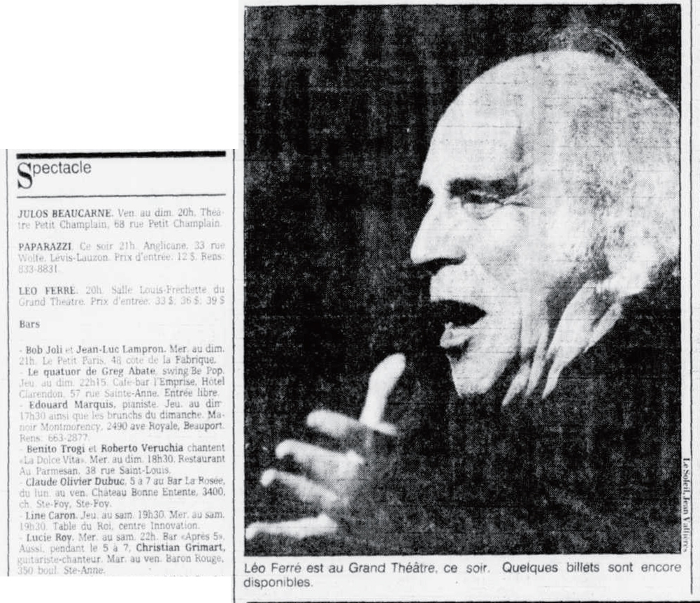 02 au 25.11 : Programme regroupant le récital de Léo Ferré et L'Opéra du pauvre (nouvelle version) par le Zygom Théâtre (mise en scène de Frank Ramon) du 27 novembre au 9 décembre 1990