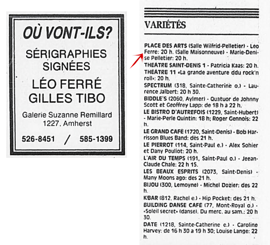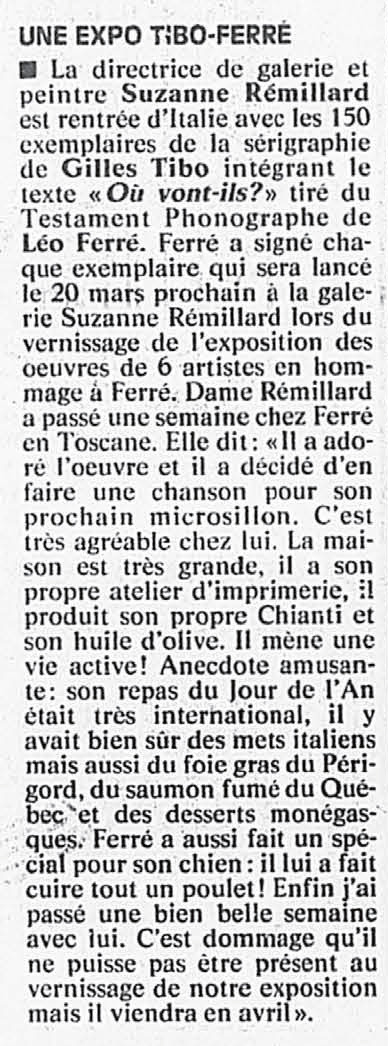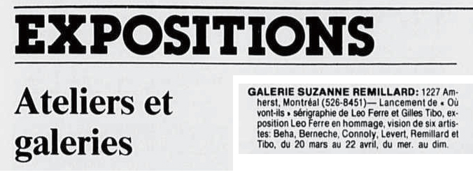 • Galerie Suzanne Remillard (Lancement de "Où vont-ils", sérigraphie de Léo Ferré et Gilles Tibo)