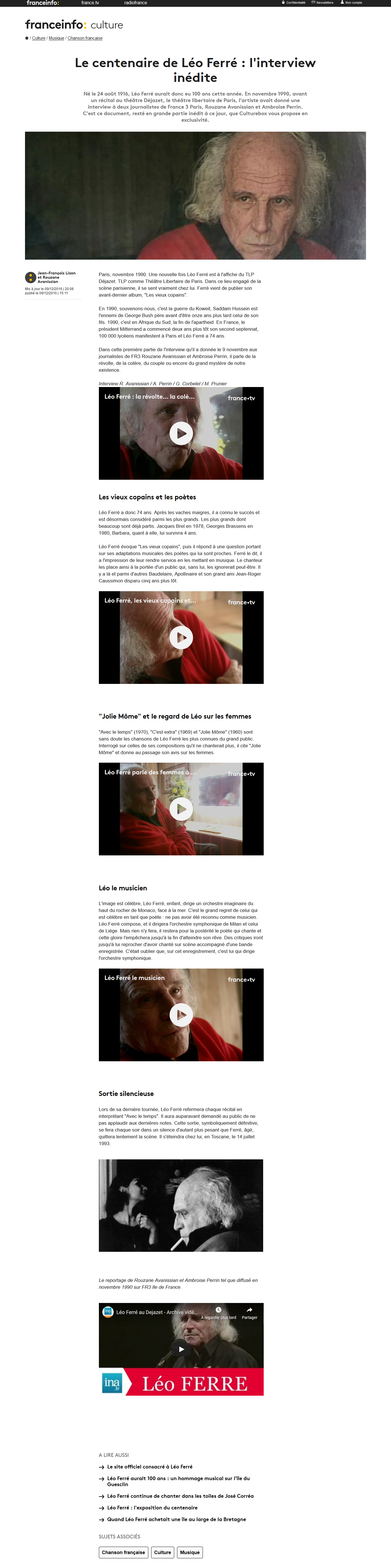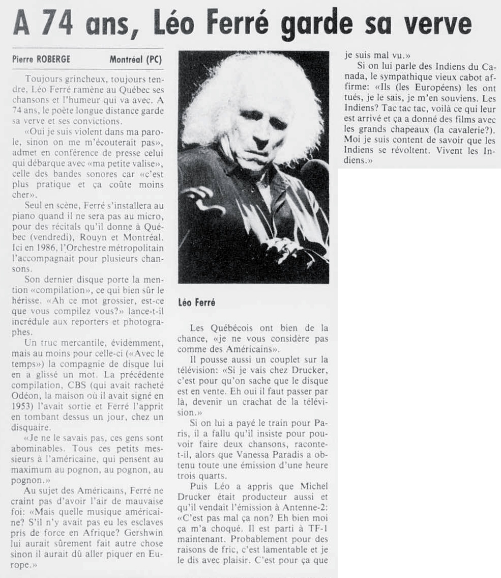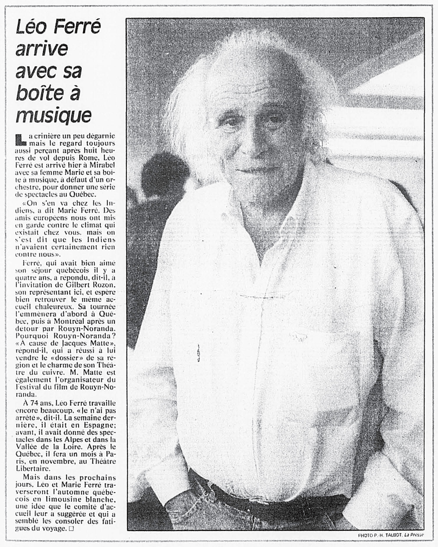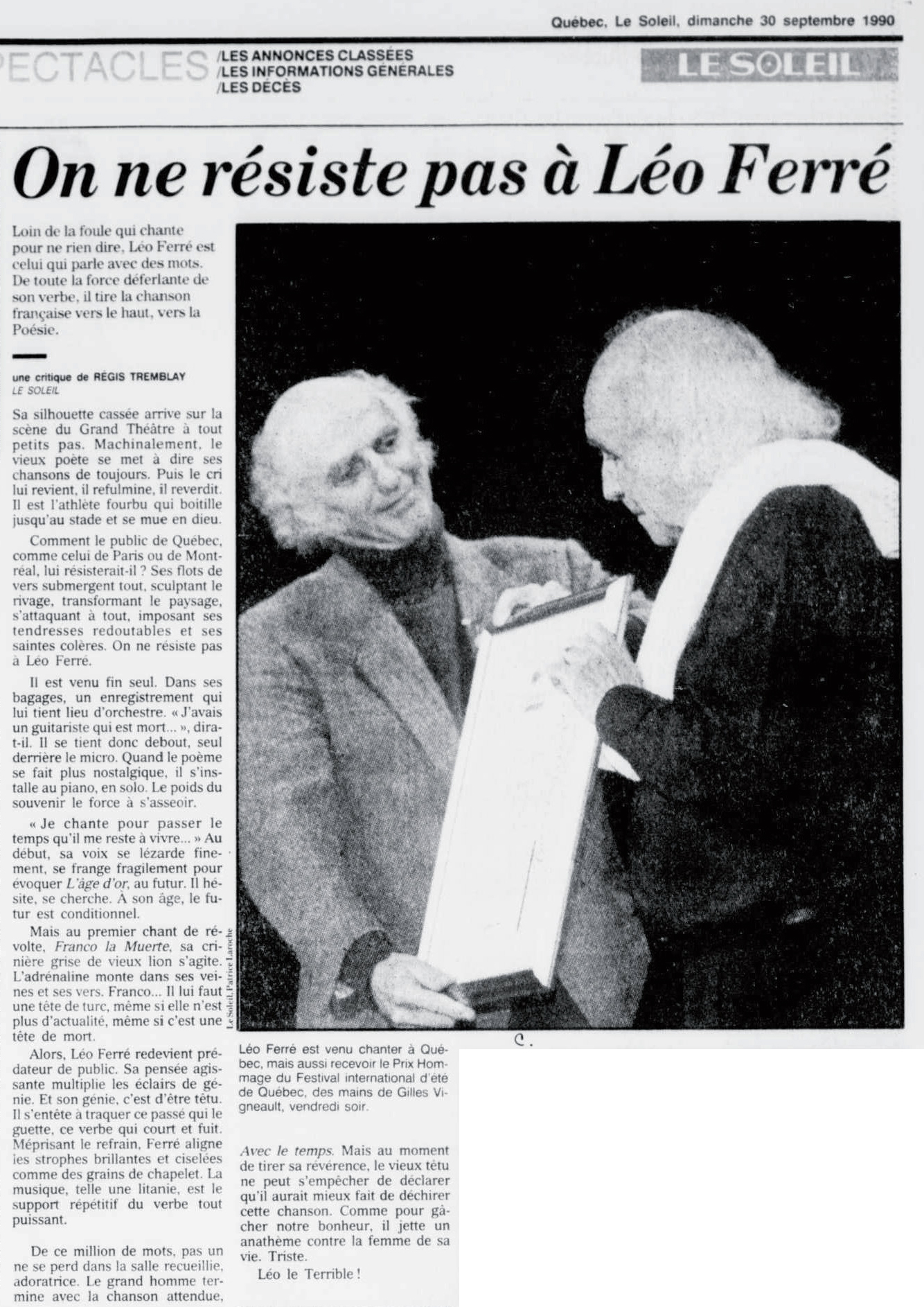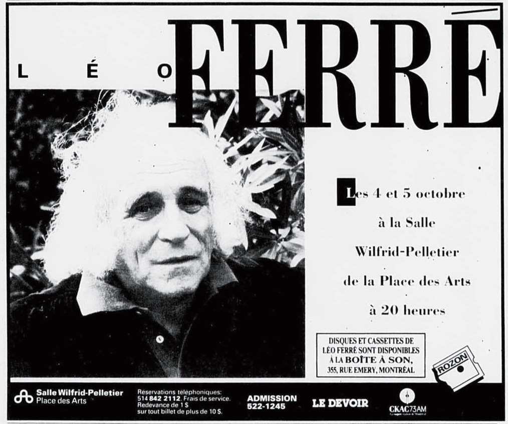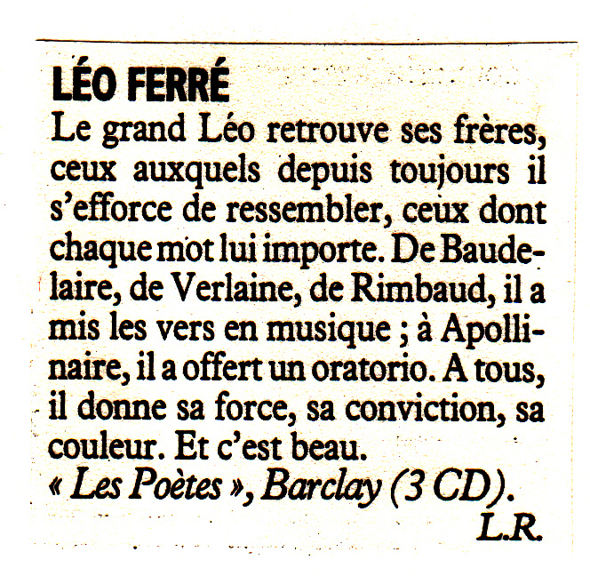 Léo Ferré a donc 74 ans. Après les vaches maigres, il a connu le succès et est désormais considéré parmi les plus grands. Les plus grands dont beaucoup sont déjà partis. Jacques Brel en 1978, Georges Brassens en 1980, Barbara, quant à elle, lui survivra 4 ans.