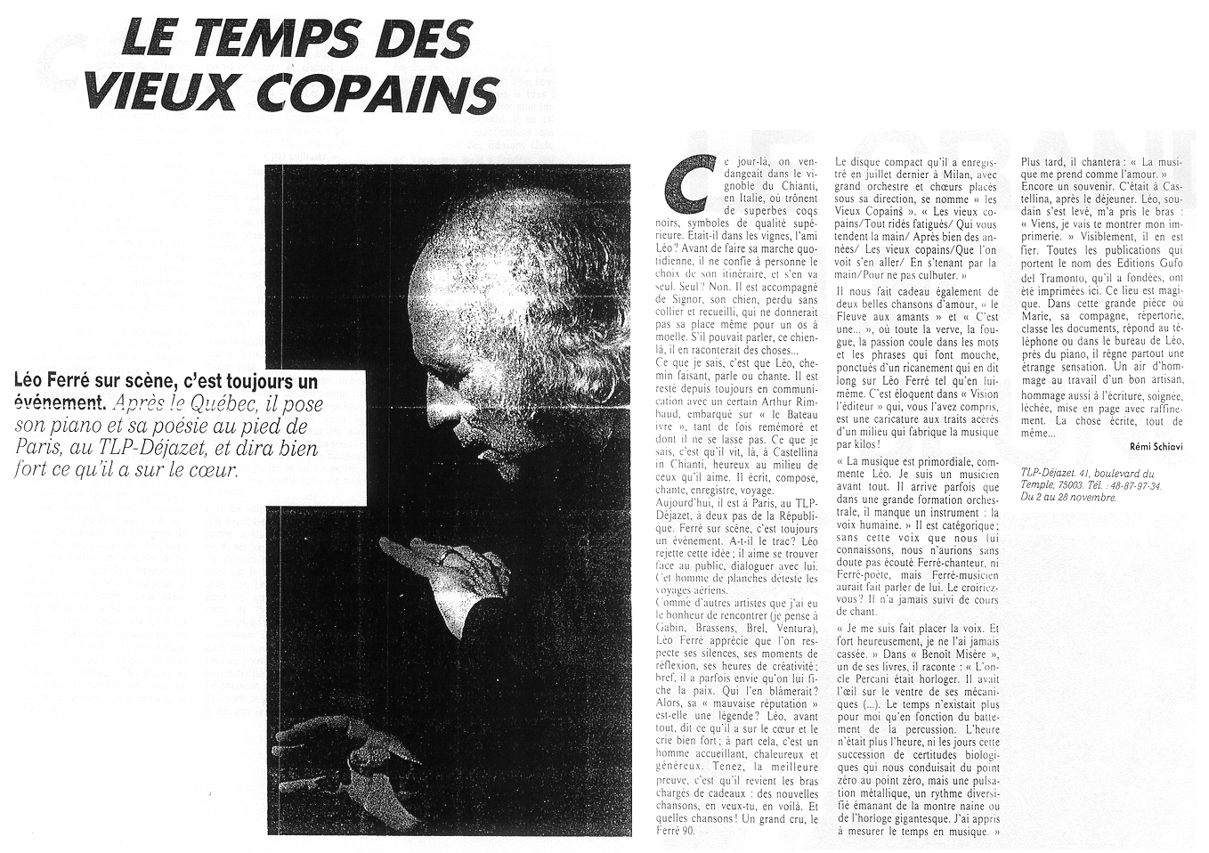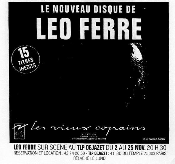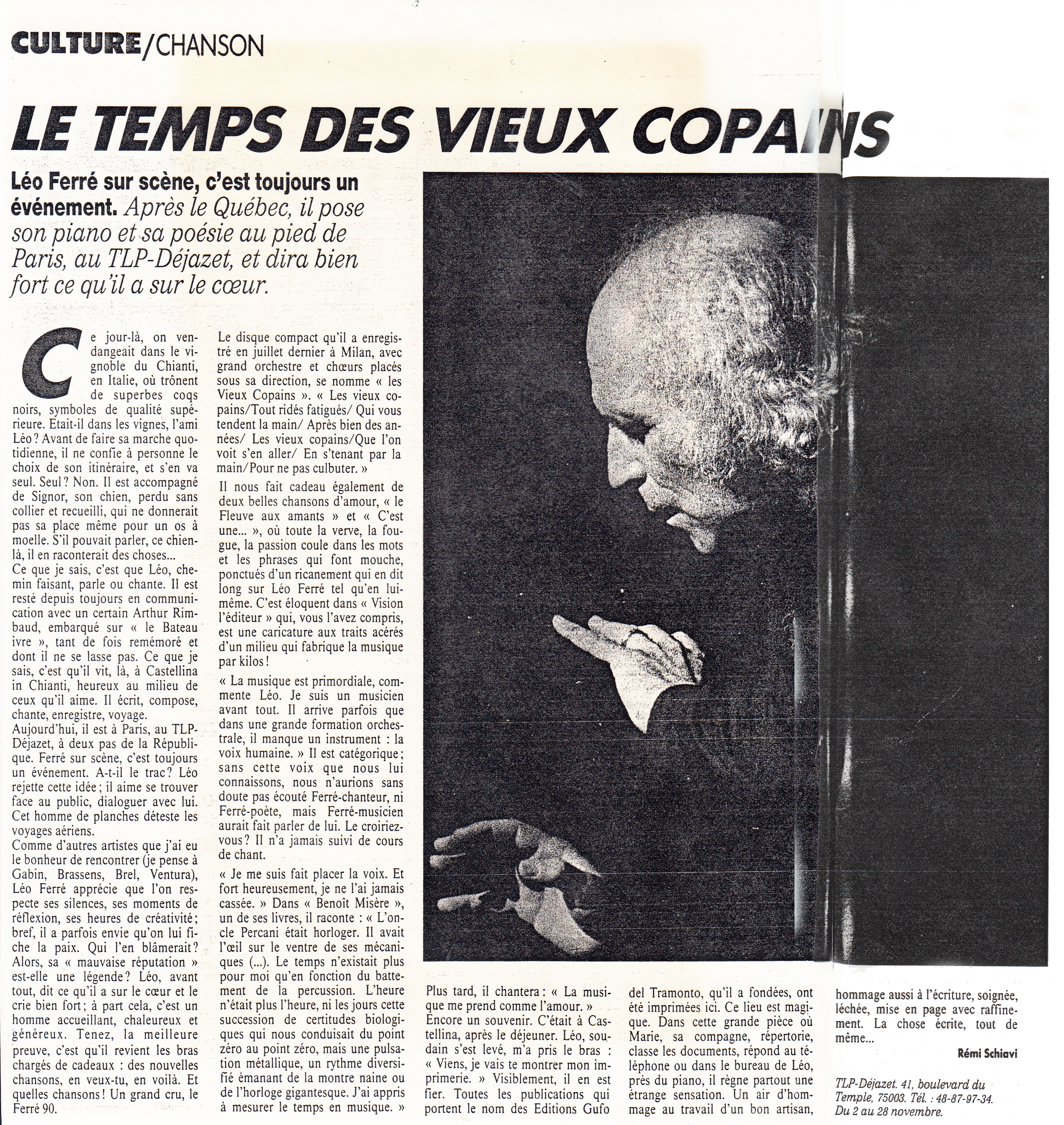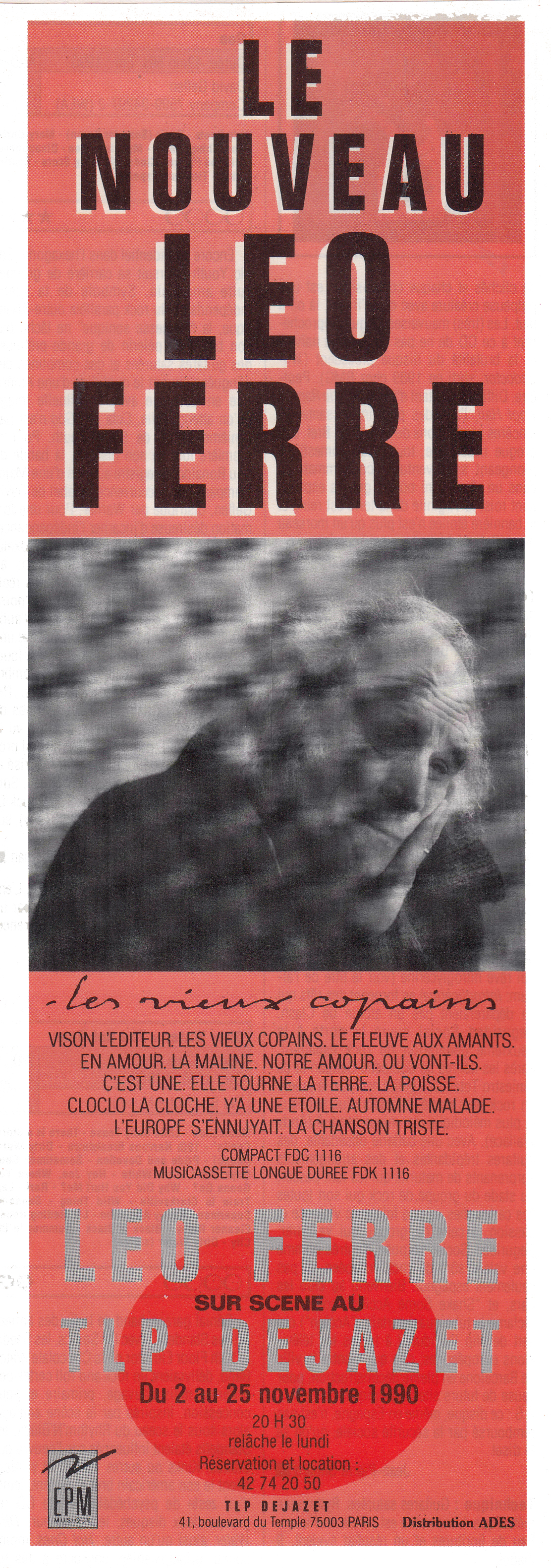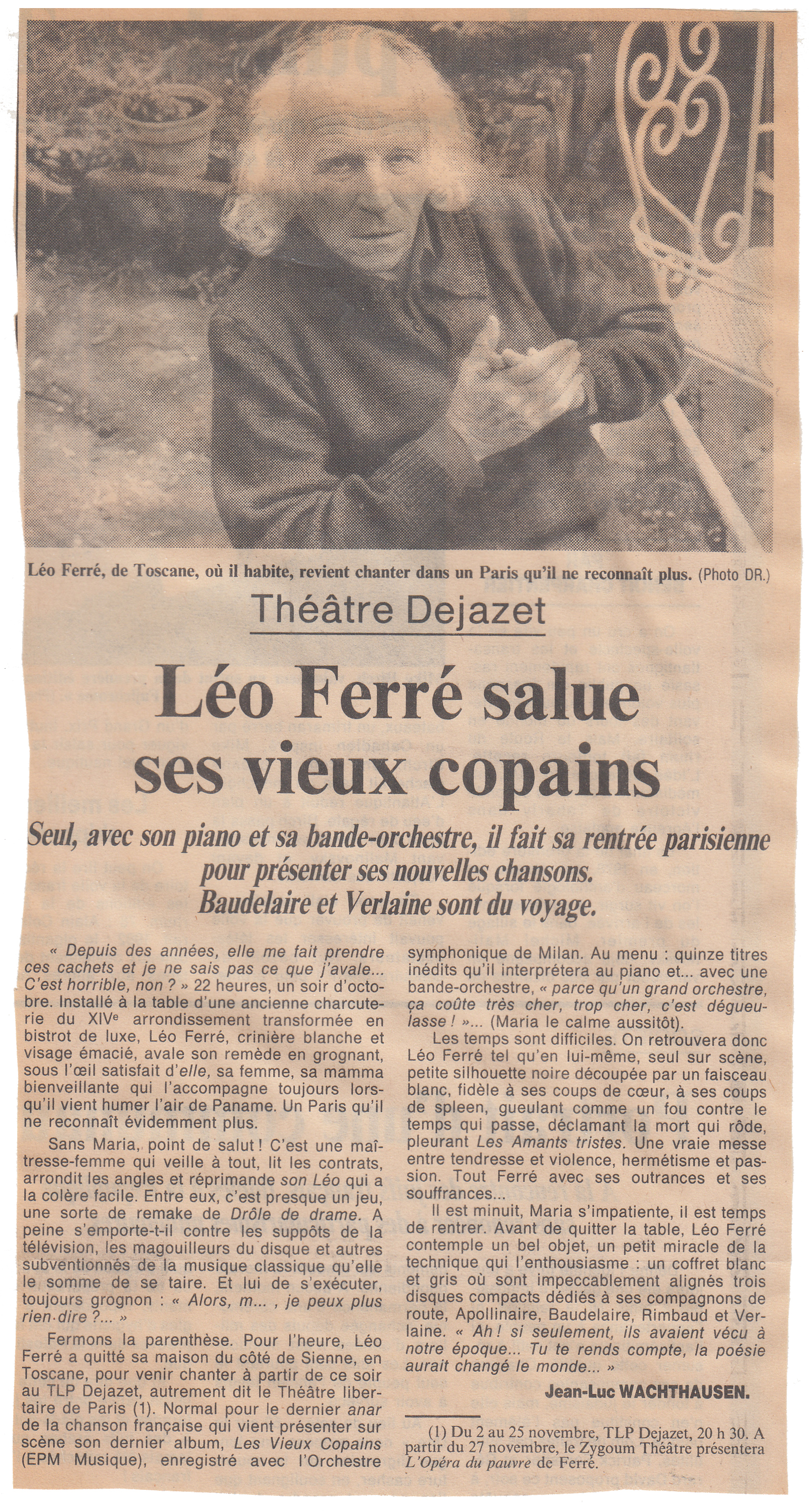 Paris, novembre 1990. Une nouvelle fois Léo Ferré est à l'affiche du TLP Déjazet. TLP comme Théâtre Libertaire de Paris. Dans ce lieu engagé de la scène parisienne, il se sent vraiment chez lui. Ferré vient de publier son avant-dernier album, "Les vieux copains".