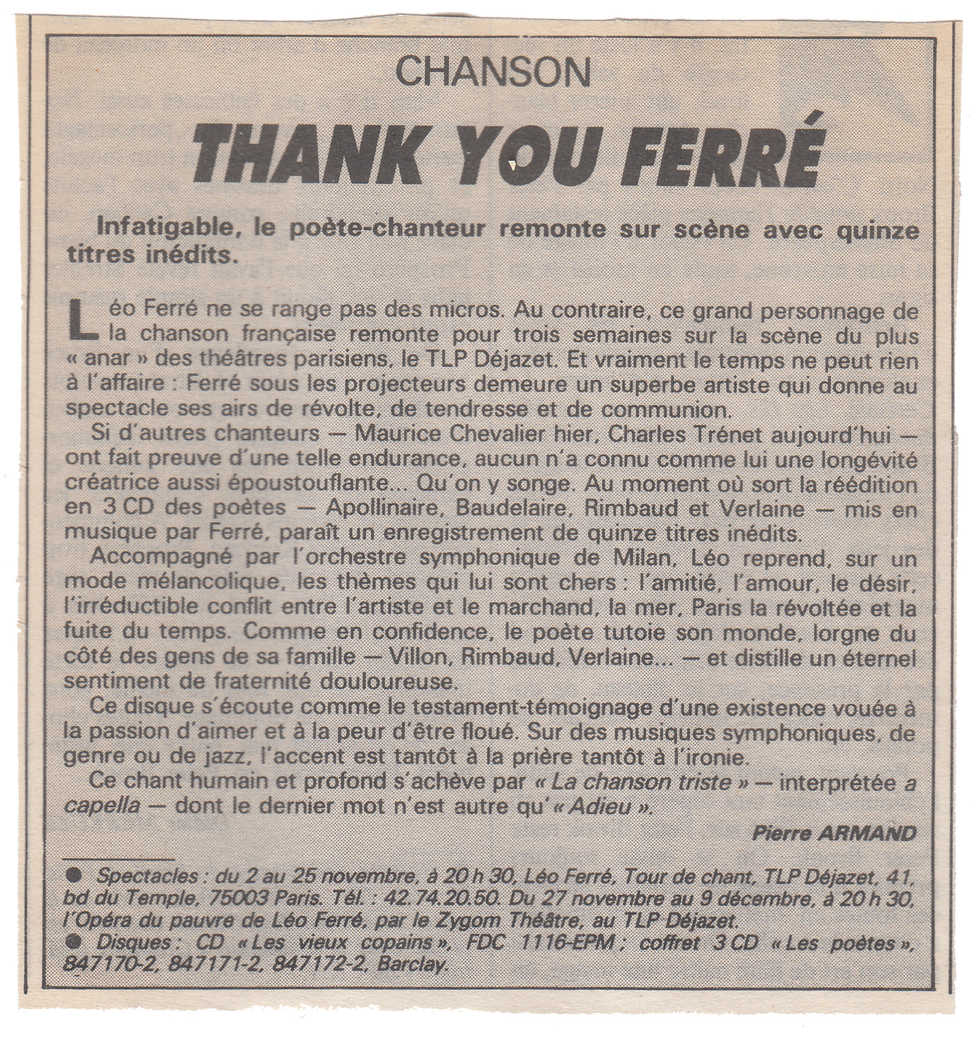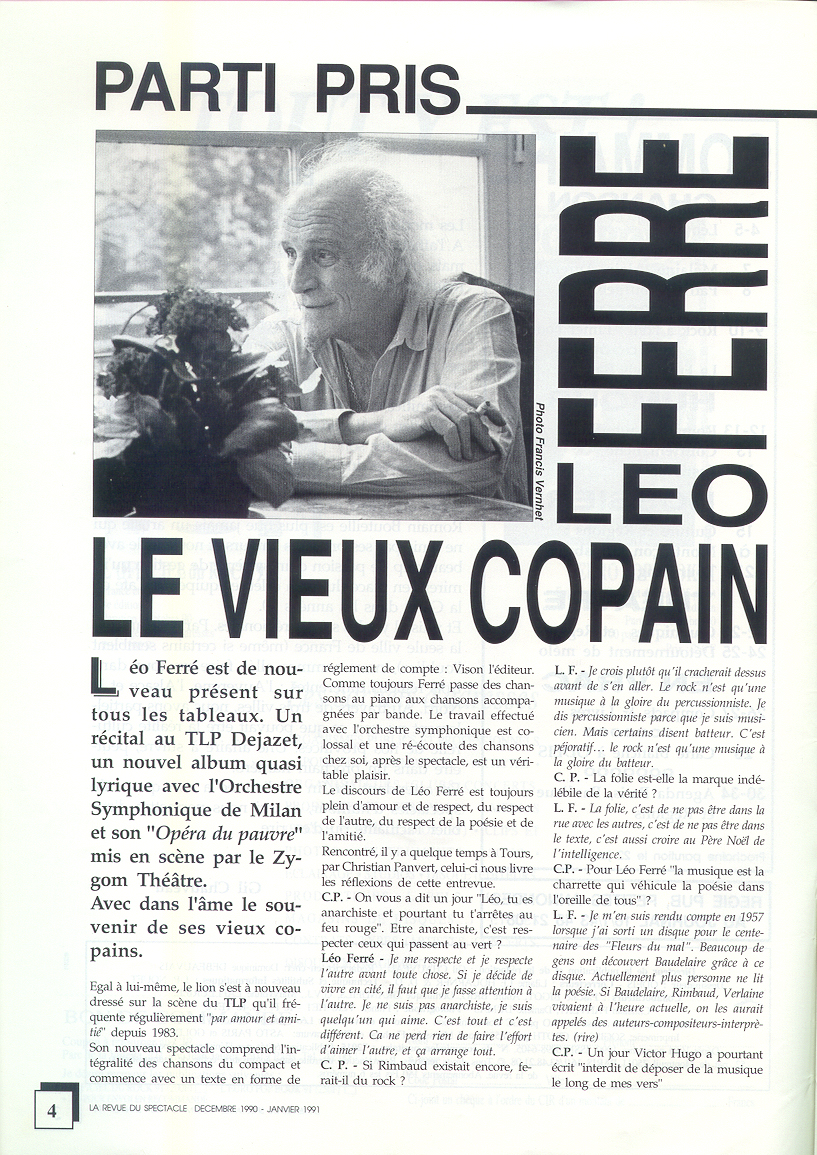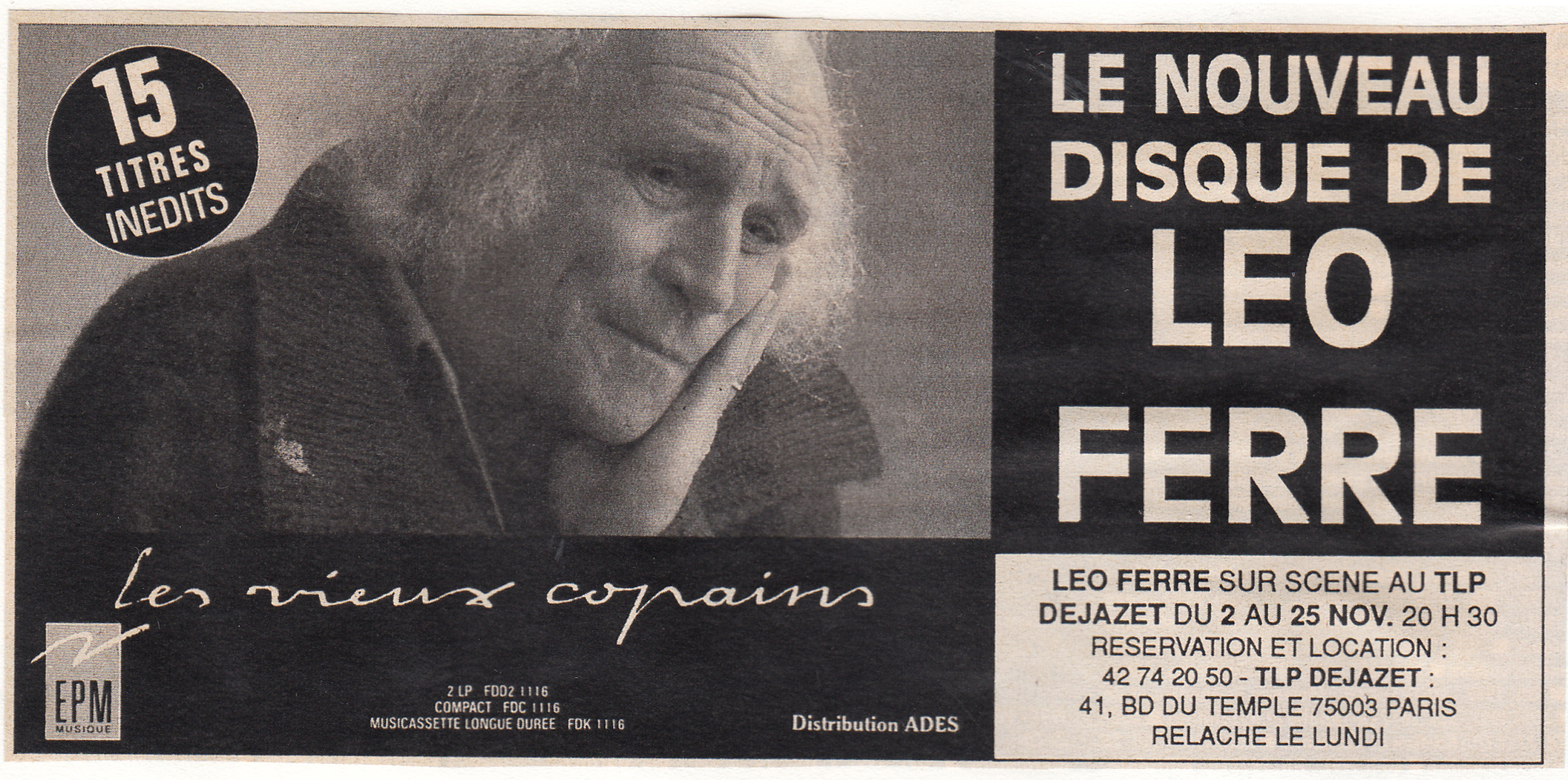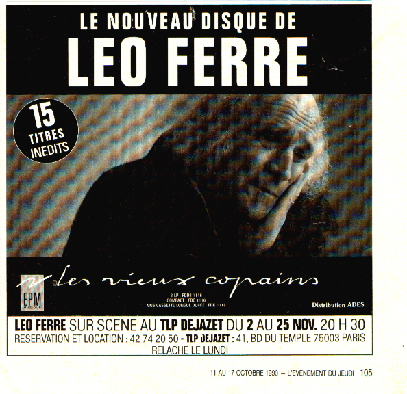 Paris, novembre 1990. Une nouvelle fois Léo Ferré est à l'affiche du TLP Déjazet. TLP comme Théâtre Libertaire de Paris. Dans ce lieu engagé de la scène parisienne, il se sent vraiment chez lui. Ferré vient de publier son avant-dernier album, "Les vieux copains".