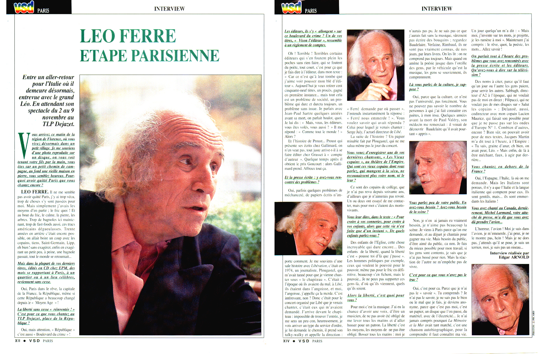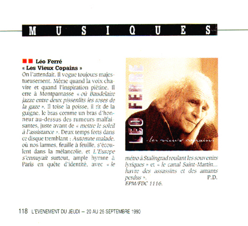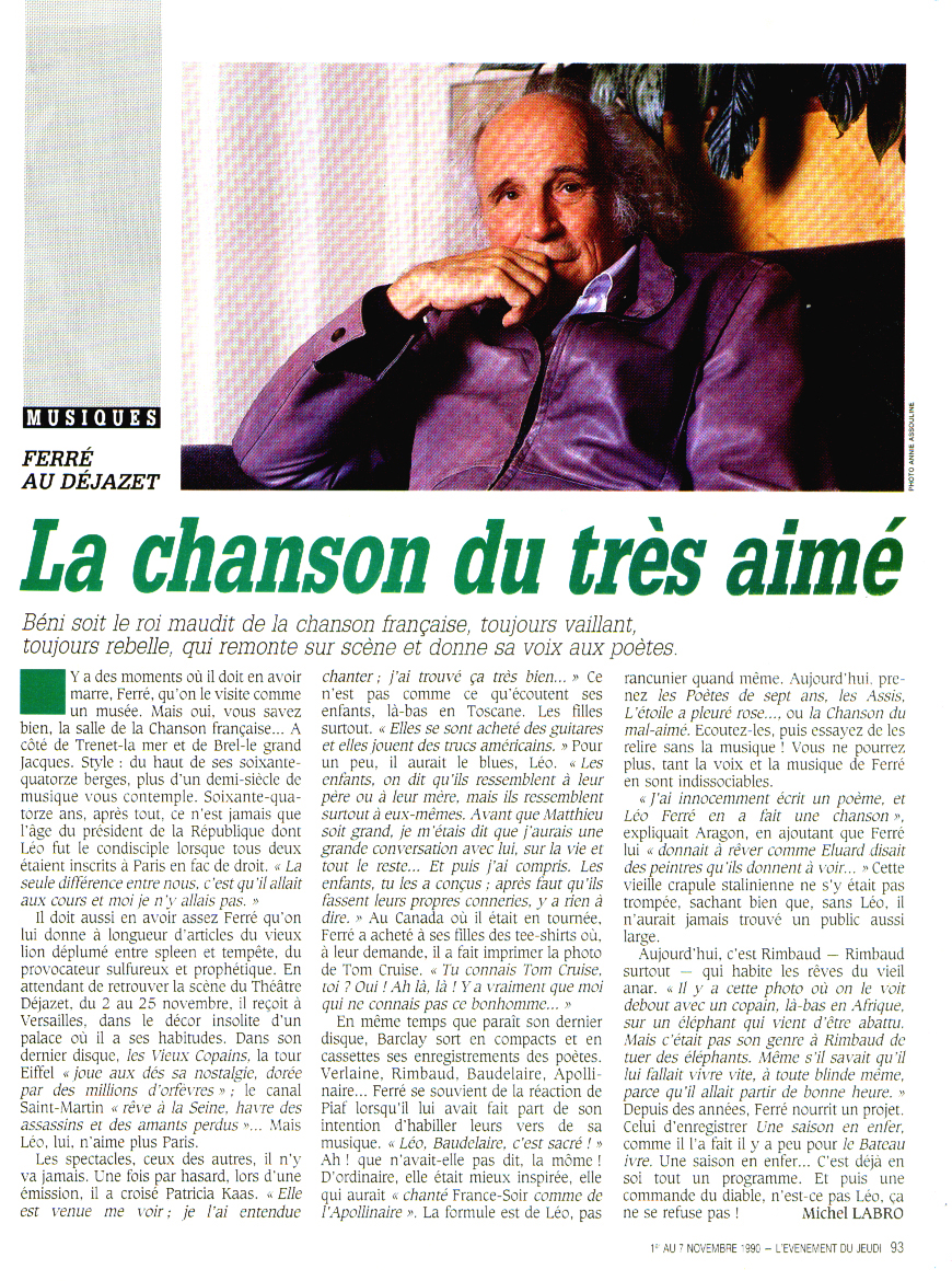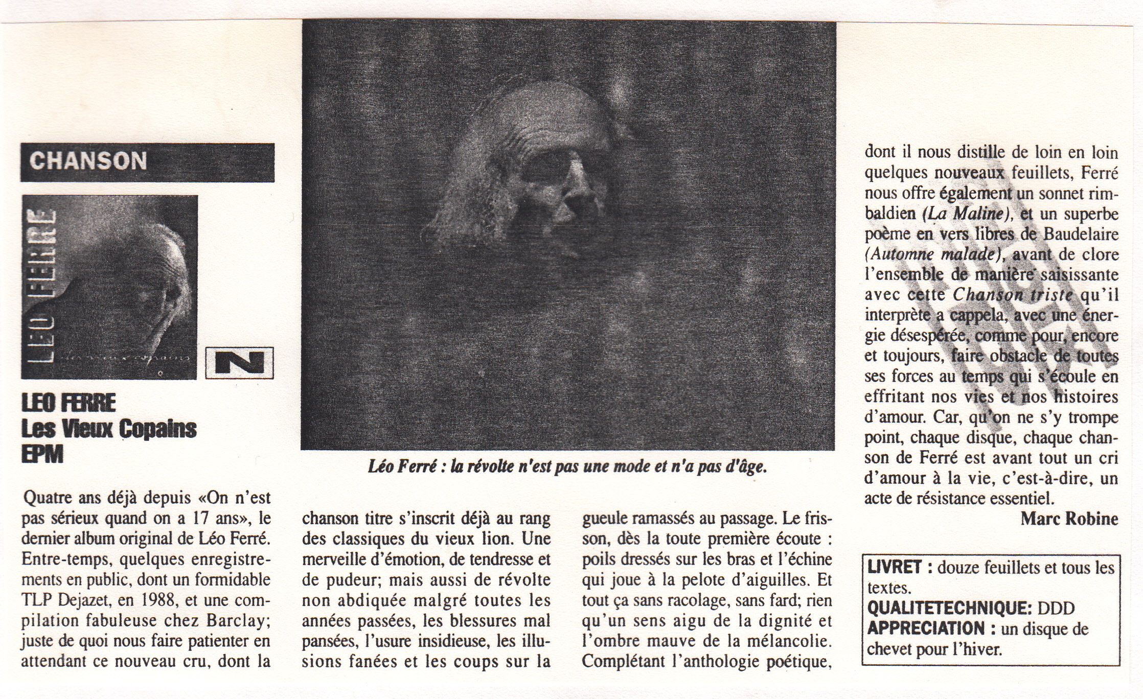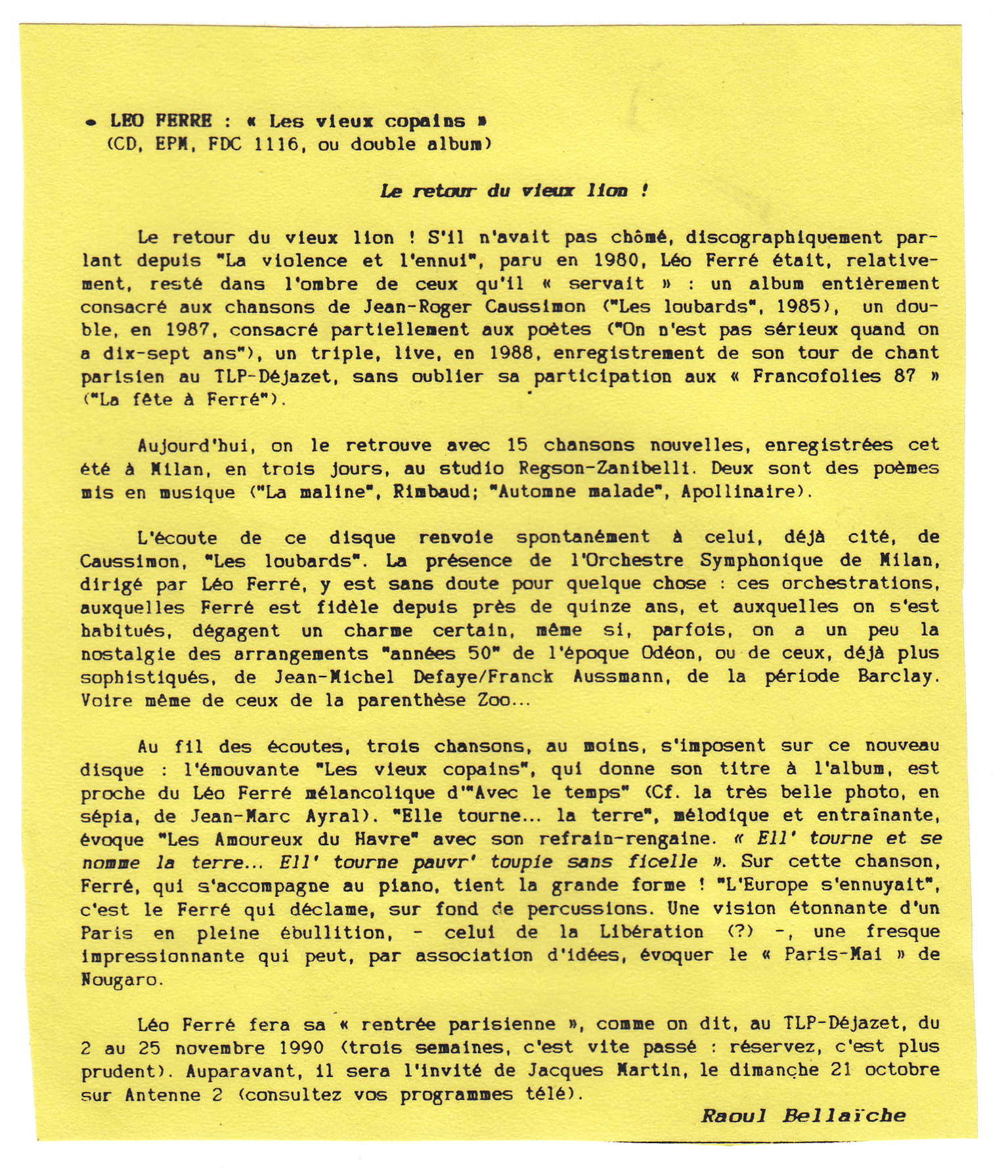 Paris, novembre 1990. Une nouvelle fois Léo Ferré est à l'affiche du TLP Déjazet. TLP comme Théâtre Libertaire de Paris. Dans ce lieu engagé de la scène parisienne, il se sent vraiment chez lui. Ferré vient de publier son avant-dernier album, "Les vieux copains".
