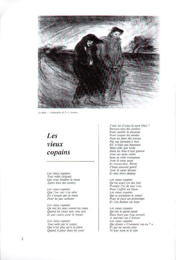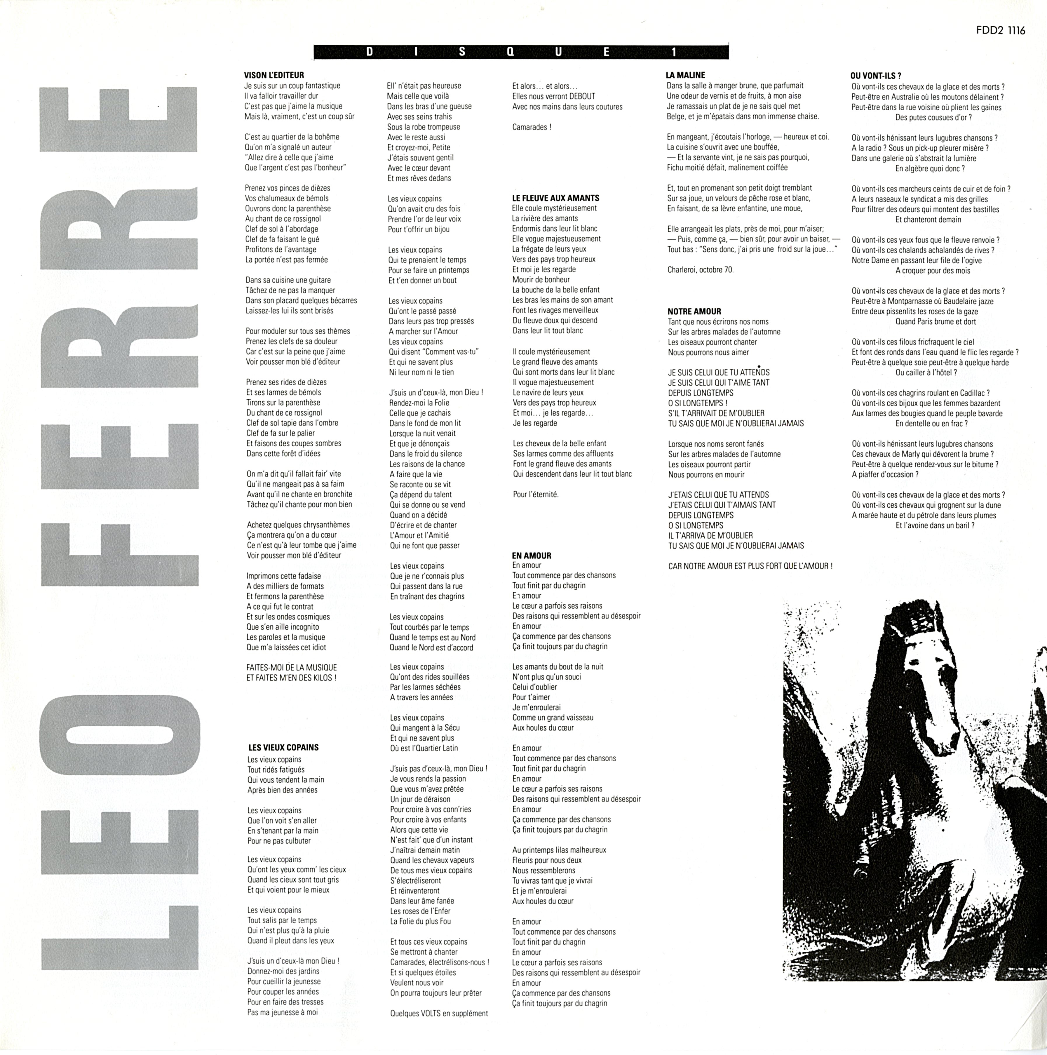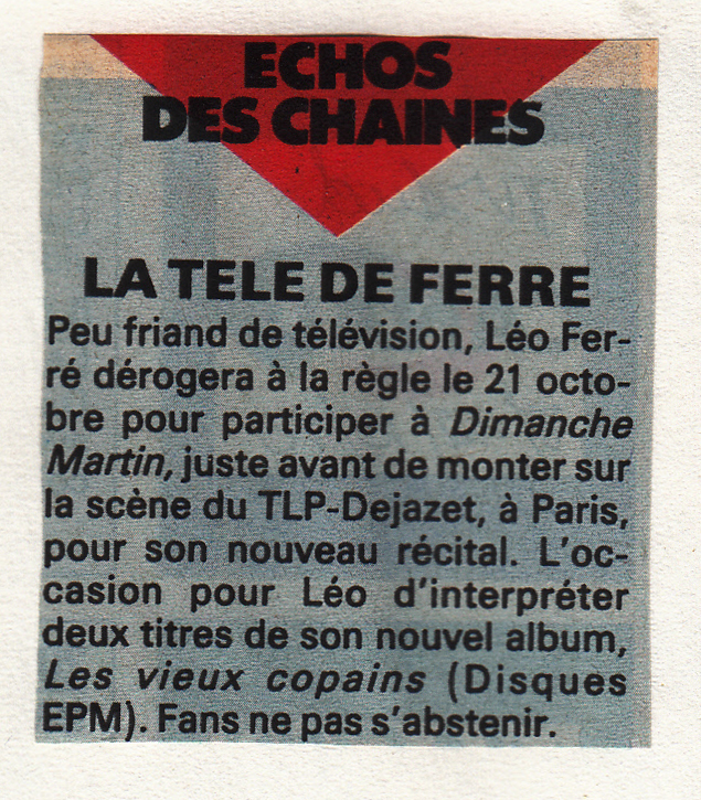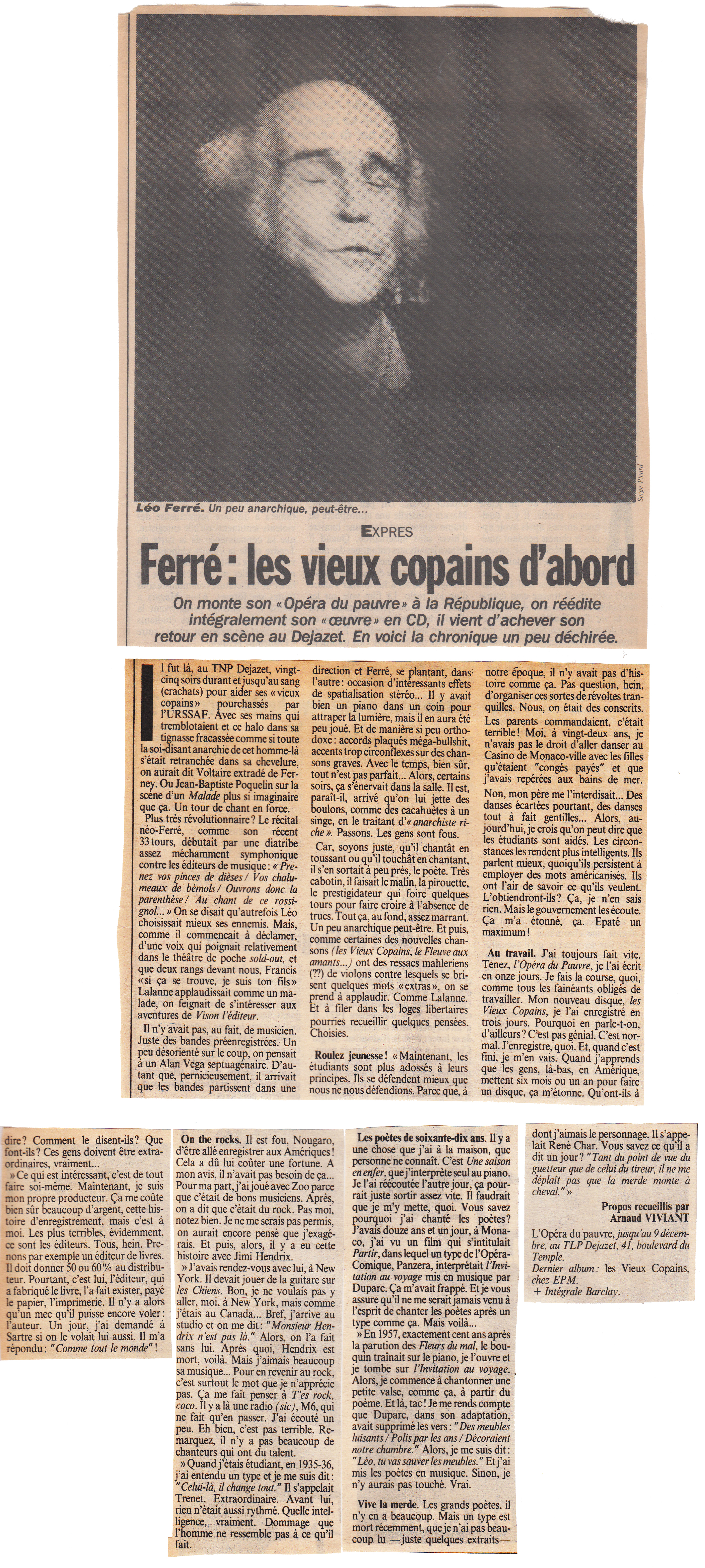 Léo Ferré évoque "Les vieux copains", puis il répond à une question portant sur ses adaptations musicales des poètes qui lui sont proches. Ferré le dit, il a l'impression de leur rendre service en les mettant en musique. Le chanteur les place ainsi à la portée d'un public qui, sans lui, les ignorerait peut-être. Il y a là et parmi d'autres Baudelaire, Apollinaire et son grand ami Jean-Roger Caussimon disparu cinq ans plus tôt.