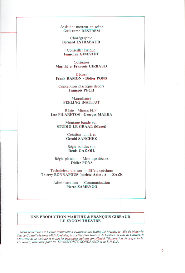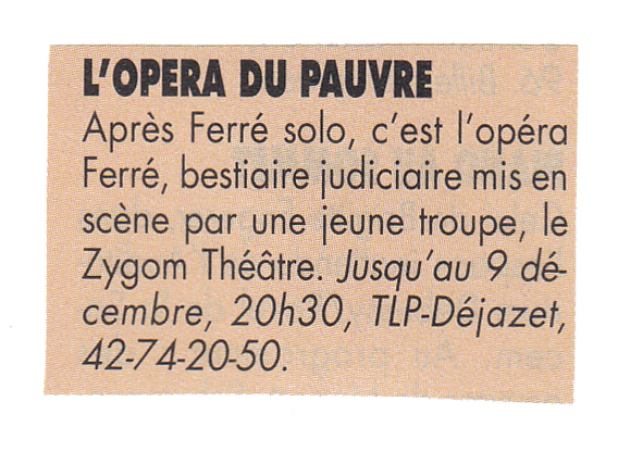 du 27 novembre au 9 décembre 1990 : L'Opéra du pauvre, mis en scène par Frank Ramon est enfin donné à Paris au TLP Déjazet avec seize comédiens du Zygom Théâtre sur les bandes orchestre de l’album.