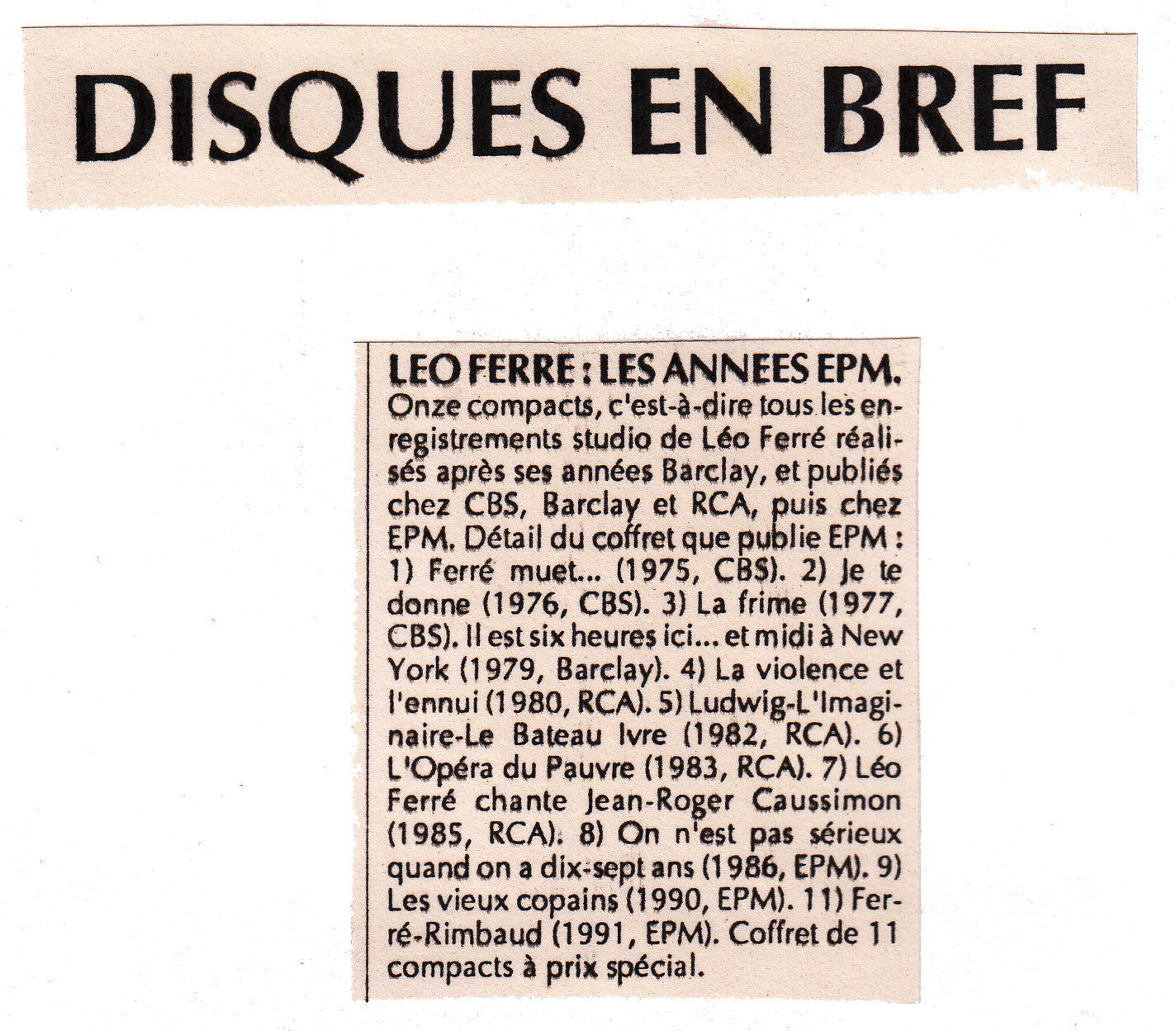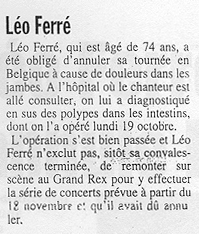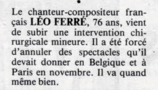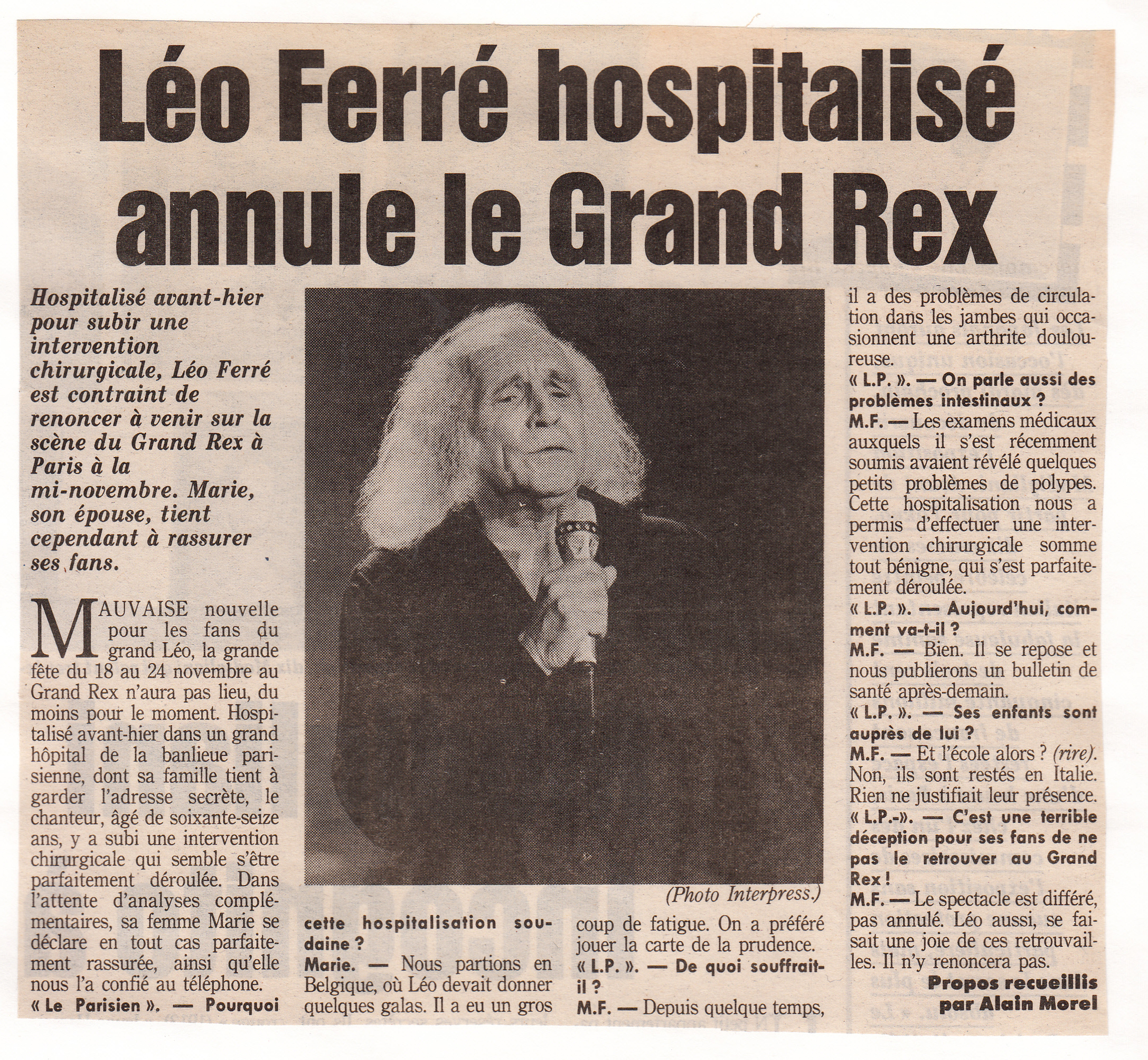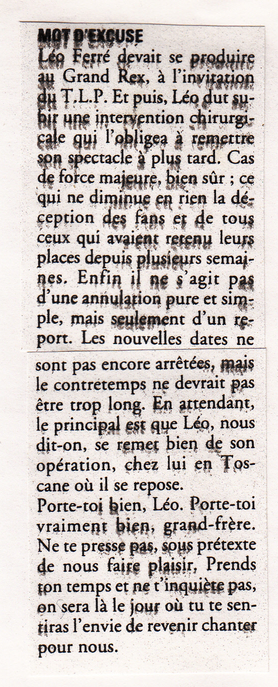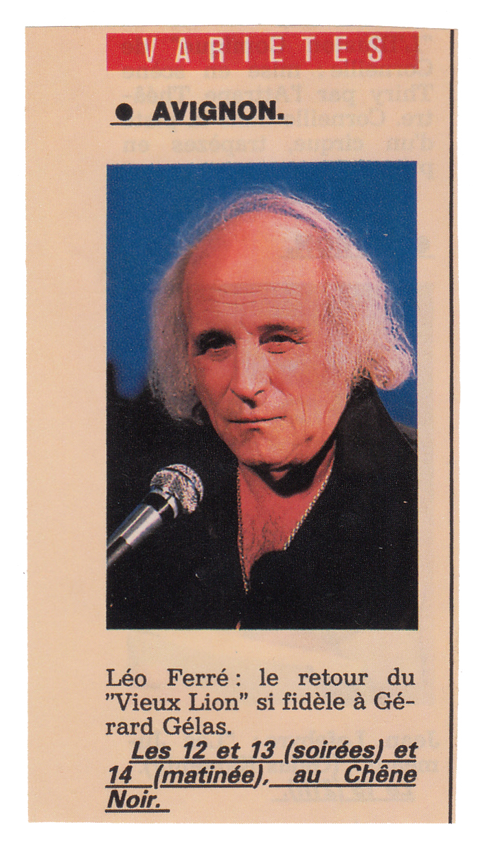 Léo et nous, c’est toute une histoire. Personnelle d’abord avec Le Flamenco de Paris, Le Bateau espagnol, Franco la muerte, Les Anarchistes… Puis professionnelle. En 1985, nous lui consacrions un premier dossier spécial dans Paroles et Musique (n° 51), photo de couverture signée Alain Marouani... Deux ans plus tard, en coédition Paroles et Musique/Seghers, nous sortions La Mémoire et le Temps, de Jacques Layani, très originale « biographie d’une œuvre » qui me valut plusieurs conversations téléphoniques nocturnes et, disons, pointues, avec Léo et Marie-Christine Ferré. À titre personnel, je garde notamment au cœur un dîner et une soirée (jusqu’à trois heures passées !) sur nos terres, en 1982, avec Léo et Marie-Christine, et… Jean Sommer (voir plus haut) qui avait fait spécialement le déplacement depuis Paris. J’entends encore Marie-Christine souffler, à juste titre, à Léo : « Demain, tu chantes à Caen, il est peut-être temps d’aller se coucher… » Mais Léo, pétant le feu, n’avait pas sommeil et ne se faisait pas prier pour pousser la chansonnette (quel souvenir !)… alors même qu’il avait donné ce soir-là un concert de plus de deux heures et demie !