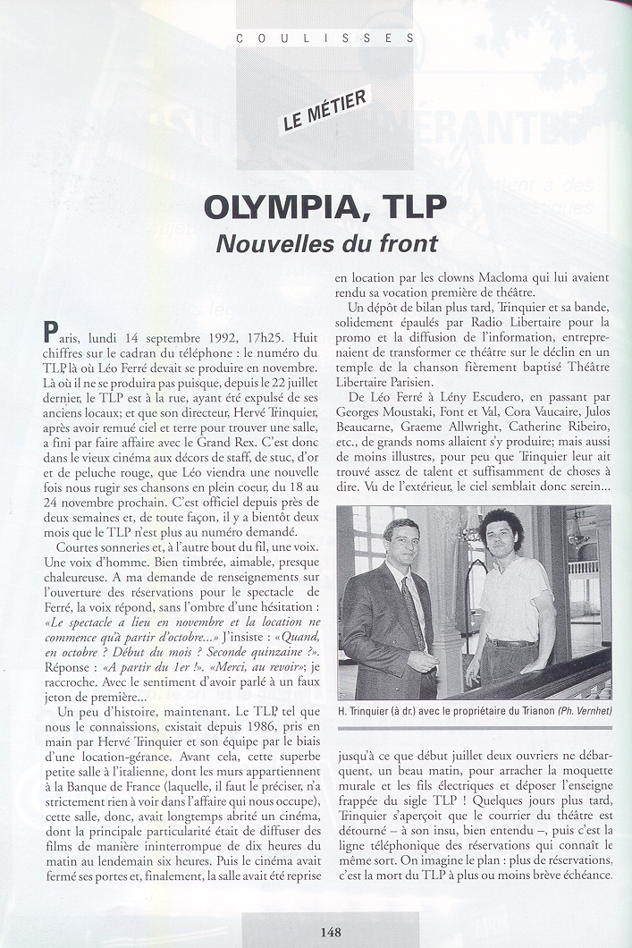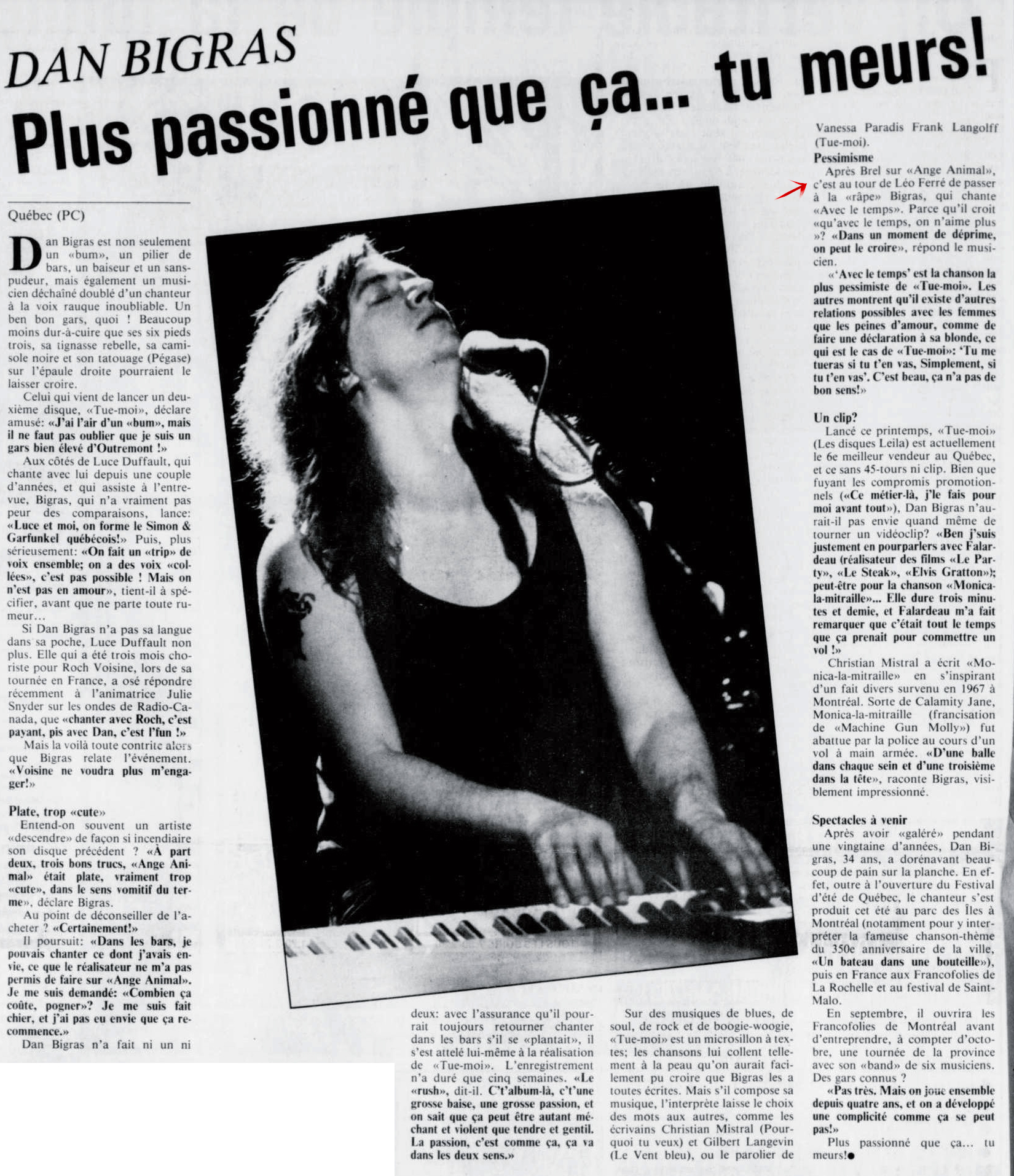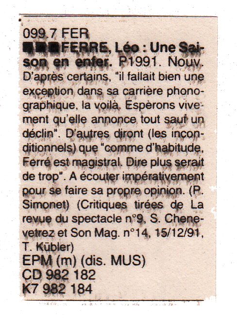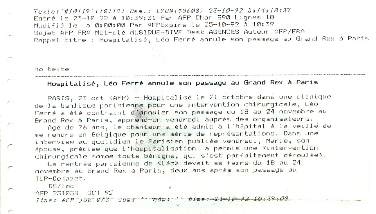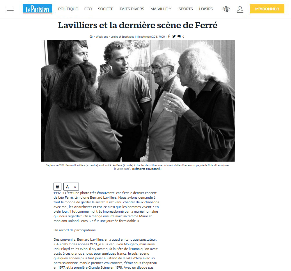 Léo et nous, c’est toute une histoire. Personnelle d’abord avec Le Flamenco de Paris, Le Bateau espagnol, Franco la muerte, Les Anarchistes… Puis professionnelle. En 1985, nous lui consacrions un premier dossier spécial dans Paroles et Musique (n° 51), photo de couverture signée Alain Marouani... Deux ans plus tard, en coédition Paroles et Musique/Seghers, nous sortions La Mémoire et le Temps, de Jacques Layani, très originale « biographie d’une œuvre » qui me valut plusieurs conversations téléphoniques nocturnes et, disons, pointues, avec Léo et Marie-Christine Ferré. À titre personnel, je garde notamment au cœur un dîner et une soirée (jusqu’à trois heures passées !) sur nos terres, en 1982, avec Léo et Marie-Christine, et… Jean Sommer (voir plus haut) qui avait fait spécialement le déplacement depuis Paris. J’entends encore Marie-Christine souffler, à juste titre, à Léo : « Demain, tu chantes à Caen, il est peut-être temps d’aller se coucher… » Mais Léo, pétant le feu, n’avait pas sommeil et ne se faisait pas prier pour pousser la chansonnette (quel souvenir !)… alors même qu’il avait donné ce soir-là un concert de plus de deux heures et demie !
