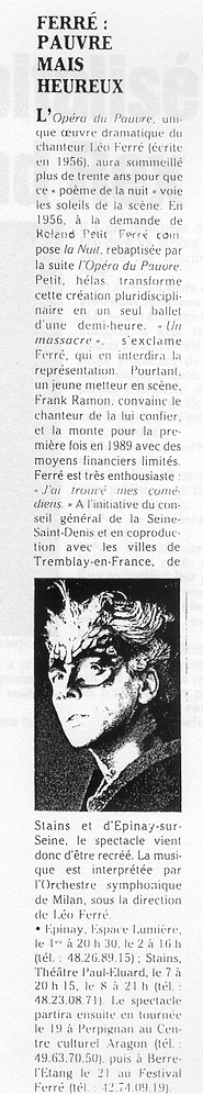 La troupe LA FAMILLE joue une oeuvre que Léo Ferré a écrite en 1956 "L'Opéra du pauvre". Interview du metteur en scène Franck Ramon et de Léo Ferré qui parle du travail de LA FAMILLE, de la vieillesse "je suis très jeune, quand je ne serai plus jeune je m'en vais...", de l'anarchie "l'anarchie c'est l'amour, la solitude...", de ses projets "je vais faire un rap".