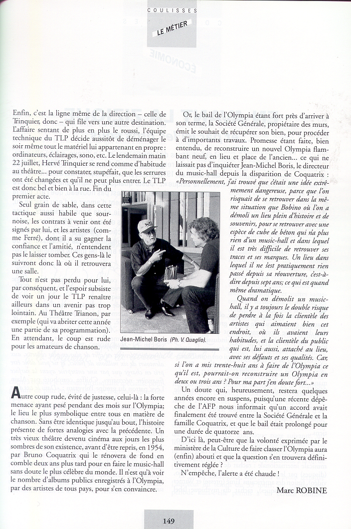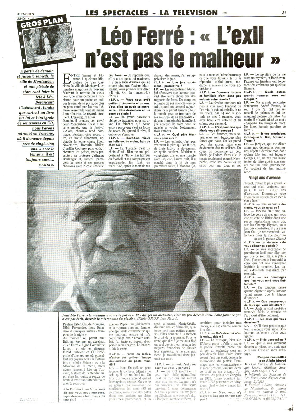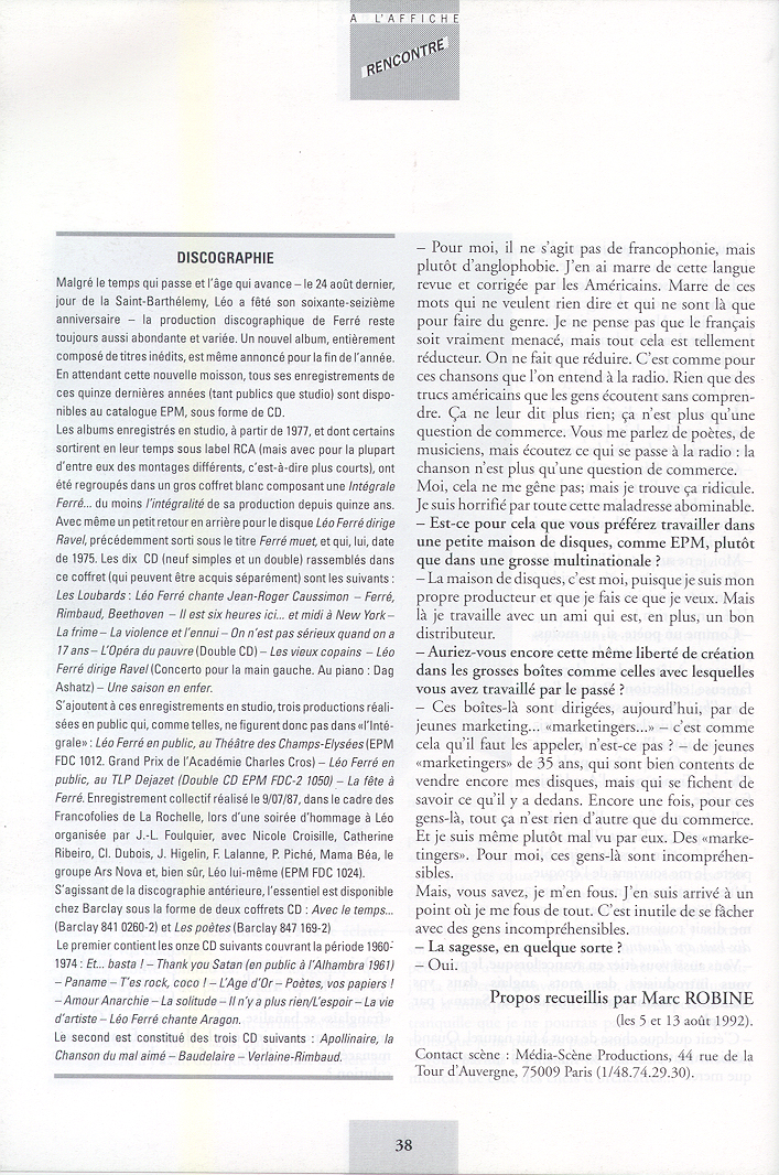 sur les multinationales du disque : « Ces boîtes-là sont dirigées aujourd’hui par des jeunes marketing… marketingers – c’est comme ça qu’il faut les appeler, n’est-ce pas ? – de jeunes marketingers de 35 ans qui sont bien contents de vendre encore mes disques, mais qui se fichent de savoir ce qu’il y a dedans… »C’est dans le Gard, au Festival de Sauve aujourd’hui disparu, où Léo devait donner un concert, que cette rencontre fut arrêtée et surtout concrétisée ; enfin, en partie, car la vie d’artiste pour l’auteur d’Avec le temps était sur le point de s’achever, sans que nul ne s’en doute. Homme fatigué, mais homme de parole, Léo Ferré proposa à Marc Robine de poursuivre l’entretien par téléphone, une fois rentré chez lui, en Toscane, aux premiers jours de septembre... Vous imaginez l’angoisse des Hidalgo qui avaient à sortir le 21 septembre, premier jour de la nouvelle saison, le premier numéro d’un nouveau journal (héritier du mensuel Paroles et Musique) dont tous les articles devaient être rendus avant la fin août !