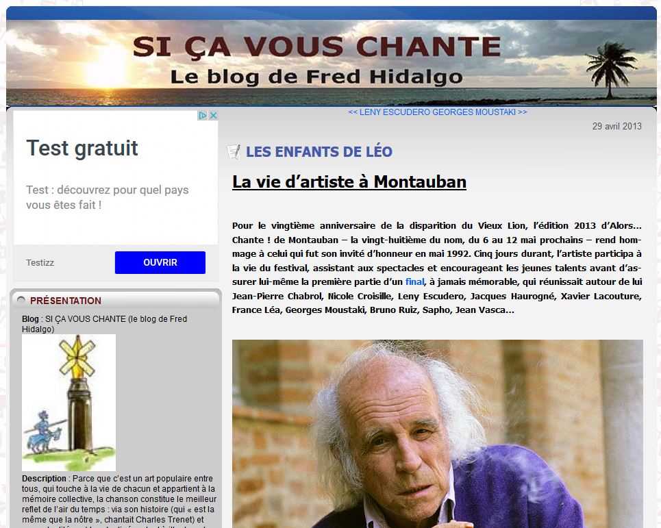 Pour le vingtième anniversaire de la disparition du Vieux Lion, l’édition 2013 d’Alors… Chante ! de Montauban – la vingt-huitième du nom, du 6 au 12 mai prochains – rend hommage à celui qui fut son invité d’honneur en mai 1992. Cinq jours durant, l’artiste participa à la vie du festival, assistant aux spectacles et encourageant les jeunes talents avant d’assurer lui-même la première partie d’un final, à jamais mémorable, qui réunissait autour de lui Jean-Pierre Chabrol, Nicole Croisille, Leny Escudero, Jacques Haurogné, Xavier Lacouture, France Léa, Georges Moustaki, Bruno Ruiz, Sapho, Jean Vasca…