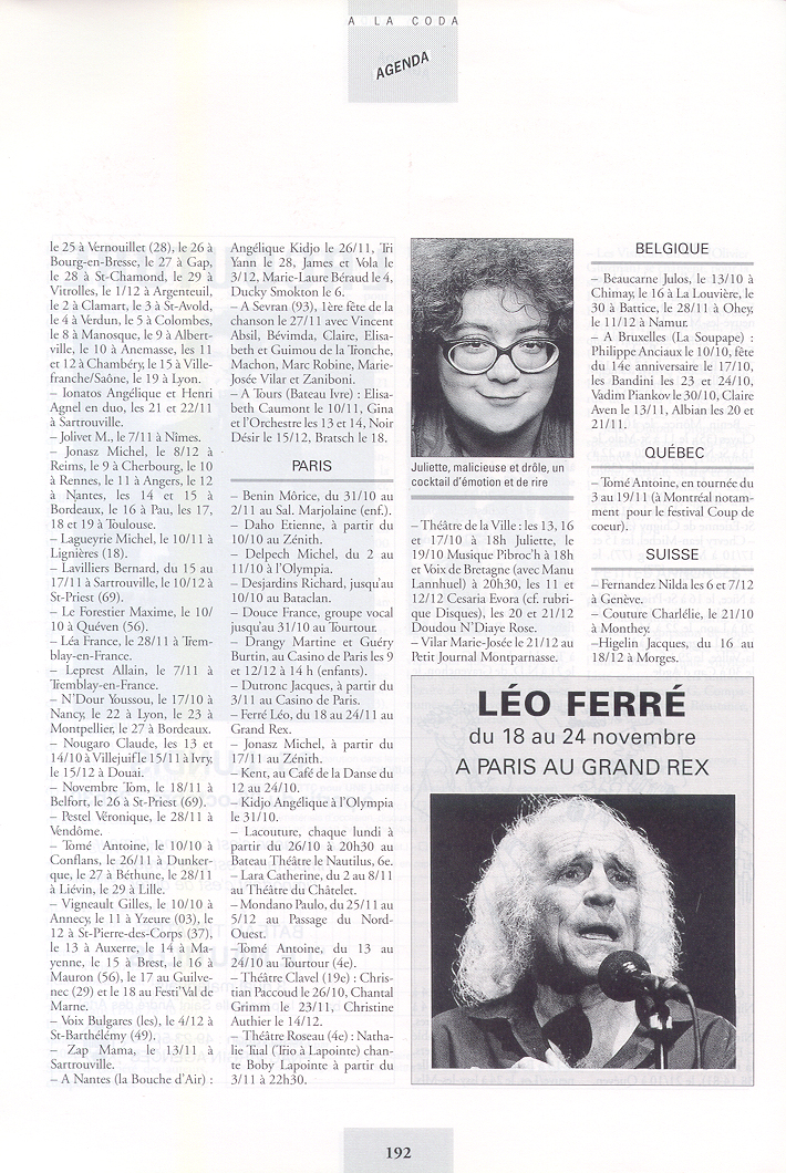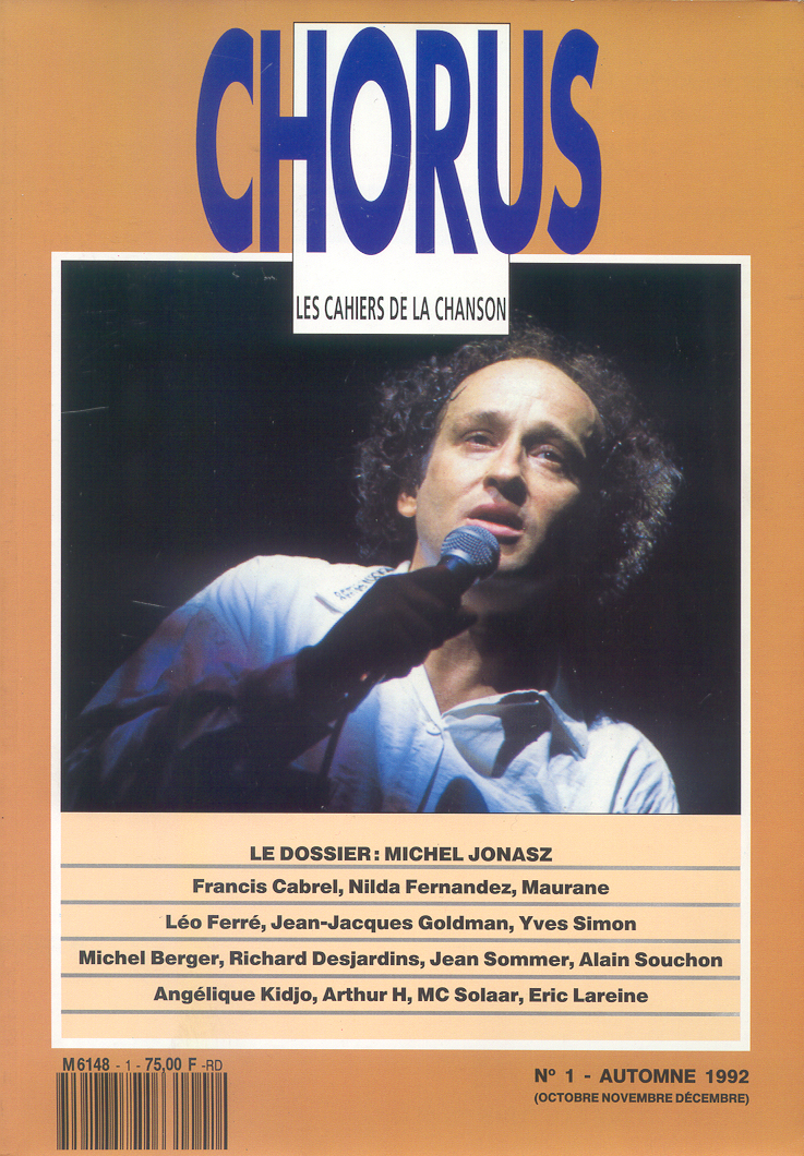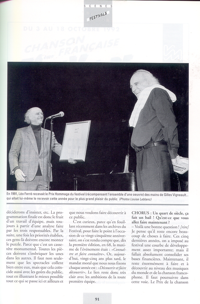 .../... Il y a exactement vingt ans, au printemps 1991, ma chère et tendre et moi planchions sur le contenu d’un numéro type de Chorus, arrêté à 196 pages, après avoir décidé que chaque édition couvrirait l’actualité chanson de l’espace francophone sous toutes ses formes et présenterait à la fois un rappel du patrimoine et un cahier entier consacré à la découverte des nouveaux talents. Nous étions encore à un an et demi de la naissance de ces « Cahiers de la chanson », mais savions déjà qu’un artiste entre tous figurerait au sommaire du n° 1, que la première « Rencontre » du premier numéro, actualité ou pas, serait réservée au Vieux Lion, à Léo the Last, au Grand Ferré.