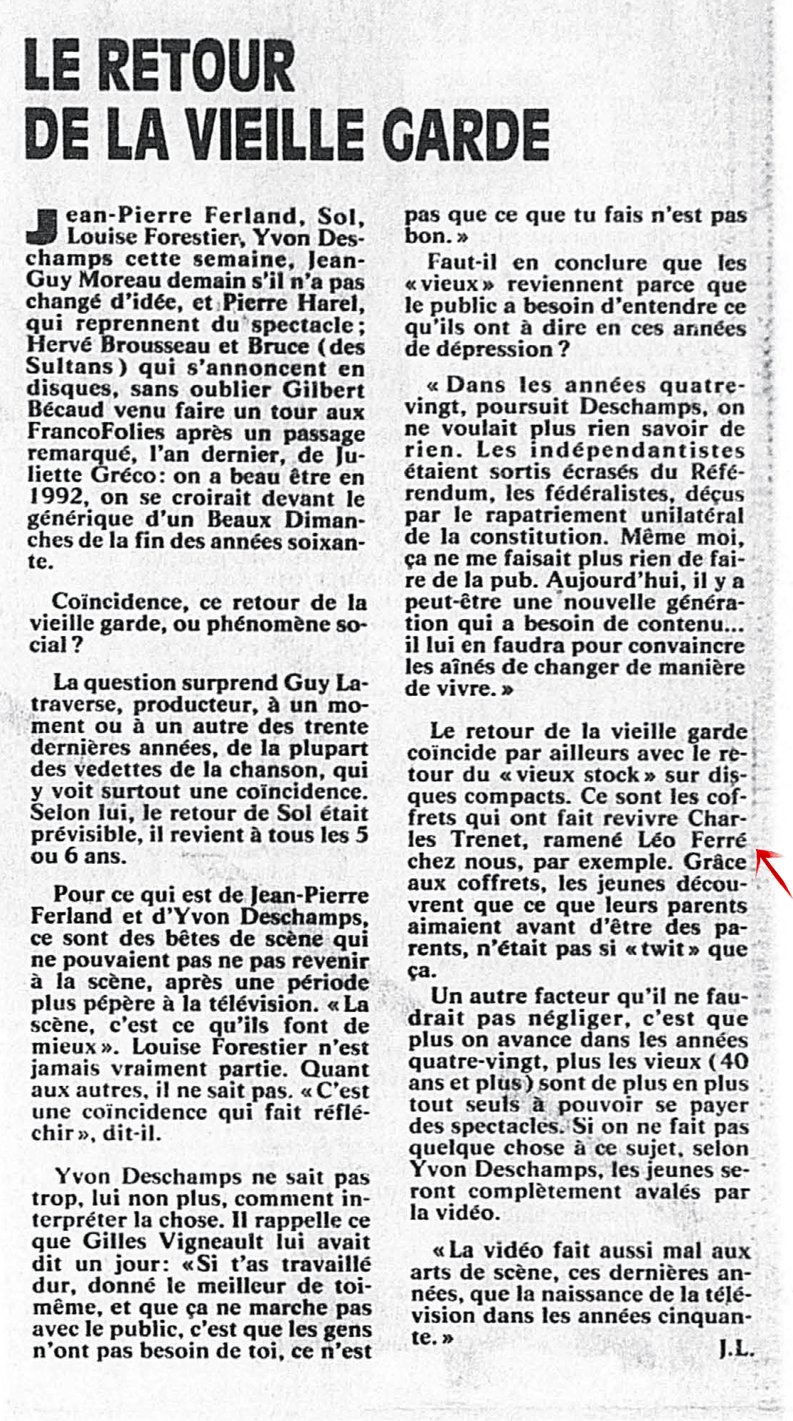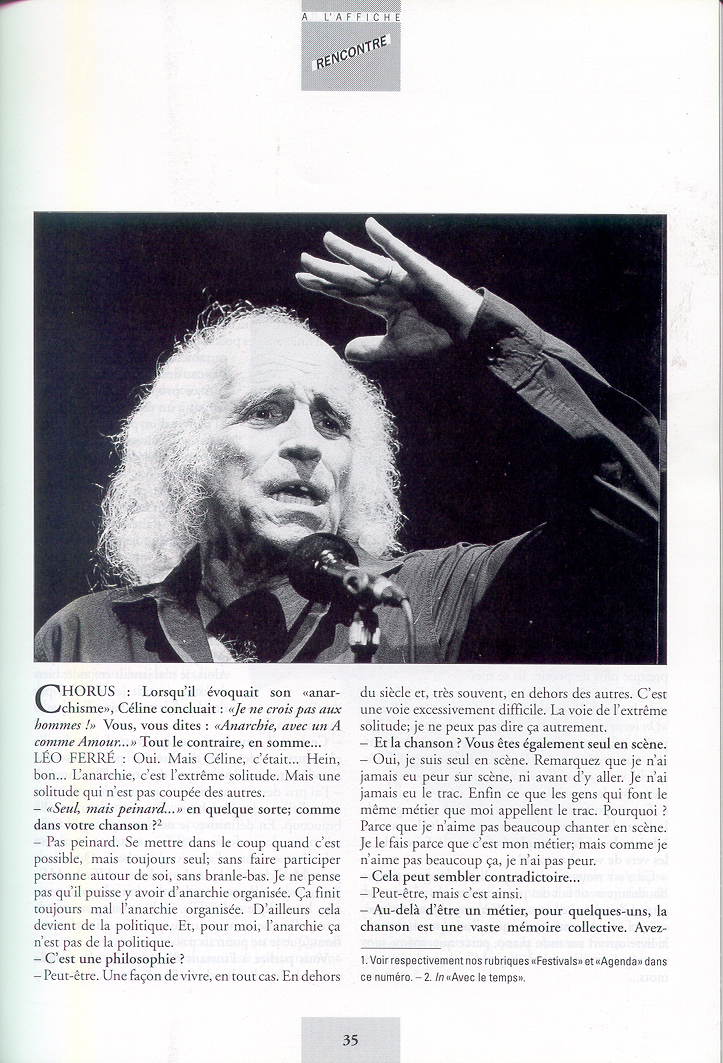 Après d’autres entretiens glanés ici et là jusqu’à la fin des années 80, le n° 4 de Chorus allait proposer un nouveau « Spécial Ferré », avec une photo de Francis Vernhet en Une. Sans qu’on puisse bien sûr l’imaginer au moment de le concevoir (tant était grande la discrétion entourant alors l’état de santé de Léo), ce numéro – sorti dans les kiosques le 21 juin 1993 – précédait d’à peine un mois sa disparition.