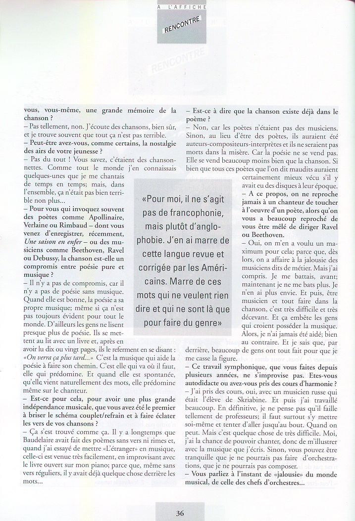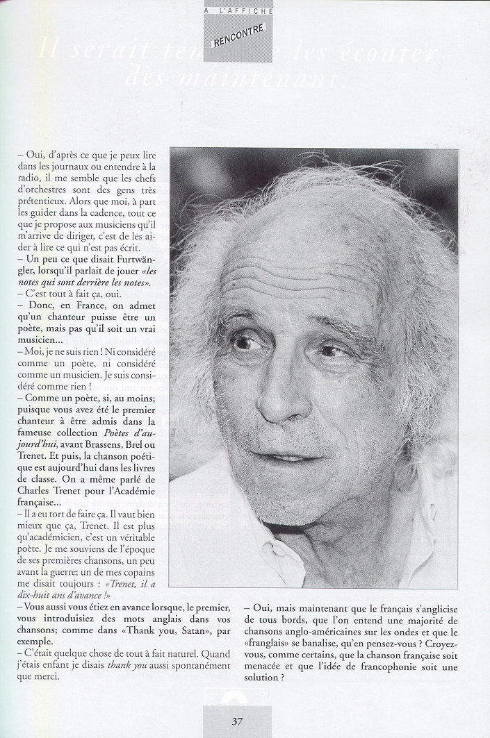 sur la programmation des médias : « Vous me parlez de poètes, de musiciens, mais écoutez ce qui passe à la radio : la chanson n’est plus qu’une question de commerce » ;