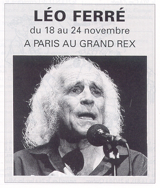 « Auteur-compositeur-interprète majeur, écrivais-je en chapeau de cet hommage, et formidable interprète de chansons qui l’ont fait jouer le “troisième homme” – le premier et le dernier des trois – aux côtés de Brel et de Brassens, Léo Ferré a aussi été un poète et un musicien exceptionnels. Un créateur “total” au bout du compte, à la fois Rimbaud et Debussy, Beethoven et Verlaine, Baudelaire et Ravel. […] Entre ses débuts en piano-solo au Quartier latin et ses dernières tournées, à nouveau seul (“mais peinard” et terriblement charismatique – comme on peut le voir dans la vidéo du Printemps des poètes jointe à ce sujet), Léo a conduit la chanson dans la cinquième dimension. Au-delà des paroles, de la musique, des arrangements et de l’interprétation. Avec ses textes de révolte et d’espoir (“Je provoque à l’amour et à l’insurrection”), ses mélodies inoubliables, ses envolées musicales ou poétiques somptueuses, avec sa voix bien sûr (cette voix si chère à notre cœur dont l’inflexion jamais ne se taira), Léo Ferré a ouvert la chanson à l’Anarchie. Son grand œuvre d’homme de la Renaissance, innovateur, moderne et classique à la fois. L’œuvre de toute une vie. C’est dire si elle est digne d’Amour. »