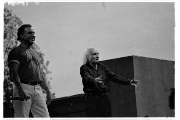 1992. « C'est une photo très émouvante, car c'est le dernier concert de Léo Ferré, témoigne Bernard Lavilliers. Nous avions demandé à tout le monde de garder le secret. Il est venu chanter deux chansons avec moi, les Anarchistes et Est-ce ainsi que les hommes vivent ? En plein jour, il fut comme moi très impressionné par la marée humaine qui nous regardait. On a mangé ensuite avec sa femme Marie et mon ami Roland Leroy. Ce fut une journée formidable. »