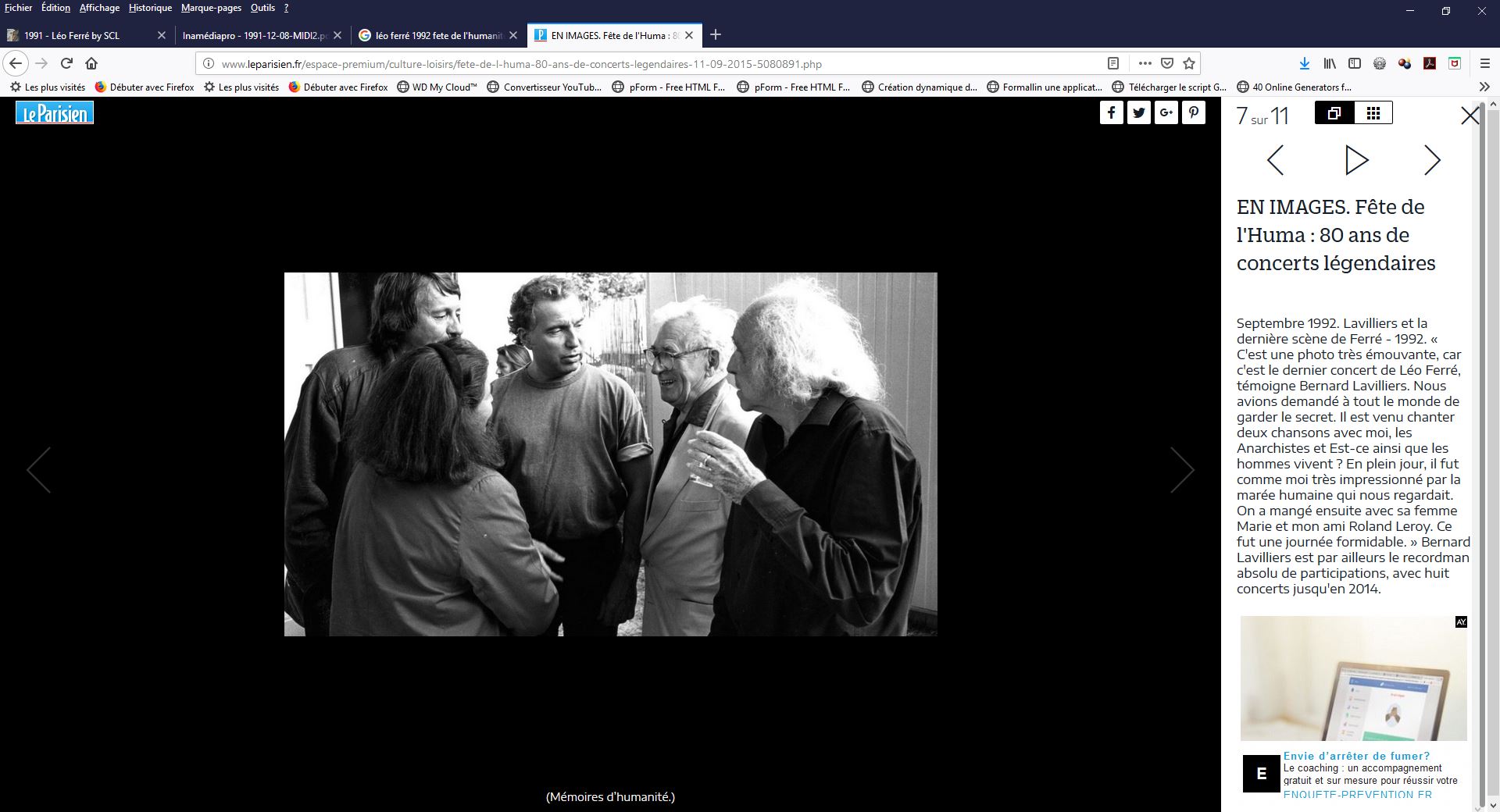 Septembre 1992. Lavilliers et la dernière scène de Ferré - 1992. « C'est une photo très émouvante, car c'est le dernier concert de Léo Ferré, témoigne Bernard Lavilliers. Nous avions demandé à tout le monde de garder le secret. Il est venu chanter deux chansons avec moi, les Anarchistes et Est-ce ainsi que les hommes vivent ? En plein jour, il fut comme moi très impressionné par la marée humaine qui nous regardait. On a mangé ensuite avec sa femme Marie et mon ami Roland Leroy. Ce fut une journée formidable. » Bernard Lavilliers est par ailleurs le recordman absolu de participations, avec huit concerts jusqu'en 2014.