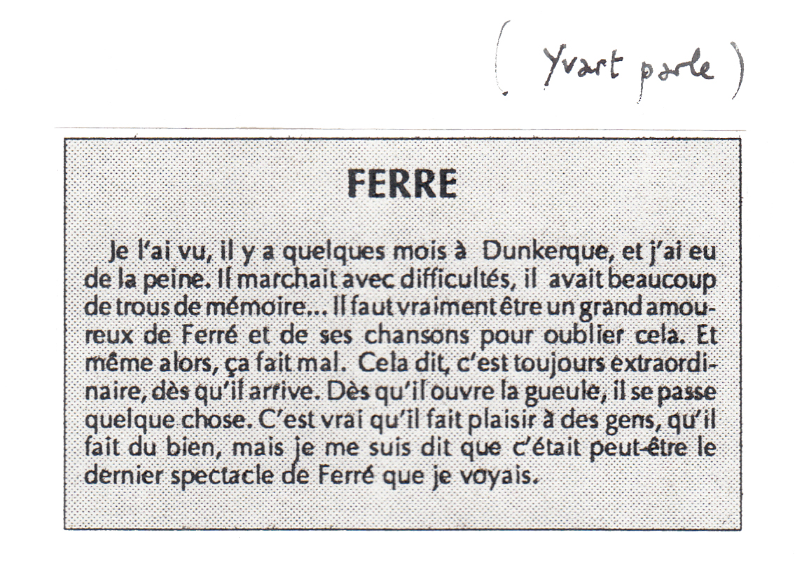 « Ses chansons se sont d'abord promenées dans la tête des gens via ses interprètes: Edith Piaf, Juliette Gréco, Catherine Sauvage. Ferré était resté dans la tradition de la femme inspiratrice, de la muse, d'où un certain décalage avec l'époque. D'ailleurs, au moment de Mai 68, il était dans le Lot à régler ses histoires avec sa femme Madeleine. Quand il a été sacré demi-dieu de Mai 68 à la Mutualité, c'était plutôt un concours de circonstances. Ses chansons de révolte, que les gens prennent pour de la pop révolutionnaire, sont nées de conflits personnels ? Son moteur était la contradiction. Il se disait proche de Proudhon et, en même temps, la propriété avait un sens pour lui: elle garantissait sa solitude. Ça lui convenait de manipuler son public seul sur scène. C'est pour cela qu'il n'a jamais pu faire oeuvre collective. Il considérait l'anarchie comme l'aristocratie de la solitude. Une façon d'envisager l'existence avec panache, avec noblesse. Comme disait Rimbaud : "Par délicatesse, j'ai perdu ma vie." »