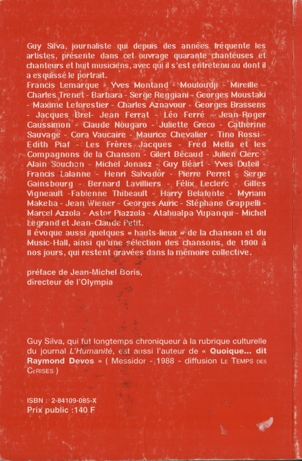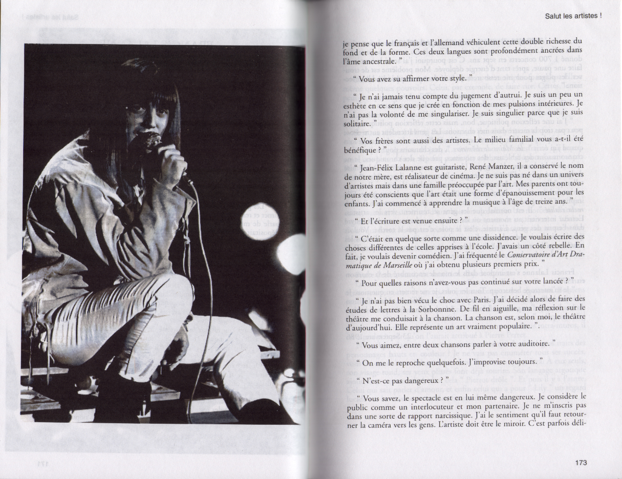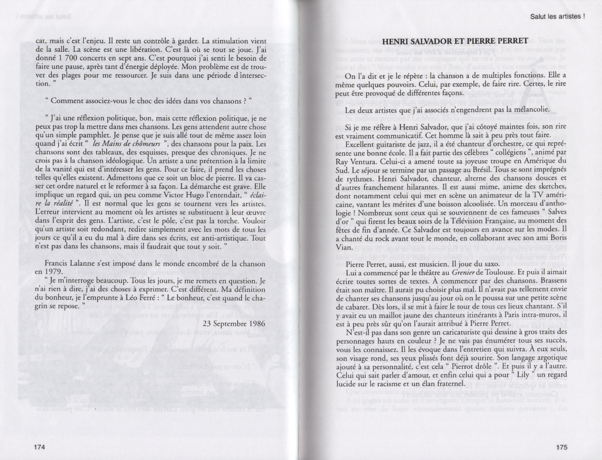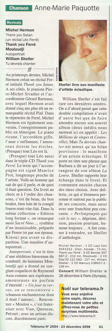 01.12 : Interview en plateau de l'animateur Pascal Sevran au sujet de la "bonne santé" de la chanson française et de son nouveau disque "Viva la vida". - " Dans les années 1950, c'était bien meilleur que de nos jours ; avec la réédition de ces vieilles chansons, on a là un peu de l'âme française... Les gens ne prennent pas des vessies pour des lanternes en France, Paris ne commande pas tout... Les sociétés d'édition françaises sont tenues par des mains étrangères... Il faut arrêter la querelle des anciens et des modernes... Je reçois aussi les Boys Band, car ce n'est pas déshonorant ; on peut aussi bien aimer Léo Ferré et les Boys Band ".