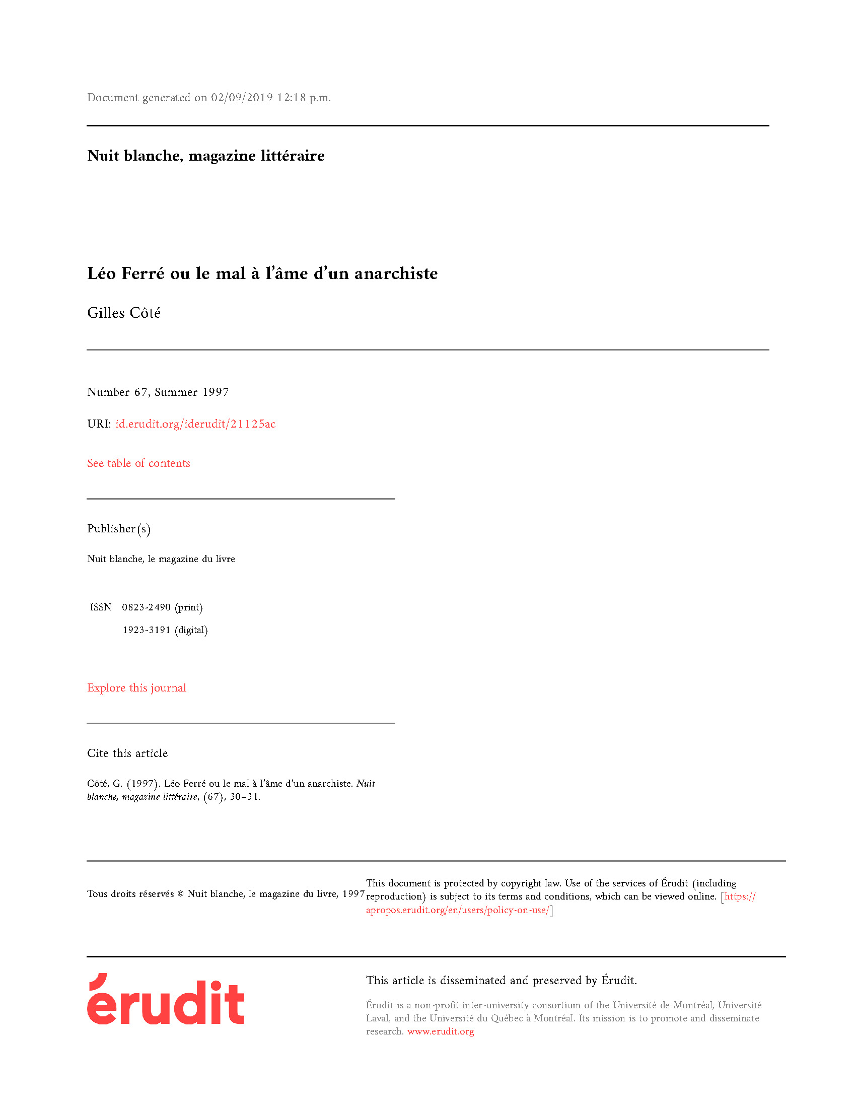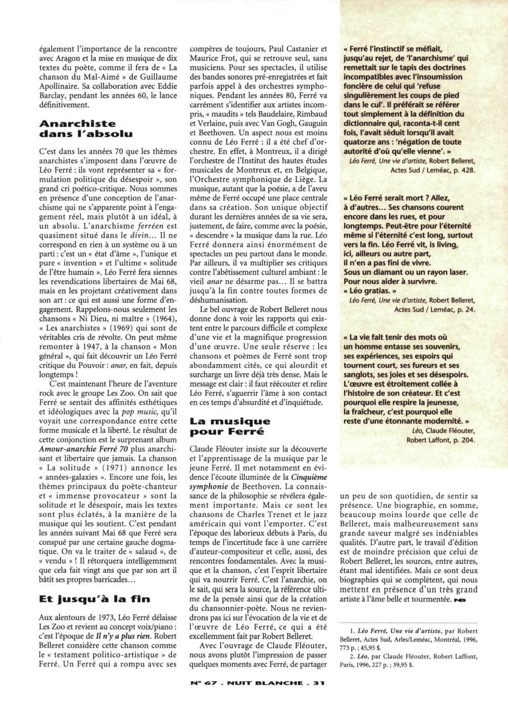Nuit blanche, magazine littéraire, n°67, été 1997
