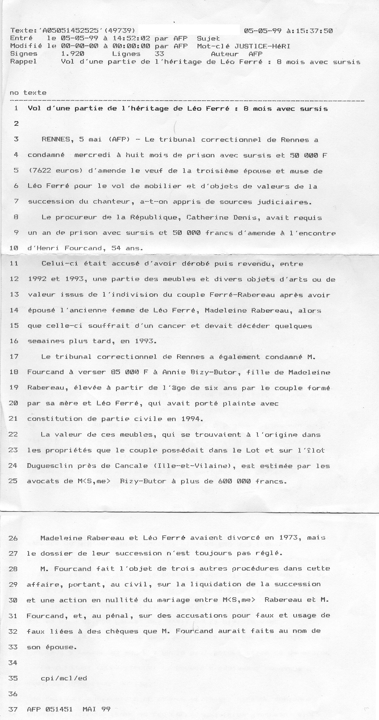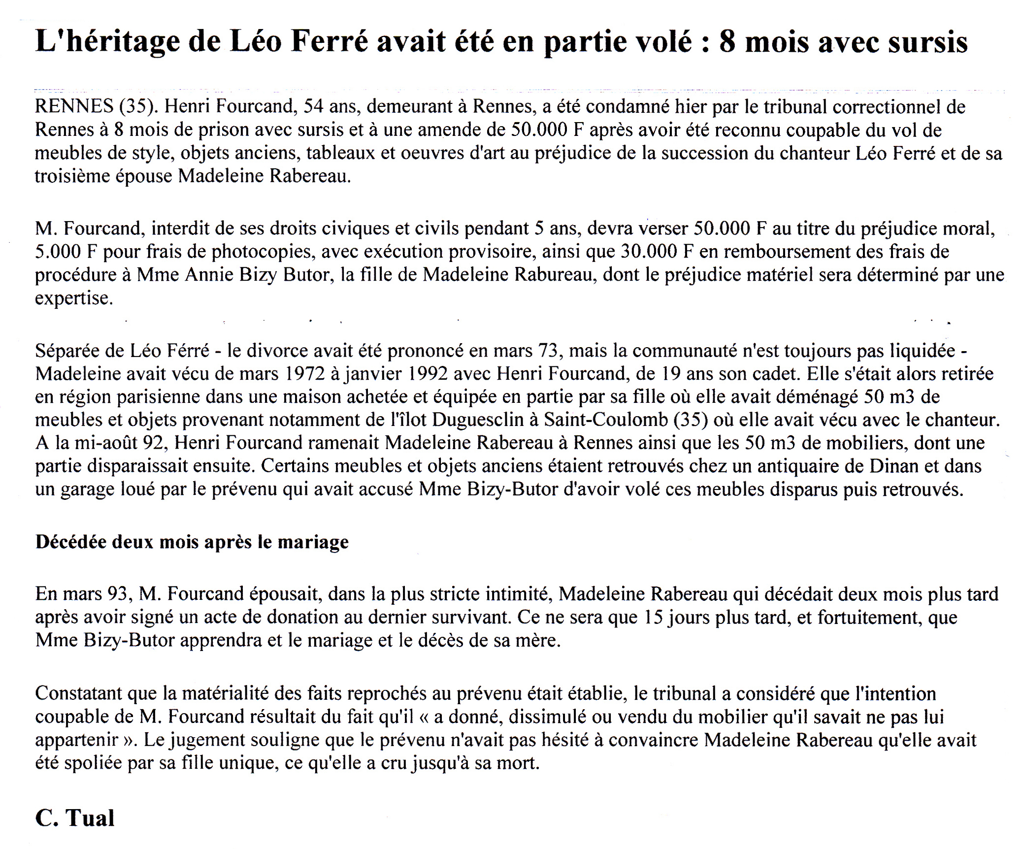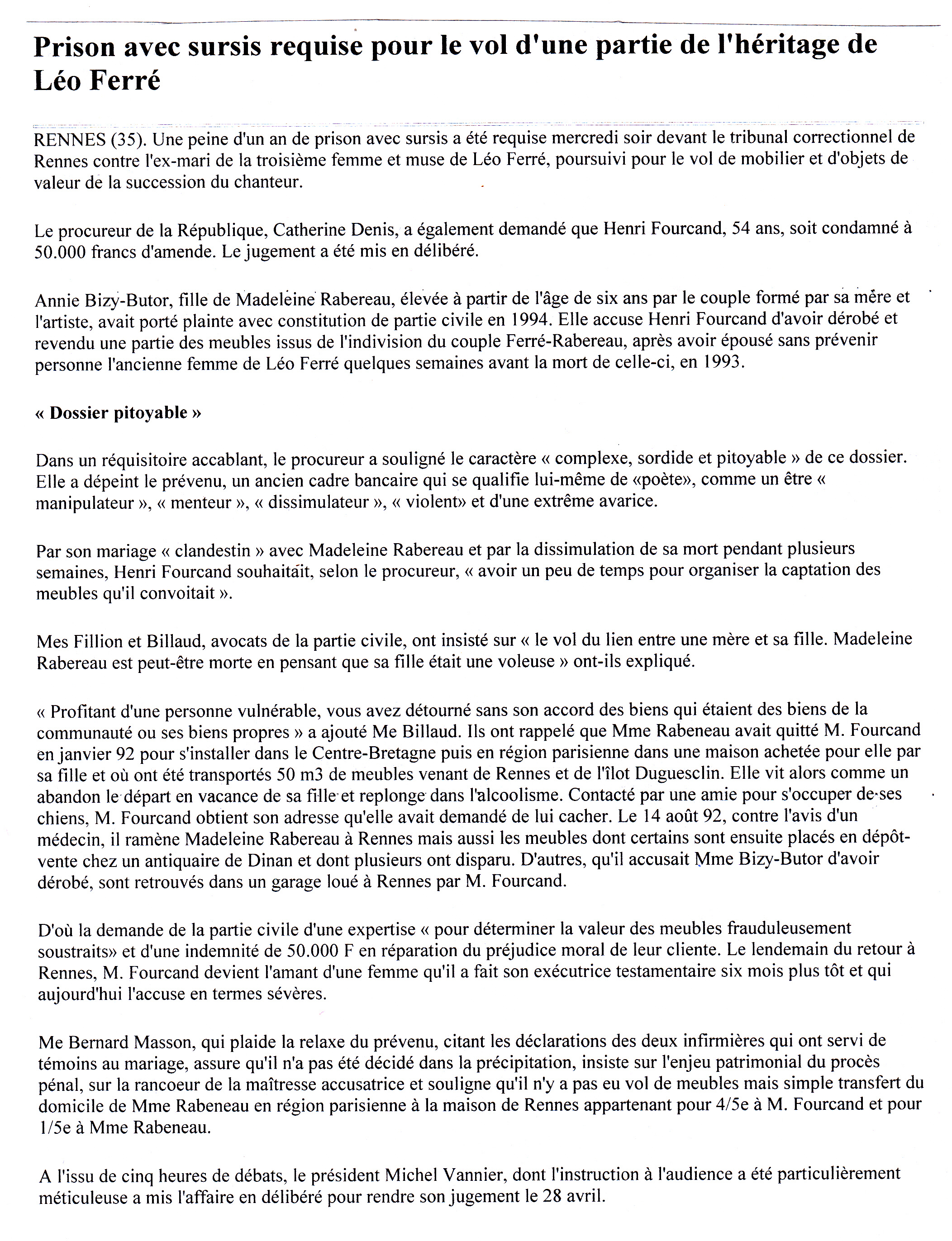 • Vol d'une partie de l'héritage de Léo Ferré : 8 mois avec sursis