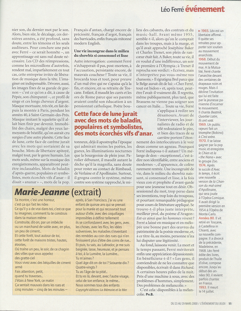 • Léo Ferré, France Inter, "Pollen " de 21 h à 23 h par Caroline Bonnefond