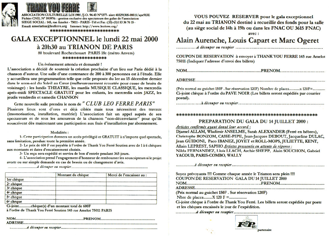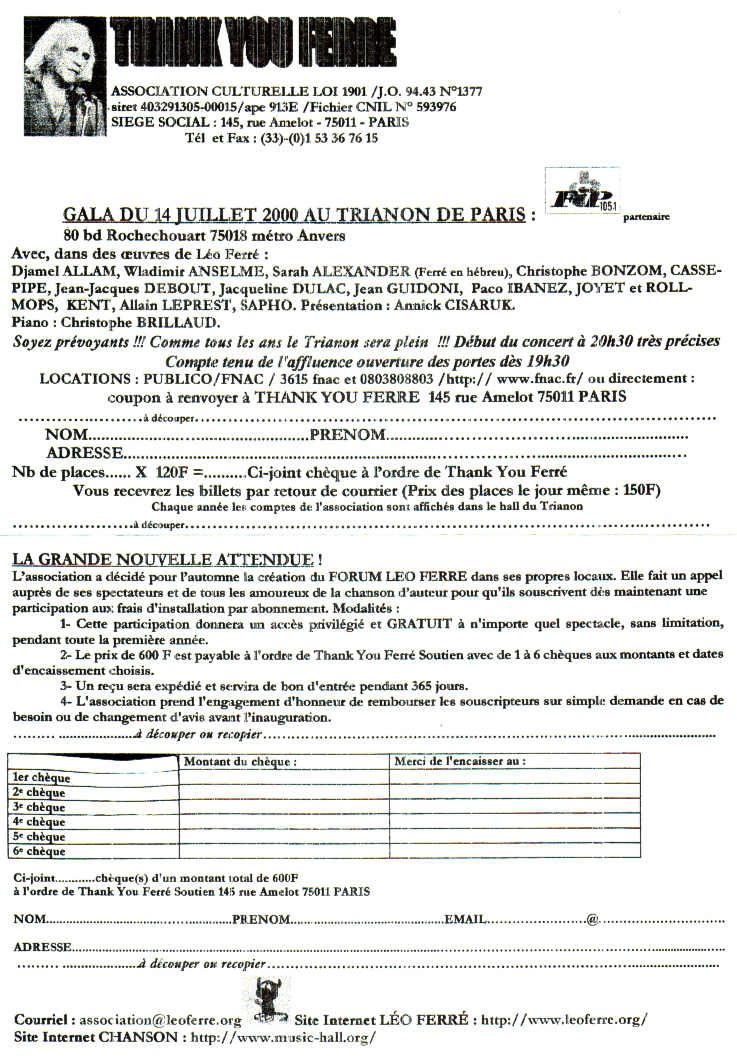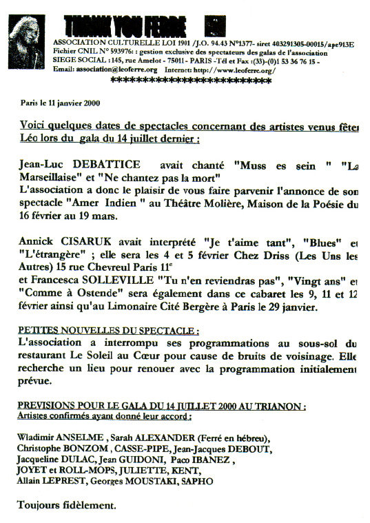 Divers courriers de l'association Thank you Ferré du 14/07/2000