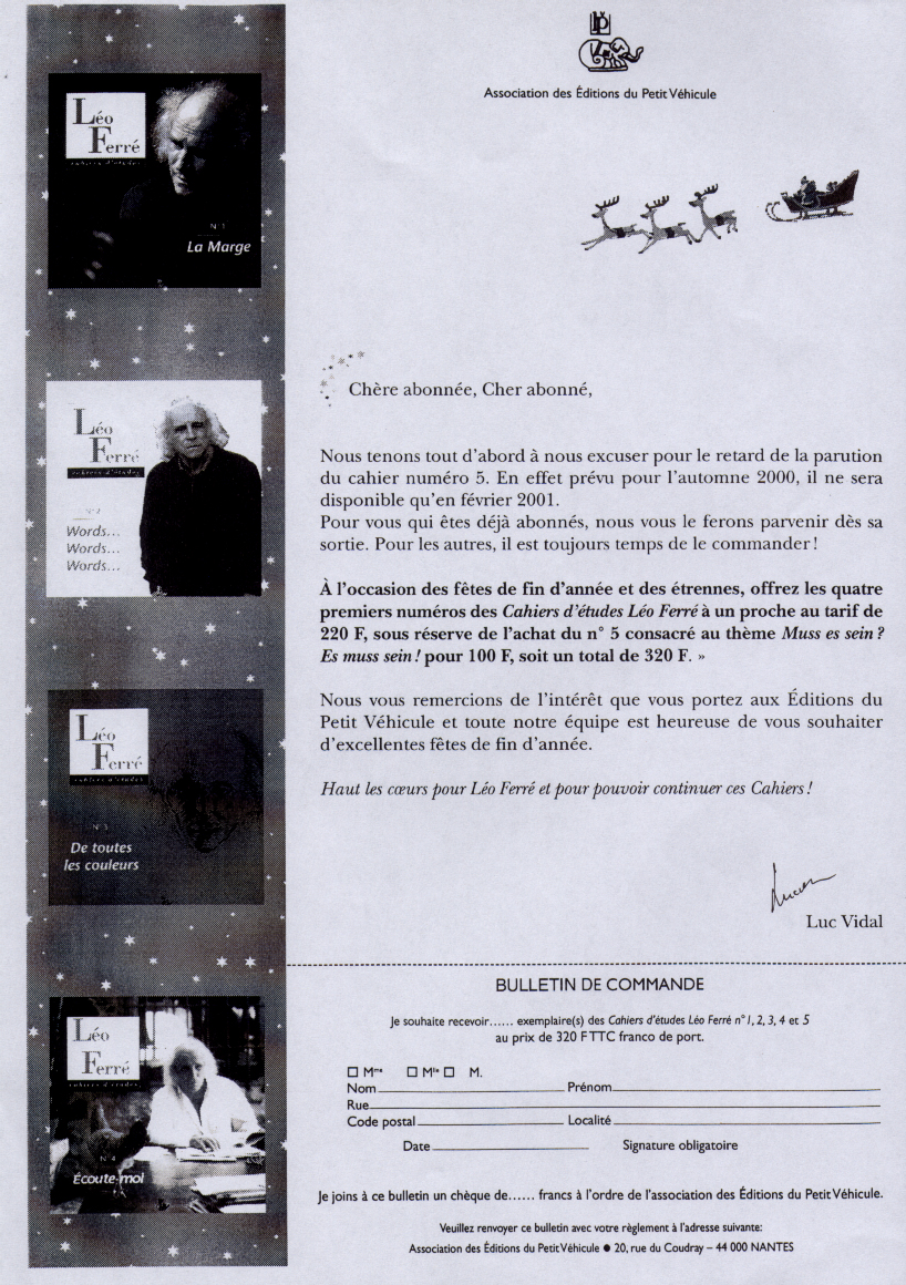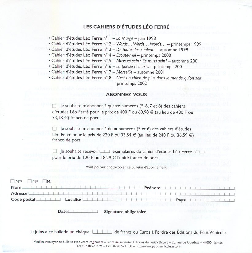 Bulletin de commande des Cahiers d'étude Léo Ferré