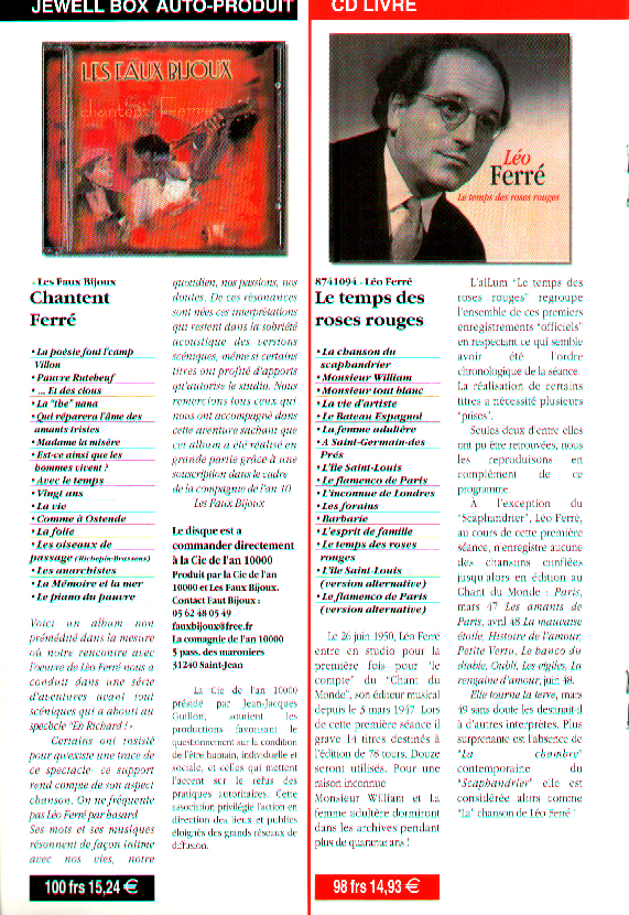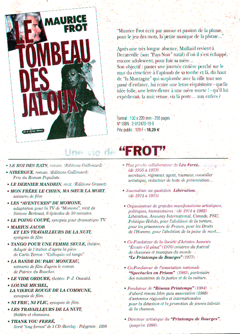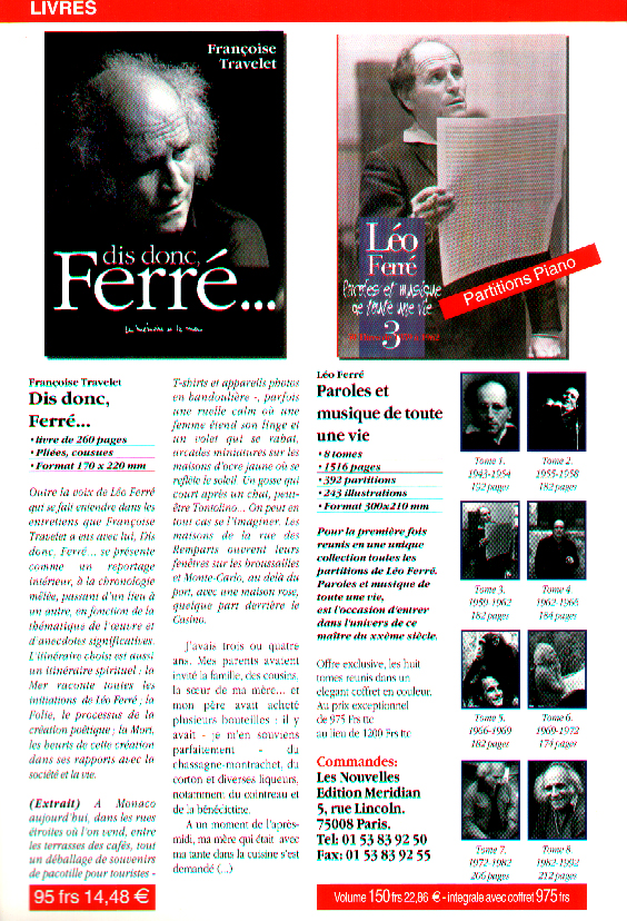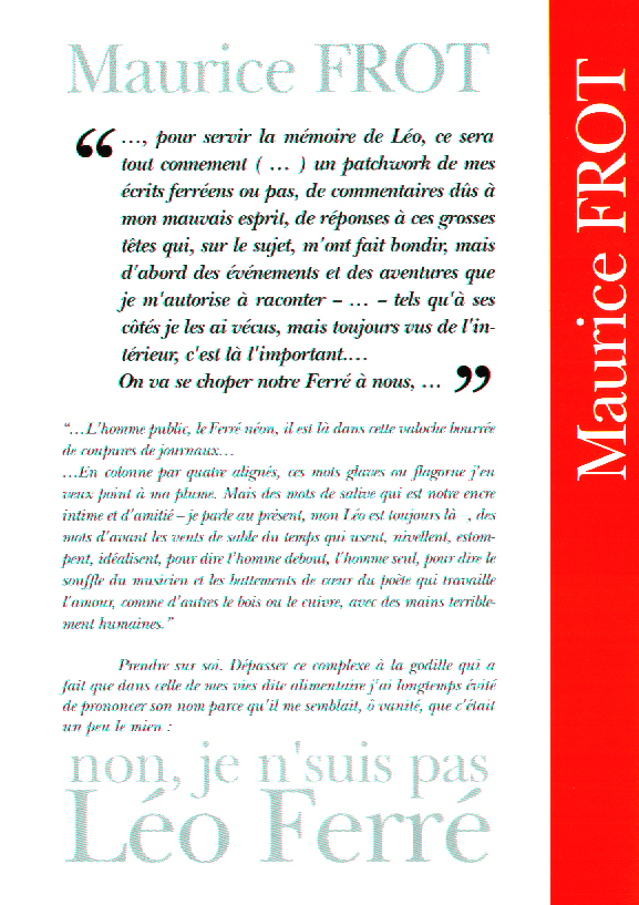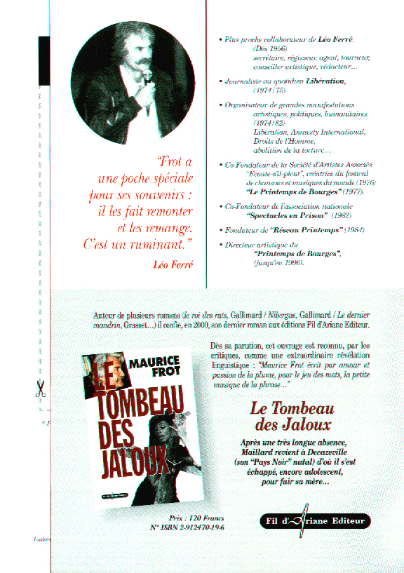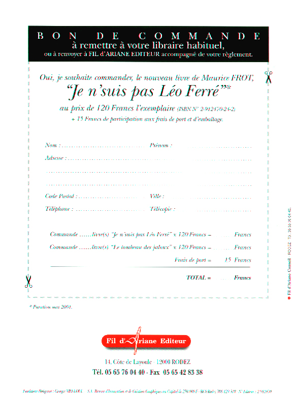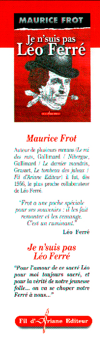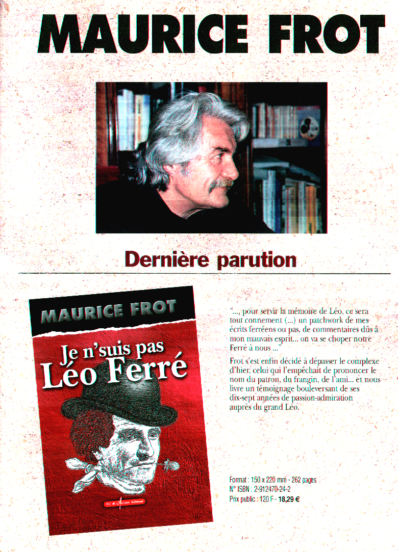 Publicité de Fil d'Ariane Éditeur du 01/05/2001 pour le livre "Je n'suis pas Léo Ferré" de Maurice Frot
