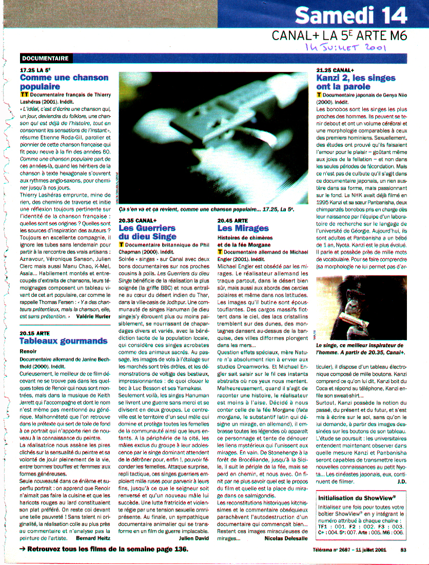 France 2 émission "Envoyé spécial du 14/06/2001, notice descriptive